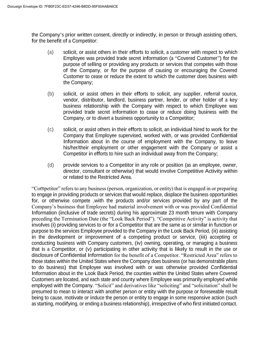 the Company’s prior written consent, directly or indirectly, in person or through assisting others, for the benefit of a Competitor: (a) solicit, or assist others in their efforts to solicit, a customer with respect to which Employee was provided trade secret information (a “Covered Customer”) for the purpose of selling or providing any products or services that competes with those of the Company, or for the purpose of causing or encouraging the Covered Customer to cease or reduce the extent to which the customer does business with the Company; (b) solicit, or assist others in their efforts to solicit, any supplier, referral source, vendor, distributor, landlord, business partner, lender, or other holder of a key business relationship with the Company with respect to which Employee was provided trade secret information to cease or reduce doing business with the Company, or to divert a business opportunity to a Competitor; (c) solicit, or assist others in their efforts to solicit, an individual hired to work for the Company that Employee supervised, worked with, or was provided Confidential Information about in the course of employment with the Company, to leave his/her/their employment or other engagement with the Company or assist a Competitor in efforts to hire such an individual away from the Company; (d) provide services to a Competitor in any role or position (as an employee, owner, director, consultant or otherwise) that would involve Competitive Activity within or related to the Restricted Area. “Competitor” refers to any business (person, organization, or entity) that is engaged in or preparing to engage in providing products or services that would replace, displace the business opportunities for, or otherwise compete ,with the products and/or services provided by any part of the Company’s business that Employee had material involvement with or was provided Confidential Information (inclusive of trade secrets) during his approximate 23 month tenure with Company preceding the Termination Date (the “Look Back Period”). “Competitive Activity” is activity that involves (i) providing services to or for a Competitor that are the same as or similar in function or purpose to the services Employee provided to the Company in the Look Back Period, (ii) assisting in the development or improvement of a competing product or service, (iii) accepting or conducting business with Company customers, (iv) owning, operating, or managing a business that is a Competitor, or (v) participating in other activity that is likely to result in the use or disclosure of Confidential Information for the benefit of a Competitor. “Restricted Area” refers to those states within the United States where the Company does business (or has demonstrable plans to do business) that Employee was involved with or was otherwise provided Confidential Information about in the Look Back Period, the counties within the United States where Covered Customers are located, and each state and county where Employee was primarily employed while employed with the Company. “Solicit” and derivatives like “soliciting” and “solicitation” shall be presumed to mean to interact with another person or entity with the purpose or foreseeable result being to cause, motivate or induce the person or entity to engage in some responsive action (such as starting, modifying, or ending a business relationship), irrespective of who first initiated contact. Docusign Envelope ID: 7FB0F23C-ED37-4246-B8DD-95F00AABA6CE