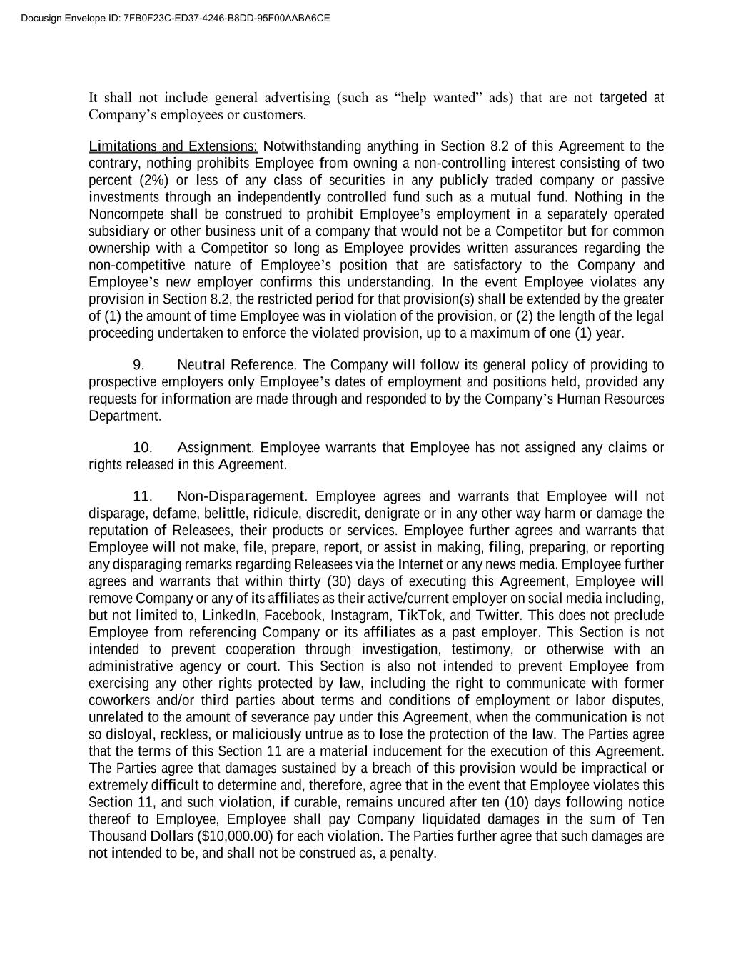 It shall not include general advertising (such as “help wanted” ads) that are not targeted at Company’s employees or customers. Limitations and Extensions: Notwithstanding anything in Section 8.2 of this Agreement to the contrary, nothing prohibits Employee from owning a non-controlling interest consisting of two percent (2%) or less of any class of securities in any publicly traded company or passive investments through an independently controlled fund such as a mutual fund. Nothing in the Noncompete shall be construed to prohibit Employee’s employment in a separately operated subsidiary or other business unit of a company that would not be a Competitor but for common ownership with a Competitor so long as Employee provides written assurances regarding the non­competitive nature of Employee’s position that are satisfactory to the Company and Employee’s new employer confirms this understanding. In the event Employee violates any provision in Section 8.2, the restricted period for that provision(s) shall be extended by the greater of (1) the amount of time Employee was in violation of the provision, or (2) the length of the legal proceeding undertaken to enforce the violated provision, up to a maximum of one (1) year. 9. Neutral Reference. The Company will follow its general policy of providing to prospective employers only Employee’s dates of employment and positions held, provided any requests for information are made through and responded to by the Company’s Human Resources Department. 10. Assignment. Employee warrants that Employee has not assigned any claims or rights released in this Agreement. 11. Non-Disparagement. Employee agrees and warrants that Employee will not disparage, defame, belittle, ridicule, discredit, denigrate or in any other way harm or damage the reputation of Releasees, their products or services. Employee further agrees and warrants that Employee will not make, file, prepare, report, or assist in making, filing, preparing, or reporting any disparaging remarks regarding Releasees via the Internet or any news media. Employee further agrees and warrants that within thirty (30) days of executing this Agreement, Employee will remove Company or any of its affiliates as their active/current employer on social media including, but not limited to, LinkedIn, Facebook, Instagram, TikTok, and Twitter. This does not preclude Employee from referencing Company or its affiliates as a past employer. This Section is not intended to prevent cooperation through investigation, testimony, or otherwise with an administrative agency or court. This Section is also not intended to prevent Employee from exercising any other rights protected by law, including the right to communicate with former coworkers and/or third parties about terms and conditions of employment or labor disputes, unrelated to the amount of severance pay under this Agreement, when the communication is not so disloyal, reckless, or maliciously untrue as to lose the protection of the law. The Parties agree that the terms of this Section 11 are a material inducement for the execution of this Agreement. The Parties agree that damages sustained by a breach of this provision would be impractical or extremely difficult to determine and, therefore, agree that in the event that Employee violates this Section 11, and such violation, if curable, remains uncured after ten (10) days following notice thereof to Employee, Employee shall pay Company liquidated damages in the sum of Ten Thousand Dollars ($10,000.00) for each violation. The Parties further agree that such damages are not intended to be, and shall not be construed as, a penalty. Docusign Envelope ID: 7FB0F23C-ED37-4246-B8DD-95F00AABA6CE