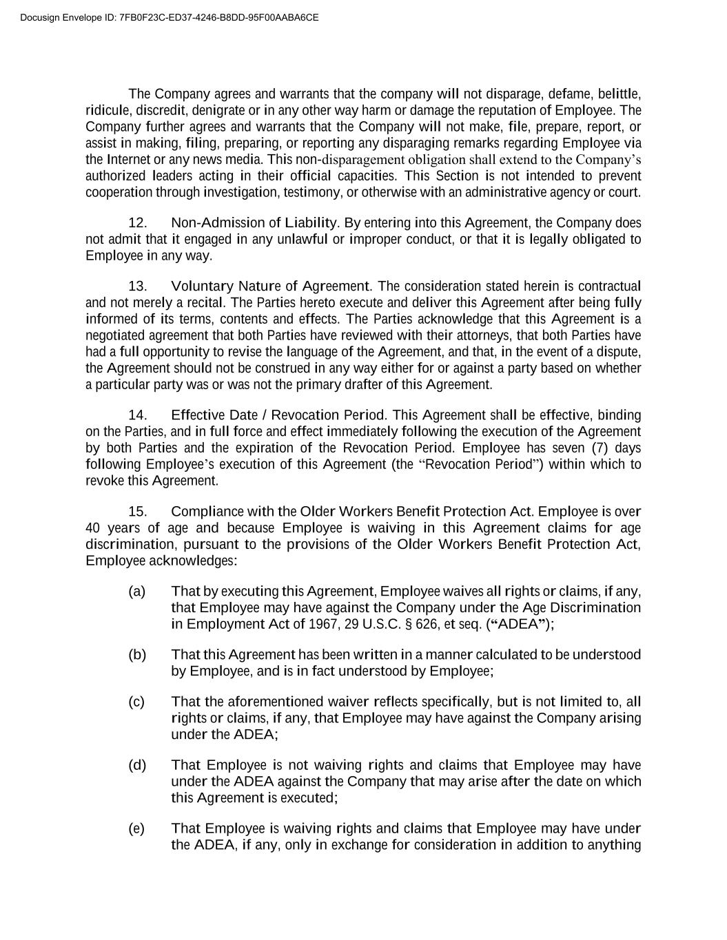 The Company agrees and warrants that the company will not disparage, defame, belittle, ridicule, discredit, denigrate or in any other way harm or damage the reputation of Employee. The Company further agrees and warrants that the Company will not make, file, prepare, report, or assist in making, filing, preparing, or reporting any disparaging remarks regarding Employee via the Internet or any news media. This non-disparagement obligation shall extend to the Company’s authorized leaders acting in their official capacities. This Section is not intended to prevent cooperation through investigation, testimony, or otherwise with an administrative agency or court. 12. Non-Admission of Liability. By entering into this Agreement, the Company does not admit that it engaged in any unlawful or improper conduct, or that it is legally obligated to Employee in any way. 13. Voluntary Nature of Agreement. The consideration stated herein is contractual and not merely a recital. The Parties hereto execute and deliver this Agreement after being fully informed of its terms, contents and effects. The Parties acknowledge that this Agreement is a negotiated agreement that both Parties have reviewed with their attorneys, that both Parties have had a full opportunity to revise the language of the Agreement, and that, in the event of a dispute, the Agreement should not be construed in any way either for or against a party based on whether a particular party was or was not the primary drafter of this Agreement. 14. Effective Date / Revocation Period. This Agreement shall be effective, binding on the Parties, and in full force and effect immediately following the execution of the Agreement by both Parties and the expiration of the Revocation Period. Employee has seven (7) days following Employee’s execution of this Agreement (the “Revocation Period”) within which to revoke this Agreement. 15. Compliance with the Older Workers Benefit Protection Act. Employee is over 40 years of age and because Employee is waiving in this Agreement claims for age discrimination, pursuant to the provisions of the Older Workers Benefit Protection Act, Employee acknowledges: (a) That by executing this Agreement, Employee waives all rights or claims, if any, that Employee may have against the Company under the Age Discrimination in Employment Act of 1967, 29 U.S.C. § 626, et seq. (“ADEA”); (b) That this Agreement has been written in a manner calculated to be understood by Employee, and is in fact understood by Employee; (c) That the aforementioned waiver reflects specifically, but is not limited to, all rights or claims, if any, that Employee may have against the Company arising under the ADEA; (d) That Employee is not waiving rights and claims that Employee may have under the ADEA against the Company that may arise after the date on which this Agreement is executed; (e) That Employee is waiving rights and claims that Employee may have under the ADEA, if any, only in exchange for consideration in addition to anything Docusign Envelope ID: 7FB0F23C-ED37-4246-B8DD-95F00AABA6CE