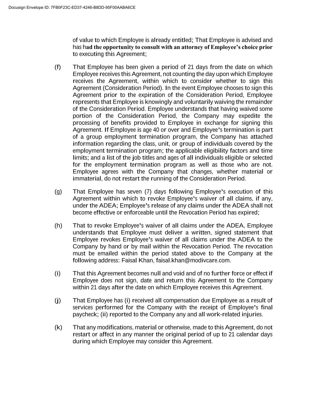 of value to which Employee is already entitled; That Employee is advised and has had the opportunity to consult with an attorney of Employee’s choice prior to executing this Agreement; (f) That Employee has been given a period of 21 days from the date on which Employee receives this Agreement, not counting the day upon which Employee receives the Agreement, within which to consider whether to sign this Agreement (Consideration Period). In the event Employee chooses to sign this Agreement prior to the expiration of the Consideration Period, Employee represents that Employee is knowingly and voluntarily waiving the remainder of the Consideration Period. Employee understands that having waived some portion of the Consideration Period, the Company may expedite the processing of benefits provided to Employee in exchange for signing this Agreement. If Employee is age 40 or over and Employee’s termination is part of a group employment termination program, the Company has attached information regarding the class, unit, or group of individuals covered by the employment termination program; the applicable eligibility factors and time limits; and a list of the job titles and ages of all individuals eligible or selected for the employment termination program as well as those who are not. Employee agrees with the Company that changes, whether material or immaterial, do not restart the running of the Consideration Period. (g) That Employee has seven (7) days following Employee’s execution of this Agreement within which to revoke Employee’s waiver of all claims, if any, under the ADEA; Employee’s release of any claims under the ADEA shall not become effective or enforceable until the Revocation Period has expired; (h) That to revoke Employee’s waiver of all claims under the ADEA, Employee understands that Employee must deliver a written, signed statement that Employee revokes Employee’s waiver of all claims under the ADEA to the Company by hand or by mail within the Revocation Period. The revocation must be emailed within the period stated above to the Company at the following address: Faisal Khan, faisal.khan@modivcare.com. (i) That this Agreement becomes null and void and of no further force or effect if Employee does not sign, date and return this Agreement to the Company within 21 days after the date on which Employee receives this Agreement. (j) That Employee has (i) received all compensation due Employee as a result of services performed for the Company with the receipt of Employee’s final paycheck; (ii) reported to the Company any and all work-related injuries. (k) That any modifications, material or otherwise, made to this Agreement, do not restart or affect in any manner the original period of up to 21 calendar days during which Employee may consider this Agreement. Docusign Envelope ID: 7FB0F23C-ED37-4246-B8DD-95F00AABA6CE