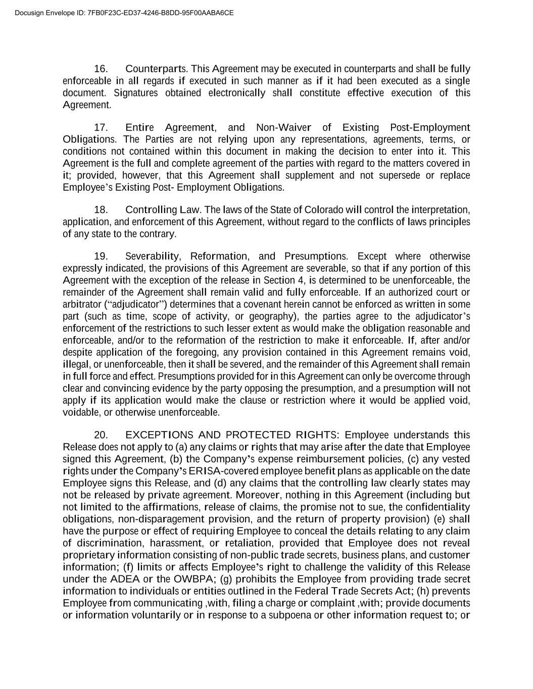 16. Counterparts. This Agreement may be executed in counterparts and shall be fully enforceable in all regards if executed in such manner as if it had been executed as a single document. Signatures obtained electronically shall constitute effective execution of this Agreement. 17. Entire Agreement, and Non-Waiver of Existing Post-Employment Obligations. The Parties are not relying upon any representations, agreements, terms, or conditions not contained within this document in making the decision to enter into it. This Agreement is the full and complete agreement of the parties with regard to the matters covered in it; provided, however, that this Agreement shall supplement and not supersede or replace Employee’s Existing Post­ Employment Obligations. 18. Controlling Law. The laws of the State of Colorado will control the interpretation, application, and enforcement of this Agreement, without regard to the conflicts of laws principles of any state to the contrary. 19. Severability, Reformation, and Presumptions. Except where otherwise expressly indicated, the provisions of this Agreement are severable, so that if any portion of this Agreement with the exception of the release in Section 4, is determined to be unenforceable, the remainder of the Agreement shall remain valid and fully enforceable. If an authorized court or arbitrator (“adjudicator”) determines that a covenant herein cannot be enforced as written in some part (such as time, scope of activity, or geography), the parties agree to the adjudicator’s enforcement of the restrictions to such lesser extent as would make the obligation reasonable and enforceable, and/or to the reformation of the restriction to make it enforceable. If, after and/or despite application of the foregoing, any provision contained in this Agreement remains void, illegal, or unenforceable, then it shall be severed, and the remainder of this Agreement shall remain in full force and effect. Presumptions provided for in this Agreement can only be overcome through clear and convincing evidence by the party opposing the presumption, and a presumption will not apply if its application would make the clause or restriction where it would be applied void, voidable, or otherwise unenforceable. 20. EXCEPTIONS AND PROTECTED RIGHTS: Employee understands this Release does not apply to (a) any claims or rights that may arise after the date that Employee signed this Agreement, (b) the Company’s expense reimbursement policies, (c) any vested rights under the Company’s ERISA-covered employee benefit plans as applicable on the date Employee signs this Release, and (d) any claims that the controlling law clearly states may not be released by private agreement. Moreover, nothing in this Agreement (including but not limited to the affirmations, release of claims, the promise not to sue, the confidentiality obligations, non-disparagement provision, and the return of property provision) (e) shall have the purpose or effect of requiring Employee to conceal the details relating to any claim of discrimination, harassment, or retaliation, provided that Employee does not reveal proprietary information consisting of non-public trade secrets, business plans, and customer information; (f) limits or affects Employee’s right to challenge the validity of this Release under the ADEA or the OWBPA; (g) prohibits the Employee from providing trade secret information to individuals or entities outlined in the Federal Trade Secrets Act; (h) prevents Employee from communicating ,with, filing a charge or complaint ,with; provide documents or information voluntarily or in response to a subpoena or other information request to; or Docusign Envelope ID: 7FB0F23C-ED37-4246-B8DD-95F00AABA6CE
