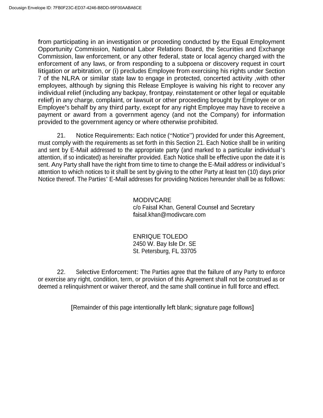 from participating in an investigation or proceeding conducted by the Equal Employment Opportunity Commission, National Labor Relations Board, the Securities and Exchange Commission, law enforcement, or any other federal, state or local agency charged with the enforcement of any laws, or from responding to a subpoena or discovery request in court litigation or arbitration, or (i) precludes Employee from exercising his rights under Section 7 of the NLRA or similar state law to engage in protected, concerted activity ,with other employees, although by signing this Release Employee is waiving his right to recover any individual relief (including any backpay, frontpay, reinstatement or other legal or equitable relief) in any charge, complaint, or lawsuit or other proceeding brought by Employee or on Employee’s behalf by any third party, except for any right Employee may have to receive a payment or award from a government agency (and not the Company) for information provided to the government agency or where otherwise prohibited. 21. Notice Requirements: Each notice (“Notice”) provided for under this Agreement, must comply with the requirements as set forth in this Section 21. Each Notice shall be in writing and sent by E-Mail addressed to the appropriate party (and marked to a particular individual’s attention, if so indicated) as hereinafter provided. Each Notice shall be effective upon the date it is sent. Any Party shall have the right from time to time to change the E-Mail address or individual’s attention to which notices to it shall be sent by giving to the other Party at least ten (10) days prior Notice thereof. The Parties’ E-Mail addresses for providing Notices hereunder shall be as follows: MODIVCARE c/o Faisal Khan, General Counsel and Secretary faisal.khan@modivcare.com ENRIQUE TOLEDO 2450 W. Bay Isle Dr. SE St. Petersburg, FL 33705 22. Selective Enforcement: The Parties agree that the failure of any Party to enforce or exercise any right, condition, term, or provision of this Agreement shall not be construed as or deemed a relinquishment or waiver thereof, and the same shall continue in full force and effect. [Remainder of this page intentionally left blank; signature page follows] Docusign Envelope ID: 7FB0F23C-ED37-4246-B8DD-95F00AABA6CE