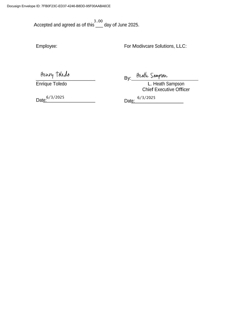 Accepted and agreed as of this ___ day of June 2025. Employee: ________________________ Enrique Toledo Date: For Modivcare Solutions, LLC: By: L. Heath Sampson Chief Executive Officer Date: Docusign Envelope ID: 7FB0F23C-ED37-4246-B8DD-95F00AABA6CE 6/3/2025 3.00 6/3/2025