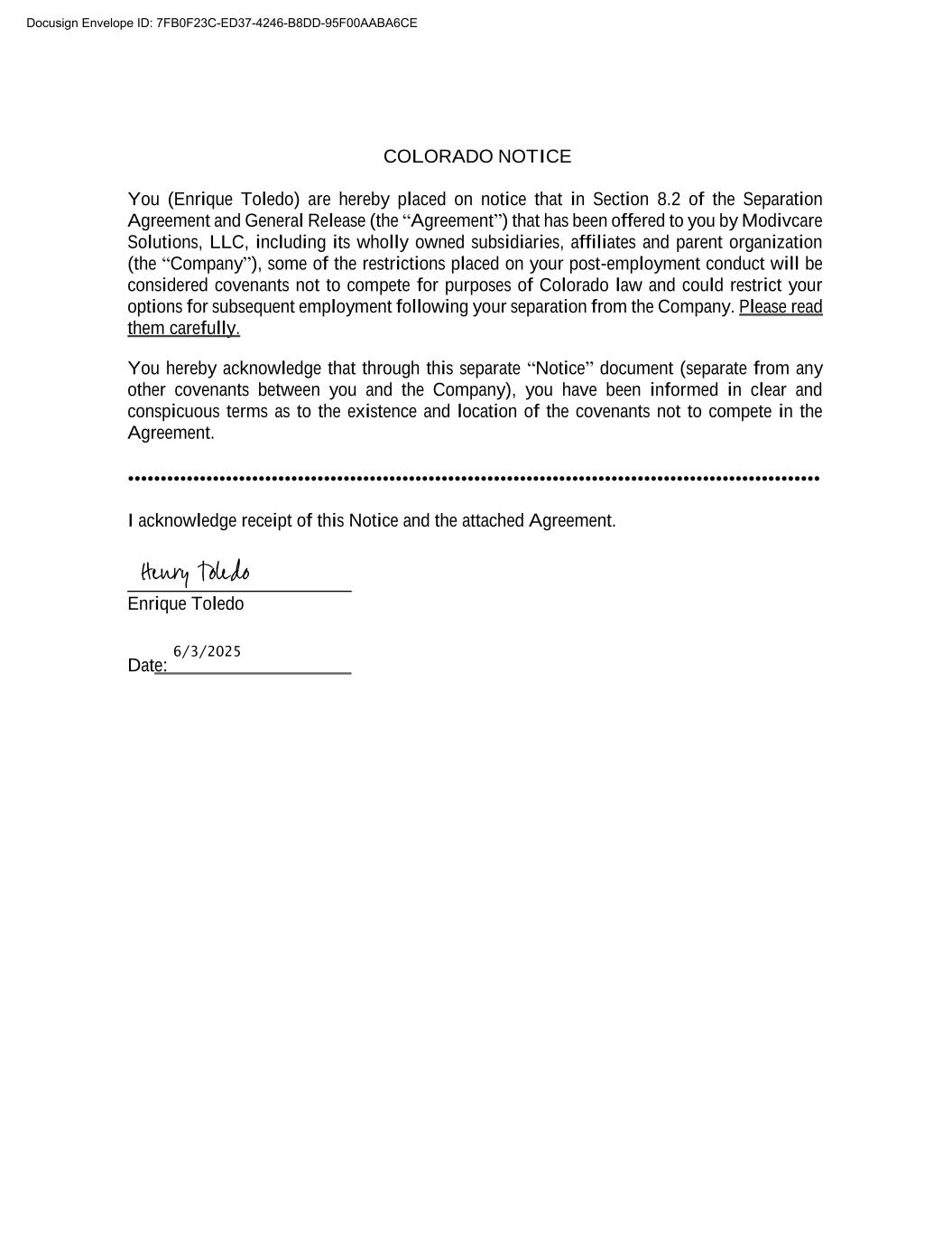 COLORADO NOTICE You (Enrique Toledo) are hereby placed on notice that in Section 8.2 of the Separation Agreement and General Release (the “Agreement”) that has been offered to you by Modivcare Solutions, LLC, including its wholly owned subsidiaries, affiliates and parent organization (the “Company”), some of the restrictions placed on your post-employment conduct will be considered covenants not to compete for purposes of Colorado law and could restrict your options for subsequent employment following your separation from the Company. Please read them carefully. You hereby acknowledge that through this separate “Notice” document (separate from any other covenants between you and the Company), you have been informed in clear and conspicuous terms as to the existence and location of the covenants not to compete in the Agreement. •••••••••••••••••••••••••••••••••••••••••••••••••••••••••••••••••••••••••••••••••••••••••••••••••••••••••• I acknowledge receipt of this Notice and the attached Agreement. ________________________ Enrique Toledo Date: Docusign Envelope ID: 7FB0F23C-ED37-4246-B8DD-95F00AABA6CE 6/3/2025