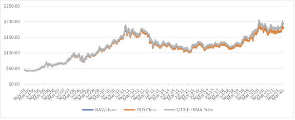 | c) | As of the date of the formation of the Trust on November 12, 2004, the NAV of the Trust, which represents the value of the gold deposited in the Trust, was $13,081,500, and the NAV per Share was $43.60. Since formation and through March 31, 2022, 18,031 Baskets (1,803,100,000 Shares) have been created and 14,272 Baskets (1,427,200,000 Shares) have been redeemed. |