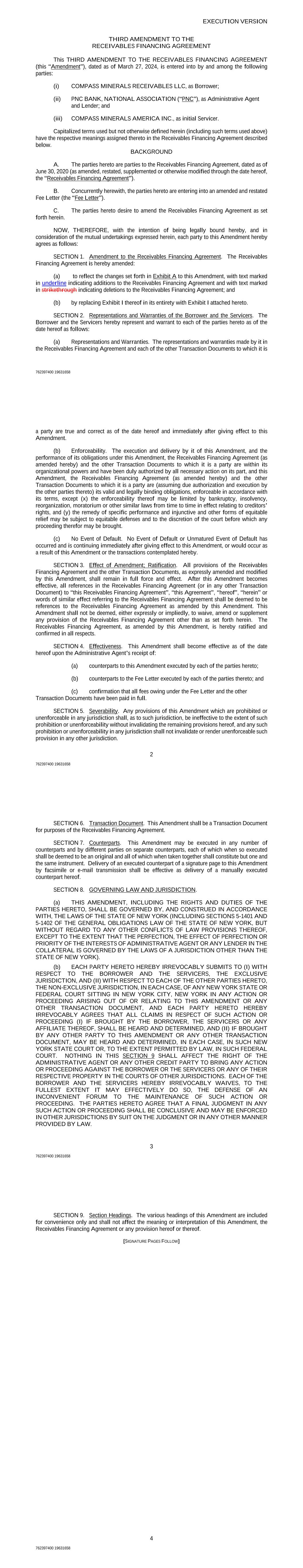 EXECUTION VERSION 762397400 19631658 THIRD AMENDMENT TO THE RECEIVABLES FINANCING AGREEMENT This THIRD AMENDMENT TO THE RECEIVABLES FINANCING AGREEMENT (this “Amendment”), dated as of March 27, 2024, is entered into by and among the following parties: (i) COMPASS MINERALS RECEIVABLES LLC, as Borrower; (ii) PNC BANK, NATIONAL ASSOCIATION (“PNC”), as Administrative Agent and Lender; and (iii) COMPASS MINERALS AMERICA INC., as initial Servicer. Capitalized terms used but not otherwise defined herein (including such terms used above) have the respective meanings assigned thereto in the Receivables Financing Agreement described below. BACKGROUND A. The parties hereto are parties to the Receivables Financing Agreement, dated as of June 30, 2020 (as amended, restated, supplemented or otherwise modified through the date hereof, the “Receivables Financing Agreement”). B. Concurrently herewith, the parties hereto are entering into an amended and restated Fee Letter (the “Fee Letter”). C. The parties hereto desire to amend the Receivables Financing Agreement as set forth herein. NOW, THEREFORE, with the intention of being legally bound hereby, and in consideration of the mutual undertakings expressed herein, each party to this Amendment hereby agrees as follows: SECTION 1. Amendment to the Receivables Financing Agreement. The Receivables Financing Agreement is hereby amended: (a) to reflect the changes set forth in Exhibit A to this Amendment, with text marked in underline indicating additions to the Receivables Financing Agreement and with text marked in strikethrough indicating deletions to the Receivables Financing Agreement; and (b) by replacing Exhibit I thereof in its entirety with Exhibit I attached hereto. SECTION 2. Representations and Warranties of the Borrower and the Servicers. The Borrower and the Servicers hereby represent and warrant to each of the parties hereto as of the date hereof as follows: (a) Representations and Warranties. The representations and warranties made by it in the Receivables Financing Agreement and each of the other Transaction Documents to which it is 2 762397400 19631658 a party are true and correct as of the date hereof and immediately after giving effect to this Amendment. (b) Enforceability. The execution and delivery by it of this Amendment, and the performance of its obligations under this Amendment, the Receivables Financing Agreement (as amended hereby) and the other Transaction Documents to which it is a party are within its organizational powers and have been duly authorized by all necessary action on its part, and this Amendment, the Receivables Financing Agreement (as amended hereby) and the other Transaction Documents to which it is a party are (assuming due authorization and execution by the other parties thereto) its valid and legally binding obligations, enforceable in accordance with its terms, except (x) the enforceability thereof may be limited by bankruptcy, insolvency, reorganization, moratorium or other similar laws from time to time in effect relating to creditors’ rights, and (y) the remedy of specific performance and injunctive and other forms of equitable relief may be subject to equitable defenses and to the discretion of the court before which any proceeding therefor may be brought. (c) No Event of Default. No Event of Default or Unmatured Event of Default has occurred and is continuing immediately after giving effect to this Amendment, or would occur as a result of this Amendment or the transactions contemplated hereby. SECTION 3. Effect of Amendment; Ratification. All provisions of the Receivables Financing Agreement and the other Transaction Documents, as expressly amended and modified by this Amendment, shall remain in full force and effect. After this Amendment becomes effective, all references in the Receivables Financing Agreement (or in any other Transaction Document) to “this Receivables Financing Agreement”, “this Agreement”, “hereof”, “herein” or words of similar effect referring to the Receivables Financing Agreement shall be deemed to be references to the Receivables Financing Agreement as amended by this Amendment. This Amendment shall not be deemed, either expressly or impliedly, to waive, amend or supplement any provision of the Receivables Financing Agreement other than as set forth herein. The Receivables Financing Agreement, as amended by this Amendment, is hereby ratified and confirmed in all respects. SECTION 4. Effectiveness. This Amendment shall become effective as of the date hereof upon the Administrative Agent’s receipt of: (a) counterparts to this Amendment executed by each of the parties hereto; (b) counterparts to the Fee Letter executed by each of the parties thereto; and (c) confirmation that all fees owing under the Fee Letter and the other Transaction Documents have been paid in full. SECTION 5. Severability. Any provisions of this Amendment which are prohibited or unenforceable in any jurisdiction shall, as to such jurisdiction, be ineffective to the extent of such prohibition or unenforceability without invalidating the remaining provisions hereof, and any such prohibition or unenforceability in any jurisdiction shall not invalidate or render unenforceable such provision in any other jurisdiction. 3 762397400 19631658 SECTION 6. Transaction Document. This Amendment shall be a Transaction Document for purposes of the Receivables Financing Agreement. SECTION 7. Counterparts. This Amendment may be executed in any number of counterparts and by different parties on separate counterparts, each of which when so executed shall be deemed to be an original and all of which when taken together shall constitute but one and the same instrument. Delivery of an executed counterpart of a signature page to this Amendment by facsimile or e-mail transmission shall be effective as delivery of a manually executed counterpart hereof. SECTION 8. GOVERNING LAW AND JURISDICTION. (a) THIS A