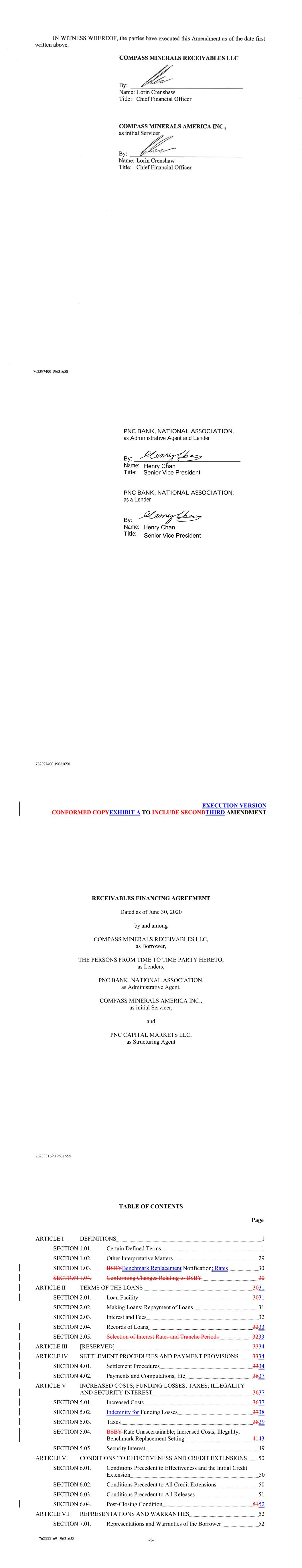 762397400 19631658 PNC BANK, NATIONAL ASSOCIATION, as Administrative Agent and Lender By: ____________________________________ Name: Title: PNC BANK, NATIONAL ASSOCIATION, as a Lender By: ____________________________________ Name: Title: Henry Chan Senior Vice President Henry Chan Senior Vice President EXECUTION VERSION CONFORMED COPYEXHIBIT A TO INCLUDE SECONDTHIRD AMENDMENT RECEIVABLES FINANCING AGREEMENT Dated as of June 30, 2020 by and among COMPASS MINERALS RECEIVABLES LLC, as Borrower, THE PERSONS FROM TIME TO TIME PARTY HERETO, as Lenders, PNC BANK, NATIONAL ASSOCIATION, as Administrative Agent, COMPASS MINERALS AMERICA INC., as initial Servicer, and PNC CAPITAL MARKETS LLC, as Structuring Agent 762333169 19631658 TABLE OF CONTENTS Page -i-762333169 19631658 ARTICLE I DEFINITIONS 1 SECTION 1.01. Certain Defined Terms 1 SECTION 1.02. Other Interpretative Matters 29 SECTION 1.03. BSBYBenchmark Replacement Notification; Rates 30 SECTION 1.04. Conforming Changes Relating to BSBY 30 ARTICLE II TERMS OF THE LOANS 3031 SECTION 2.01. Loan Facility 3031 SECTION 2.02. Making Loans; Repayment of Loans 31 SECTION 2.03. Interest and Fees 32 SECTION 2.04. Records of Loans 3233 SECTION 2.05. Selection of Interest Rates and Tranche Periods 3233 ARTICLE III [RESERVED] 3334 ARTICLE IV SETTLEMENT PROCEDURES AND PAYMENT PROVISIONS 3334 SECTION 4.01. Settlement Procedures 3334 SECTION 4.02. Payments and Computations, Etc 3637 ARTICLE V INCREASED COSTS; FUNDING LOSSES; TAXES; ILLEGALITY AND SECURITY INTEREST 3637 SECTION 5.01. Increased Costs 3637 SECTION 5.02. Indemnity for Funding Losses 3738 SECTION 5.03. Taxes 3839 SECTION 5.04. BSBY Rate Unascertainable; Increased Costs; Illegality; Benchmark Replacement Setting 4143 SECTION 5.05. Security Interest 49 ARTICLE VI CONDITIONS TO EFFECTIVENESS AND CREDIT EXTENSIONS 50 SECTION 6.01. Conditions Precedent to Effectiveness and the Initial Credit Extension 50 SECTION 6.02. Conditions Precedent to All Credit Extensions 50 SECTION 6.03. Conditions Precedent to All Releases 51 SECTION 6.04. Post-Closing Condition 5152 ARTICLE VII REPRESENTATIONS AND WARRANTIES 52 SECTION 7.01. Representations and Warranties of the Borrower 52