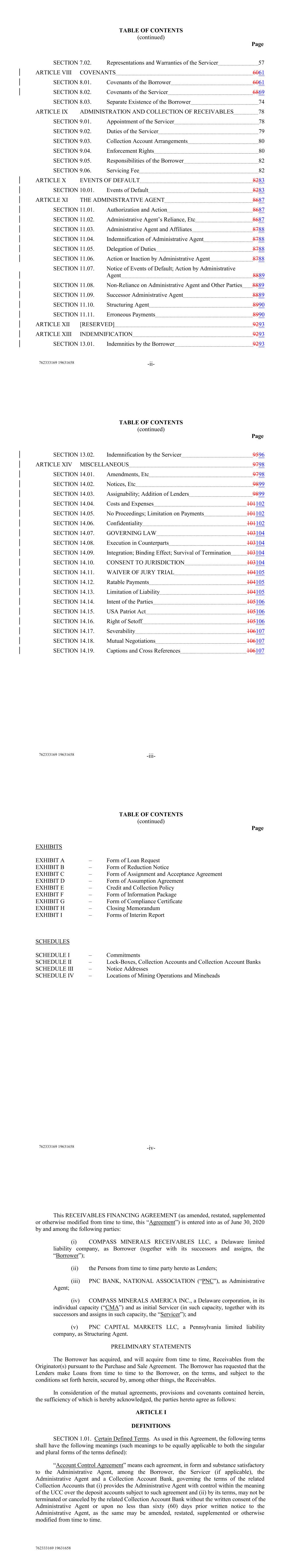 TABLE OF CONTENTS (continued) Page -ii-762333169 19631658 SECTION 7.02. Representations and Warranties of the Servicer 57 ARTICLE VIII COVENANTS 6061 SECTION 8.01. Covenants of the Borrower 6061 SECTION 8.02. Covenants of the Servicer 6869 SECTION 8.03. Separate Existence of the Borrower 74 ARTICLE IX ADMINISTRATION AND COLLECTION OF RECEIVABLES 78 SECTION 9.01. Appointment of the Servicer 78 SECTION 9.02. Duties of the Servicer 79 SECTION 9.03. Collection Account Arrangements 80 SECTION 9.04. Enforcement Rights 80 SECTION 9.05. Responsibilities of the Borrower 82 SECTION 9.06. Servicing Fee 82 ARTICLE X EVENTS OF DEFAULT 8283 SECTION 10.01. Events of Default 8283 ARTICLE XI THE ADMINISTRATIVE AGENT 8687 SECTION 11.01. Authorization and Action 8687 SECTION 11.02. Administrative Agent’s Reliance, Etc 8687 SECTION 11.03. Administrative Agent and Affiliates 8788 SECTION 11.04. Indemnification of Administrative Agent 8788 SECTION 11.05. Delegation of Duties 8788 SECTION 11.06. Action or Inaction by Administrative Agent 8788 SECTION 11.07. Notice of Events of Default; Action by Administrative Agent 8889 SECTION 11.08. Non-Reliance on Administrative Agent and Other Parties 8889 SECTION 11.09. Successor Administrative Agent 8889 SECTION 11.10. Structuring Agent 8990 SECTION 11.11. Erroneous Payments 8990 ARTICLE XII [RESERVED] 9293 ARTICLE XIII INDEMNIFICATION 9293 SECTION 13.01. Indemnities by the Borrower 9293 TABLE OF CONTENTS (continued) Page -iii-762333169 19631658 SECTION 13.02. Indemnification by the Servicer 9596 ARTICLE XIV MISCELLANEOUS 9798 SECTION 14.01. Amendments, Etc 9798 SECTION 14.02. Notices, Etc 9899 SECTION 14.03. Assignability; Addition of Lenders 9899 SECTION 14.04. Costs and Expenses 101102 SECTION 14.05. No Proceedings; Limitation on Payments 101102 SECTION 14.06. Confidentiality 101102 SECTION 14.07. GOVERNING LAW 103104 SECTION 14.08. Execution in Counterparts 103104 SECTION 14.09. Integration; Binding Effect; Survival of Termination 103104 SECTION 14.10. CONSENT TO JURISDICTION 103104 SECTION 14.11. WAIVER OF JURY TRIAL 104105 SECTION 14.12. Ratable Payments 104105 SECTION 14.13. Limitation of Liability 104105 SECTION 14.14. Intent of the Parties 105106 SECTION 14.15. USA Patriot Act 105106 SECTION 14.16. Right of Setoff 105106 SECTION 14.17. Severability 106107 SECTION 14.18. Mutual Negotiations 106107 SECTION 14.19. Captions and Cross References 106107 TABLE OF CONTENTS (continued) Page -iv-762333169 19631658 EXHIBITS EXHIBIT A – Form of Loan Request EXHIBIT B – Form of Reduction Notice EXHIBIT C – Form of Assignment and Acceptance Agreement EXHIBIT D – Form of Assumption Agreement EXHIBIT E – Credit and Collection Policy EXHIBIT F – Form of Information Package EXHIBIT G – Form of Compliance Certificate EXHIBIT H – Closing Memorandum EXHIBIT I – Forms of Interim Report SCHEDULES SCHEDULE I – Commitments SCHEDULE II – Lock-Boxes, Collection Accounts and Collection Account Banks SCHEDULE III – Notice Addresses SCHEDULE IV – Locations of Mining Operations and Mineheads This RECEIVABLES FINANCING AGREEMENT (as amended, restated, supplemented or otherwise modified from time to time, this “Agreement”) is entered into as of June 30, 2020 by and among the following parties: (i) COMPASS MINERALS RECEIVABLES LLC, a Delaware limited liability company, as Borrower (together with its successors and assigns, the “Borrower”); (ii) the Persons from time to time party hereto as Lenders; (iii) PNC BANK, NATIONAL ASSOCIATION (“PNC”), as Administrative Agent; (iv) COMPASS MINERALS AMERICA INC., a Delaware corporation, in its individual capacity (“CMA”) and as initial Servicer (in such capacity, together with its successors and assigns in such capacity, the “Servicer”); and (v) PNC CAPITAL MARKETS LLC, a Pennsylvania limited liability company, as Structuring Agent. PRELIMINARY STATEMENTS The Borrower has acquired, and will acquire from time to time, Receivables from the Originator(s) pursuant to the Purchase and Sale Agreement. The Borrower has requested that the Lenders make Loans from time to time to the Borrower, on the terms, and subject to the conditions set forth herein, secured by, among other things, the Receivables. In consideration of the mutual agreements, provisions and covenants contained herein, the sufficiency of which is hereby acknowledged, the parties hereto agree as follows: ARTICLE I DEFINITIONS SECTION 1.01. Certain Defined Terms. As used in this Agreement, the following terms shall have the following meanings (such meanings to be equally applicable to both the singular and plural forms of the terms defined): “Account Control Agreement” means each agreement, in form and substance satisfactory to the Administrative Agent, among the Borrower, the Servicer (if applicable), the Administrative Agent and a Collection Account Bank, governing the terms of the related Collection Accounts that (i) provides the Administrative Agent with control within the meaning of the UCC over the deposit accounts subject to such agreement and (ii) by its terms, may not be terminated or canceled by the related Collection Account Bank without the written consent of the Administrative Agent or upon no less than sixty (60) days prior written notice to the Administrative Agent, as the same may be amended, restated, supplemented or otherwise modified from time to time. 762333169 19631658