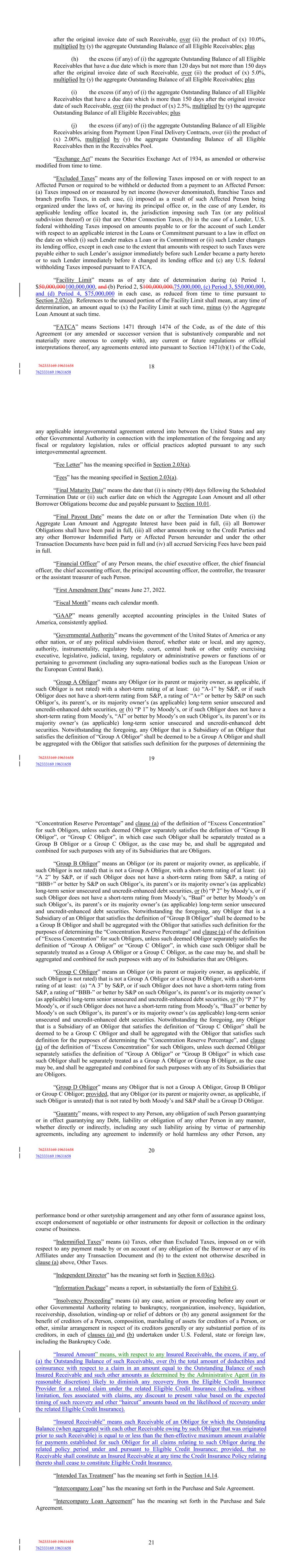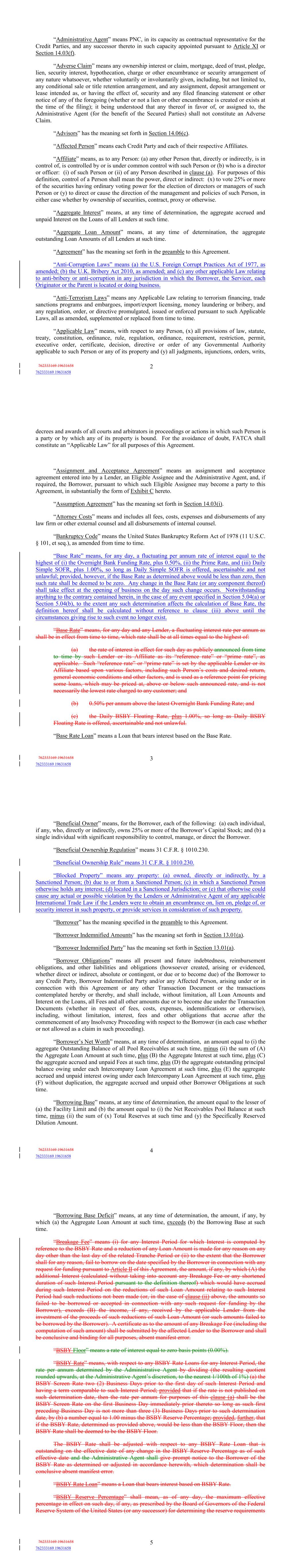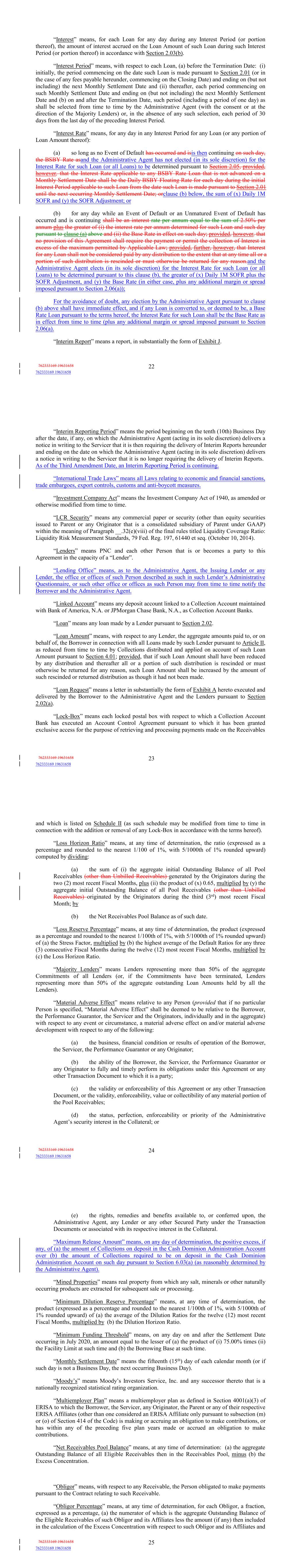 2762333169 19631658 762333169 19631658 “Administrative Agent” means PNC, in its capacity as contractual representative for the Credit Parties, and any successor thereto in such capacity appointed pursuant to Article XI or Section 14.03(f). “Adverse Claim” means any ownership interest or claim, mortgage, deed of trust, pledge, lien, security interest, hypothecation, charge or other encumbrance or security arrangement of any nature whatsoever, whether voluntarily or involuntarily given, including, but not limited to, any conditional sale or title retention arrangement, and any assignment, deposit arrangement or lease intended as, or having the effect of, security and any filed financing statement or other notice of any of the foregoing (whether or not a lien or other encumbrance is created or exists at the time of the filing); it being understood that any thereof in favor of, or assigned to, the Administrative Agent (for the benefit of the Secured Parties) shall not constitute an Adverse Claim. “Advisors” has the meaning set forth in Section 14.06(c). “Affected Person” means each Credit Party and each of their respective Affiliates. “Affiliate” means, as to any Person: (a) any other Person that, directly or indirectly, is in control of, is controlled by or is under common control with such Person or (b) who is a director or officer: (i) of such Person or (ii) of any Person described in clause (a). For purposes of this definition, control of a Person shall mean the power, direct or indirect: (x) to vote 25% or more of the securities having ordinary voting power for the election of directors or managers of such Person or (y) to direct or cause the direction of the management and policies of such Person, in either case whether by ownership of securities, contract, proxy or otherwise. “Aggregate Interest” means, at any time of determination, the aggregate accrued and unpaid Interest on the Loans of all Lenders at such time. “Aggregate Loan Amount” means, at any time of determination, the aggregate outstanding Loan Amounts of all Lenders at such time. “Agreement” has the meaning set forth in the preamble to this Agreement. “Anti-Corruption Laws” means (a) the U.S. Foreign Corrupt Practices Act of 1977, as amended; (b) the U.K. Bribery Act 2010, as amended; and (c) any other applicable Law relating to anti-bribery or anti-corruption in any jurisdiction in which the Borrower, the Servicer, each Originator or the Parent is located or doing business. “Anti-Terrorism Laws” means any Applicable Law relating to terrorism financing, trade sanctions programs and embargoes, import/export licensing, money laundering or bribery, and any regulation, order, or directive promulgated, issued or enforced pursuant to such Applicable Laws, all as amended, supplemented or replaced from time to time. “Applicable Law” means, with respect to any Person, (x) all provisions of law, statute, treaty, constitution, ordinance, rule, regulation, ordinance, requirement, restriction, permit, executive order, certificate, decision, directive or order of any Governmental Authority applicable to such Person or any of its property and (y) all judgments, injunctions, orders, writs, 3762333169 19631658 762333169 19631658 decrees and awards of all courts and arbitrators in proceedings or actions in which such Person is a party or by which any of its property is bound. For the avoidance of doubt, FATCA shall constitute an “Applicable Law” for all purposes of this Agreement. “Assignment and Acceptance Agreement” means an assignment and acceptance agreement entered into by a Lender, an Eligible Assignee and the Administrative Agent, and, if required, the Borrower, pursuant to which such Eligible Assignee may become a party to this Agreement, in substantially the form of Exhibit C hereto. “Assumption Agreement” has the meaning set forth in Section 14.03(i). “Attorney Costs” means and includes all fees, costs, expenses and disbursements of any law firm or other external counsel and all disbursements of internal counsel. “Bankruptcy Code” means the United States Bankruptcy Reform Act of 1978 (11 U.S.C. § 101, et seq.), as amended from time to time. “Base Rate” means, for any day, a fluctuating per annum rate of interest equal to the highest of (i) the Overnight Bank Funding Rate, plus 0.50%, (ii) the Prime Rate, and (iii) Daily Simple SOFR, plus 1.00%, so long as Daily Simple SOFR is offered, ascertainable and not unlawful; provided, however, if the Base Rate as determined above would be less than zero, then such rate shall be deemed to be zero. Any change in the Base Rate (or any component thereof) shall take effect at the opening of business on the day such change occurs. Notwithstanding anything to the contrary contained herein, in the case of any event specified in Section 5.04(a) or Section 5.04(b), to the extent any such determination affects the calculation of Base Rate, the definition hereof shall be calculated without reference to clause (iii) above until the circumstances giving rise to such event no longer exist. “Base Rate” means, for any day and any Lender, a fluctuating interest rate per annum as shall be in effect from time to time, which rate shall be at all times equal to the highest of: (a) the rate of interest in effect for such day as publicly announced from time to time by such Lender or its Affiliate as its “reference rate” or “prime rate”, as applicable. Such “reference rate” or “prime rate” is set by the applicable Lender or its Affiliate based upon various factors, including such Person’s costs and desired return, general economic conditions and other factors, and is used as a reference point for pricing some loans, which may be priced at, above or below such announced rate, and is not necessarily the lowest rate charged to any customer; and (b) 0.50% per annum above the latest Overnight Bank Funding Rate; and (c) the Daily 
