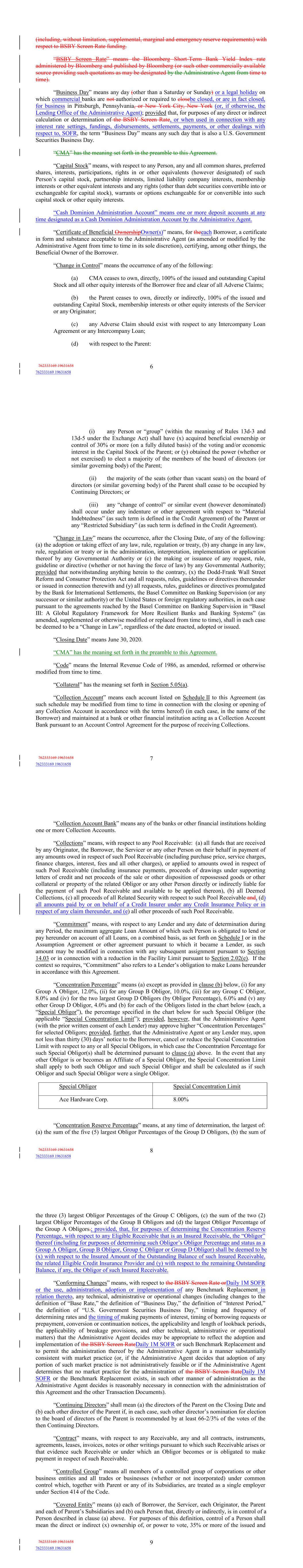 6762333169 19631658 762333169 19631658 (including, without limitation, supplemental, marginal and emergency reserve requirements) with respect to BSBY Screen Rate funding. “BSBY Screen Rate” means the Bloomberg Short-Term Bank Yield Index rate administered by Bloomberg and published by Bloomberg (or such other commercially available source providing such quotations as may be designated by the Administrative Agent from time to time). “Business Day” means any day (other than a Saturday or Sunday) or a legal holiday on which commercial banks are not authorized or required to closebe closed, or are in fact closed, for business in Pittsburgh, Pennsylvania, or New York City, New York (or, if otherwise, the Lending Office of the Administrative Agent); provided that, for purposes of any direct or indirect calculation or determination of the BSBY Screen Rate, or when used in connection with any interest rate settings, fundings, disbursements, settlements, payments, or other dealings with respect to, SOFR, the term “Business Day” means any such day that is also a U.S. Government Securities Business Day. “CMA” has the meaning set forth in the preamble to this Agreement. “Capital Stock” means, with respect to any Person, any and all common shares, preferred shares, interests, participations, rights in or other equivalents (however designated) of such Person’s capital stock, partnership interests, limited liability company interests, membership interests or other equivalent interests and any rights (other than debt securities convertible into or exchangeable for capital stock), warrants or options exchangeable for or convertible into such capital stock or other equity interests. “Cash Dominion Administration Account” means one or more deposit accounts at any time designated as a Cash Dominion Administration Account by the Administrative Agent. “Certificate of Beneficial OwnershipOwner(s)” means, for theeach Borrower, a certificate in form and substance acceptable to the Administrative Agent (as amended or modified by the Administrative Agent from time to time in its sole discretion), certifying, among other things, the Beneficial Owner of the Borrower. “Change in Control” means the occurrence of any of the following: (a) CMA ceases to own, directly, 100% of the issued and outstanding Capital Stock and all other equity interests of the Borrower free and clear of all Adverse Claims; (b) the Parent ceases to own, directly or indirectly, 100% of the issued and outstanding Capital Stock, membership interests or other equity interests of the Servicer or any Originator; (c) any Adverse Claim should exist with respect to any Intercompany Loan Agreement or any Intercompany Loan; (d) with respect to the Parent: 7762333169 19631658 762333169 19631658 (i) any Person or “group” (within the meaning of Rules 13d-3 and 13d-5 under the Exchange Act) shall have (x) acquired beneficial ownership or control of 30% or more (on a fully diluted basis) of the voting and/or economic interest in the Capital Stock of the Parent; or (y) obtained the power (whether or not exercised) to elect a majority of the members of the board of directors (or similar governing body) of the Parent; (ii) the majority of the seats (other than vacant seats) on the board of directors (or similar governing body) of the Parent shall cease to be occupied by Continuing Directors; or (iii) any “change of control” or similar event (however denominated) shall occur under any indenture or other agreement with respect to “Material Indebtedness” (as such term is defined in the Credit Agreement) of the Parent or any “Restricted Subsidiary” (as such term is defined in the Credit Agreement). “Change in Law” means the occurrence, after the Closing Date, of any of the following: (a) the adoption or taking effect of any law, rule, regulation or treaty, (b) any change in any law, rule, regulation or treaty or in the administration, interpretation, implementation or application thereof by any Governmental Authority or (c) the making or issuance of any request, rule, guideline or directive (whether or not having the force of law) by any Governmental Authority; provided that notwithstanding anything herein to the contrary, (x) the Dodd-Frank Wall Street Reform and Consumer Protection Act and all requests, rules, guidelines or directives thereunder or issued in connection therewith and (y) all requests, rules, guidelines or directives promulgated by the Bank for International Settlements, the Basel Committee on Banking Supervision (or any successor or similar authority) or the United States or foreign regulatory authorities, in each case pursuant to the agreements reached by the Basel Committee on Banking Supervision in “Basel III: A Global Regulatory Framework for More Resilient Banks and Banking Systems” (as amended, supplemented or otherwise modified or replaced from time to time), shall in each case be deemed to be a “Change in Law”, regardless of the date enacted, adopted or issued. “Closing Date” means June 30, 2020. “CMA” has the meaning set forth in the preamble to this Agreement. “Code” means the Internal Revenue Code of 1986, as amended, reformed or otherwise modified from time to time. “Collateral” has the meaning set forth in Section 5.05(a). “Collection Account” means each account listed on Schedule II to this Agreement (as such schedule may be modified from time to time in connection with the closing or opening of any Collection Account in accordance with the terms hereof) (in each case, in the name of the Borrower) and maintained at a bank or other financial institution acting as a Collection Account Bank pursuant to an Account Control Agreement for the purpose of receiving Collections. 762333169 19631658 8 762333169 19631658 Special Concentration Limit “Collection Account Bank” means any of the banks or other financial institutions holding one or more Collection Acco