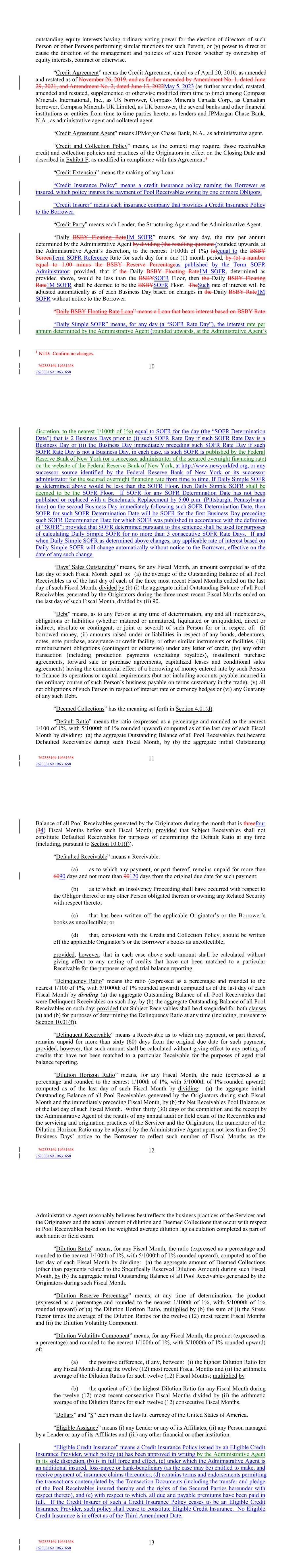 10762333169 19631658 762333169 19631658 outstanding equity interests having ordinary voting power for the election of directors of such Person or other Persons performing similar functions for such Person, or (y) power to direct or cause the direction of the management and policies of such Person whether by ownership of equity interests, contract or otherwise. “Credit Agreement” means the Credit Agreement, dated as of April 20, 2016, as amended and restated as of November 26, 2019, and as further amended by Amendment No. 1, dated June 29, 2021, and Amendment No. 2, dated June 13, 2022May 5, 2023 (as further amended, restated, amended and restated, supplemented or otherwise modified from time to time) among Compass Minerals International, Inc., as US borrower, Compass Minerals Canada Corp., as Canadian borrower, Compass Minerals UK Limited, as UK borrower, the several banks and other financial institutions or entities from time to time parties hereto, as lenders and JPMorgan Chase Bank, N.A., as administrative agent and collateral agent. “Credit Agreement Agent” means JPMorgan Chase Bank, N.A., as administrative agent. “Credit and Collection Policy” means, as the context may require, those receivables credit and collection policies and practices of the Originators in effect on the Closing Date and described in Exhibit F, as modified in compliance with this Agreement.1 “Credit Extension” means the making of any Loan. “Credit Insurance Policy” means a credit insurance policy naming the Borrower as insured, which policy insures the payment of Pool Receivables owing by one or more Obligors. “Credit Insurer” means each insurance company that provides a Credit Insurance Policy to the Borrower. “Credit Party” means each Lender, the Structuring Agent and the Administrative Agent. “Daily BSBY Floating Rate1M SOFR” means, for any day, the rate per annum determined by the Administrative Agent by dividing (the resulting quotient (rounded upwards, at the Administrative Agent’s discretion, to the nearest 1/100th of 1%) (a)equal to the BSBY ScreenTerm SOFR Reference Rate for such day for a one (1) month period, by (b) a number equal to 1.00 minus the BSBY Reserve Percentageas published by the Term SOFR Administrator; provided, that if the Daily BSBY Floating Rate1M SOFR, determined as provided above, would be less than the BSBYSOFR Floor, then the Daily BSBY Floating Rate1M SOFR shall be deemed to be the BSBYSOFR Floor. TheSuch rate of interest will be adjusted automatically as of each Business Day based on changes in the Daily BSBY Rate1M SOFR without notice to the Borrower. “Daily BSBY Floating Rate Loan” means a Loan that bears interest based on BSBY Rate. “Daily Simple SOFR” means, for any day (a “SOFR Rate Day”), the interest rate per annum determined by the Administrative Agent (rounded upwards, at the Administrative Agent’s 1 NTD: Confirm no changes. 11762333169 19631658 762333169 19631658 discretion, to the nearest 1/100th of 1%) equal to SOFR for the day (the “SOFR Determination Date”) that is 2 Business Days prior to (i) such SOFR Rate Day if such SOFR Rate Day is a Business Day or (ii) the Business Day immediately preceding such SOFR Rate Day if such SOFR Rate Day is not a Business Day, in each case, as such SOFR is published by the Federal Reserve Bank of New York (or a successor administrator of the secured overnight financing rate) on the website of the Federal Reserve Bank of New York, at http://www.newyorkfed.org, or any successor source identified by the Federal Reserve Bank of New York or its successor administrator for the secured overnight financing rate from time to time. If Daily Simple SOFR as determined above would be less than the SOFR Floor, then Daily Simple SOFR shall be deemed to be the SOFR Floor. If SOFR for any SOFR Determination Date has not been published or replaced with a Benchmark Replacement by 5:00 p.m. (Pittsburgh, Pennsylvania time) on the second Business Day immediately following such SOFR Determination Date, then SOFR for such SOFR Determination Date will be SOFR for the first Business Day preceding such SOFR Determination Date for which SOFR was published in accordance with the definition of “SOFR”; provided that SOFR determined pursuant to this sentence shall be used for purposes of calculating Daily Simple SOFR for no more than 3 consecutive SOFR Rate Days. If and when Daily Simple SOFR as determined above changes, any applicable rate of interest based on Daily Simple SOFR will change automatically without notice to the Borrower, effective on the date of any such change. “Days’ Sales Outstanding” means, for any Fiscal Month, an amount computed as of the last day of such Fiscal Month equal to: (a) the average of the Outstanding Balance of all Pool Receivables as of the last day of each of the three most recent Fiscal Months ended on the last day of such Fiscal Month, divided by (b) (i) the aggregate initial Outstanding Balance of all Pool Receivables generated by the Originators during the three most recent Fiscal Months ended on the last day of such Fiscal Month, divided by (ii) 90. “Debt” means, as to any Person at any time of determination, any and all indebtedness, obligations or liabilities (whether matured or unmatured, liquidated or unliquidated, direct or indirect, absolute or contingent, or joint or several) of such Person for or in respect of: (i) borrowed money, (ii) amounts raised under or liabilities in respect of any bonds, debentures, notes, note purchase, acceptance or credit facility, or other similar instruments or facilities, (iii) reimbursement obligations (contingent or otherwise) under any letter of credit, (iv) any other transaction (including production payments (excluding royalties), installment purchase agreements, forward sale or purchase agreements, capitalized leases and conditional sales agreements) having the commercial effect of a borrowing of money entered into 