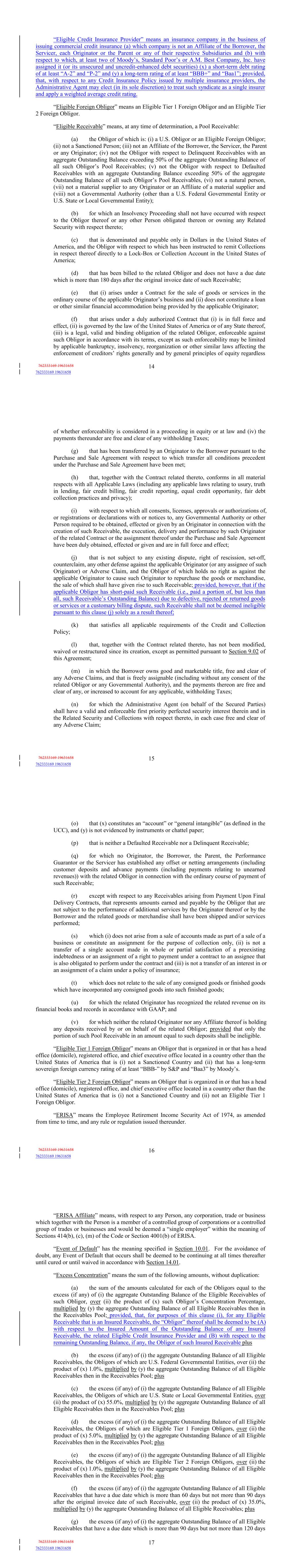 14762333169 19631658 762333169 19631658 “Eligible Credit Insurance Provider” means an insurance company in the business of issuing commercial credit insurance (a) which company is not an Affiliate of the Borrower, the Servicer, each Originator or the Parent or any of their respective Subsidiaries and (b) with respect to which, at least two of Moody’s, Standard Poor’s or A.M. Best Company, Inc. have assigned it (or its unsecured and uncredit-enhanced debt securities) (x) a short-term debt rating of at least “A-2” and “P-2” and (y) a long-term rating of at least “BBB+” and “Baa1”; provided, that, with respect to any Credit Insurance Policy issued by multiple insurance providers, the Administrative Agent may elect (in its sole discretion) to treat such syndicate as a single insurer and apply a weighted average credit rating. “Eligible Foreign Obligor” means an Eligible Tier 1 Foreign Obligor and an Eligible Tier 2 Foreign Obligor. “Eligible Receivable” means, at any time of determination, a Pool Receivable: (a) the Obligor of which is: (i) a U.S. Obligor or an Eligible Foreign Obligor; (ii) not a Sanctioned Person; (iii) not an Affiliate of the Borrower, the Servicer, the Parent or any Originator; (iv) not the Obligor with respect to Delinquent Receivables with an aggregate Outstanding Balance exceeding 50% of the aggregate Outstanding Balance of all such Obligor’s Pool Receivables; (v) not the Obligor with respect to Defaulted Receivables with an aggregate Outstanding Balance exceeding 50% of the aggregate Outstanding Balance of all such Obligor’s Pool Receivables, (vi) not a natural person, (vii) not a material supplier to any Originator or an Affiliate of a material supplier and (viii) not a Governmental Authority (other than a U.S. Federal Governmental Entity or U.S. State or Local Governmental Entity); (b) for which an Insolvency Proceeding shall not have occurred with respect to the Obligor thereof or any other Person obligated thereon or owning any Related Security with respect thereto; (c) that is denominated and payable only in Dollars in the United States of America, and the Obligor with respect to which has been instructed to remit Collections in respect thereof directly to a Lock-Box or Collection Account in the United States of America; (d) that has been billed to the related Obligor and does not have a due date which is more than 180 days after the original invoice date of such Receivable; (e) that (i) arises under a Contract for the sale of goods or services in the ordinary course of the applicable Originator’s business and (ii) does not constitute a loan or other similar financial accommodation being provided by the applicable Originator; (f) that arises under a duly authorized Contract that (i) is in full force and effect, (ii) is governed by the law of the United States of America or of any State thereof, (iii) is a legal, valid and binding obligation of the related Obligor, enforceable against such Obligor in accordance with its terms, except as such enforceability may be limited by applicable bankruptcy, insolvency, reorganization or other similar laws affecting the enforcement of creditors’ rights generally and by general principles of equity regardless 15762333169 19631658 762333169 19631658 of whether enforceability is considered in a proceeding in equity or at law and (iv) the payments thereunder are free and clear of any withholding Taxes; (g) that has been transferred by an Originator to the Borrower pursuant to the Purchase and Sale Agreement with respect to which transfer all conditions precedent under the Purchase and Sale Agreement have been met; (h) that, together with the Contract related thereto, conforms in all material respects with all Applicable Laws (including any applicable laws relating to usury, truth in lending, fair credit billing, fair credit reporting, equal credit opportunity, fair debt collection practices and privacy); (i) with respect to which all consents, licenses, approvals or authorizations of, or registrations or declarations with or notices to, any Governmental Authority or other Person required to be obtained, effected or given by an Originator in connection with the creation of such Receivable, the execution, delivery and performance by such Originator of the related Contract or the assignment thereof under the Purchase and Sale Agreement have been duly obtained, effected or given and are in full force and effect; (j) that is not subject to any existing dispute, right of rescission, set-off, counterclaim, any other defense against the applicable Originator (or any assignee of such Originator) or Adverse Claim, and the Obligor of which holds no right as against the applicable Originator to cause such Originator to repurchase the goods or merchandise, the sale of which shall have given rise to such Receivable; provided, however, that if the applicable Obligor has short-paid such Receivable (i.e., paid a portion of, but less than all, such Receivable’s Outstanding Balance) due to defective, rejected or returned goods or services or a customary billing dispute, such Receivable shall not be deemed ineligible pursuant to this clause (j) solely as a result thereof; (k) that satisfies all applicable requirements of the Credit and Collection Policy; (l) that, together with the Contract related thereto, has not been modified, waived or restructured since its creation, except as permitted pursuant to Section 9.02 of this Agreement; (m) in which the Borrower owns good and marketable title, free and clear of any Adverse Claims, and that is freely assignable (including without any consent of the related Obligor or any Governmental Authority), and the payments thereon are free and clear of any, or increased to account for any applicable, withholding Taxes; (n) for which the Administrative Agent (on behalf of the Secured Parties) shall have a valid and enforceable first priority perfected security interest th