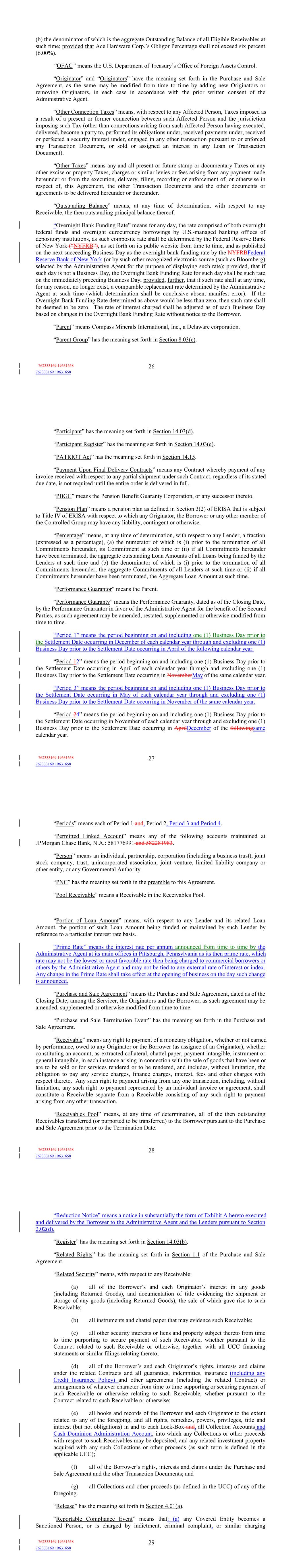 26762333169 19631658 762333169 19631658 (b) the denominator of which is the aggregate Outstanding Balance of all Eligible Receivables at such time; provided that Ace Hardware Corp.’s Obligor Percentage shall not exceed six percent (6.00%). “OFAC” means the U.S. Department of Treasury’s Office of Foreign Assets Control. “Originator” and “Originators” have the meaning set forth in the Purchase and Sale Agreement, as the same may be modified from time to time by adding new Originators or removing Originators, in each case in accordance with the prior written consent of the Administrative Agent. “Other Connection Taxes” means, with respect to any Affected Person, Taxes imposed as a result of a present or former connection between such Affected Person and the jurisdiction imposing such Tax (other than connections arising from such Affected Person having executed, delivered, become a party to, performed its obligations under, received payments under, received or perfected a security interest under, engaged in any other transaction pursuant to or enforced any Transaction Document, or sold or assigned an interest in any Loan or Transaction Document). “Other Taxes” means any and all present or future stamp or documentary Taxes or any other excise or property Taxes, charges or similar levies or fees arising from any payment made hereunder or from the execution, delivery, filing, recording or enforcement of, or otherwise in respect of, this Agreement, the other Transaction Documents and the other documents or agreements to be delivered hereunder or thereunder. “Outstanding Balance” means, at any time of determination, with respect to any Receivable, the then outstanding principal balance thereof. “Overnight Bank Funding Rate” means for any day, the rate comprised of both overnight federal funds and overnight eurocurrency borrowings by U.S.-managed banking offices of depository institutions, as such composite rate shall be determined by the Federal Reserve Bank of New York (“NYFRB”), as set forth on its public website from time to time, and as published on the next succeeding Business Day as the overnight bank funding rate by the NYFRBFederal Reserve Bank of New York (or by such other recognized electronic source (such as Bloomberg) selected by the Administrative Agent for the purpose of displaying such rate); provided, that if such day is not a Business Day, the Overnight Bank Funding Rate for such day shall be such rate on the immediately preceding Business Day; provided, further, that if such rate shall at any time, for any reason, no longer exist, a comparable replacement rate determined by the Administrative Agent at such time (which determination shall be conclusive absent manifest error). If the Overnight Bank Funding Rate determined as above would be less than zero, then such rate shall be deemed to be zero. The rate of interest charged shall be adjusted as of each Business Day based on changes in the Overnight Bank Funding Rate without notice to the Borrower. “Parent” means Compass Minerals International, Inc., a Delaware corporation. “Parent Group” has the meaning set forth in Section 8.03(c). 27762333169 19631658 762333169 19631658 “Participant” has the meaning set forth in Section 14.03(d). “Participant Register” has the meaning set forth in Section 14.03(e). “PATRIOT Act” has the meaning set forth in Section 14.15. “Payment Upon Final Delivery Contracts” means any Contract whereby payment of any invoice received with respect to any partial shipment under such Contract, regardless of its stated due date, is not required until the entire order is delivered in full. “PBGC” means the Pension Benefit Guaranty Corporation, or any successor thereto. “Pension Plan” means a pension plan as defined in Section 3(2) of ERISA that is subject to Title IV of ERISA with respect to which any Originator, the Borrower or any other member of the Controlled Group may have any liability, contingent or otherwise. “Percentage” means, at any time of determination, with respect to any Lender, a fraction (expressed as a percentage), (a) the numerator of which is (i) prior to the termination of all Commitments hereunder, its Commitment at such time or (ii) if all Commitments hereunder have been terminated, the aggregate outstanding Loan Amounts of all Loans being funded by the Lenders at such time and (b) the denominator of which is (i) prior to the termination of all Commitments hereunder, the aggregate Commitments of all Lenders at such time or (ii) if all Commitments hereunder have been terminated, the Aggregate Loan Amount at such time. “Performance Guarantor” means the Parent. “Performance Guaranty” means the Performance Guaranty, dated as of the Closing Date, by the Performance Guarantor in favor of the Administrative Agent for the benefit of the Secured Parties, as such agreement may be amended, restated, supplemented or otherwise modified from time to time. “Period 1” means the period beginning on and including one (1) Business Day prior to the Settlement Date occurring in December of each calendar year through and excluding one (1) Business Day prior to the Settlement Date occurring in April of the following calendar year. “Period 12” means the period beginning on and including one (1) Business Day prior to the Settlement Date occurring in April of each calendar year through and excluding one (1) Business Day prior to the Settlement Date occurring in NovemberMay of the same calendar year. “Period 3” means the period beginning on and including one (1) Business Day prior to the Settlement Date occurring in May of each calendar year through and excluding one (1) Business Day prior to the Settlement Date occurring in November of the same calendar year. “Period 24” means the period beginning on and including one (1) Business Day prior to the Settlement Date occurring in November of each calendar year through and exc