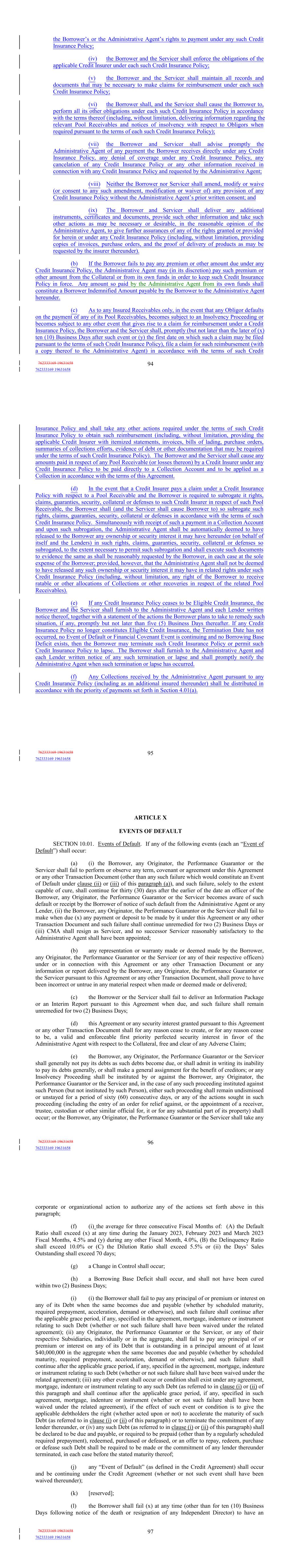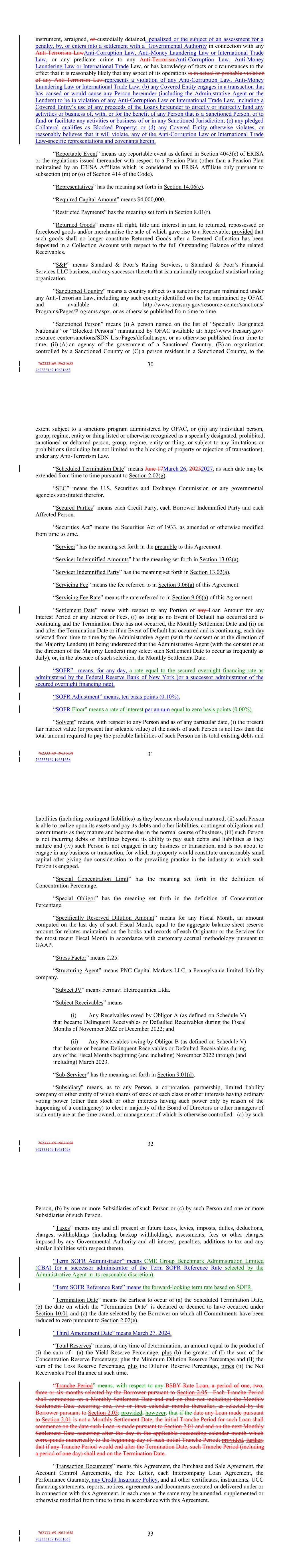 30762333169 19631658 762333169 19631658 instrument, arraigned, or custodially detained, penalized or the subject of an assessment for a penalty, by, or enters into a settlement with a Governmental Authority in connection with any Anti-Terrorism LawAnti-Corruption Law, Anti-Money Laundering Law or International Trade Law, or any predicate crime to any Anti-TerrorismAnti-Corruption Law, Anti-Money Laundering Law or International Trade Law, or has knowledge of facts or circumstances to the effect that it is reasonably likely that any aspect of its operations is in actual or probable violation of any Anti-Terrorism Law.represents a violation of any Anti-Corruption Law, Anti-Money Laundering Law or International Trade Law; (b) any Covered Entity engages in a transaction that has caused or would cause any Person hereunder (including the Administrative Agent or the Lenders) to be in violation of any Anti-Corruption Law or International Trade Law, including a Covered Entity’s use of any proceeds of the Loans hereunder to directly or indirectly fund any activities or business of, with, or for the benefit of any Person that is a Sanctioned Person, or to fund or facilitate any activities or business of or in any Sanctioned Jurisdiction; (c) any pledged Collateral qualifies as Blocked Property; or (d) any Covered Entity otherwise violates, or reasonably believes that it will violate, any of the Anti-Corruption Law or International Trade Law-specific representations and covenants herein. “Reportable Event” means any reportable event as defined in Section 4043(c) of ERISA or the regulations issued thereunder with respect to a Pension Plan (other than a Pension Plan maintained by an ERISA Affiliate which is considered an ERISA Affiliate only pursuant to subsection (m) or (o) of Section 414 of the Code). “Representatives” has the meaning set forth in Section 14.06(c). “Required Capital Amount” means $4,000,000. “Restricted Payments” has the meaning set forth in Section 8.01(r). “Returned Goods” means all right, title and interest in and to returned, repossessed or foreclosed goods and/or merchandise the sale of which gave rise to a Receivable; provided that such goods shall no longer constitute Returned Goods after a Deemed Collection has been deposited in a Collection Account with respect to the full Outstanding Balance of the related Receivables. “S&P” means Standard & Poor’s Rating Services, a Standard & Poor’s Financial Services LLC business, and any successor thereto that is a nationally recognized statistical rating organization. “Sanctioned Country” means a country subject to a sanctions program maintained under any Anti-Terrorism Law, including any such country identified on the list maintained by OFAC and available at: http://www.treasury.gov/resource-center/sanctions/ Programs/Pages/Programs.aspx, or as otherwise published from time to time “Sanctioned Person” means (i) A person named on the list of “Specially Designated Nationals” or “Blocked Persons” maintained by OFAC available at: http://www.treasury.gov/ resource-center/sanctions/SDN-List/Pages/default.aspx, or as otherwise published from time to time, (ii) (A) an agency of the government of a Sanctioned Country, (B) an organization controlled by a Sanctioned Country or (C) a person resident in a Sanctioned Country, to the 31762333169 19631658 762333169 19631658 extent subject to a sanctions program administered by OFAC, or (iii) any individual person, group, regime, entity or thing listed or otherwise recognized as a specially designated, prohibited, sanctioned or debarred person, group, regime, entity or thing, or subject to any limitations or prohibitions (including but not limited to the blocking of property or rejection of transactions), under any Anti-Terrorism Law. “Scheduled Termination Date” means June 17March 26, 20252027, as such date may be extended from time to time pursuant to Section 2.02(g). “SEC” means the U.S. Securities and Exchange Commission or any governmental agencies substituted therefor. “Secured Parties” means each Credit Party, each Borrower Indemnified Party and each Affected Person. “Securities Act” means the Securities Act of 1933, as amended or otherwise modified from time to time. “Servicer” has the meaning set forth in the preamble to this Agreement. “Servicer Indemnified Amounts” has the meaning set forth in Section 13.02(a). “Servicer Indemnified Party” has the meaning set forth in Section 13.02(a). “Servicing Fee” means the fee referred to in Section 9.06(a) of this Agreement. “Servicing Fee Rate” means the rate referred to in Section 9.06(a) of this Agreement. “Settlement Date” means with respect to any Portion of any Loan Amount for any Interest Period or any Interest or Fees, (i) so long as no Event of Default has occurred and is continuing and the Termination Date has not occurred, the Monthly Settlement Date and (ii) on and after the Termination Date or if an Event of Default has occurred and is continuing, each day selected from time to time by the Administrative Agent (with the consent or at the direction of the Majority Lenders) (it being understood that the Administrative Agent (with the consent or at the direction of the Majority Lenders) may select such Settlement Date to occur as frequently as daily), or, in the absence of such selection, the Monthly Settlement Date. “SOFR” means, for any day, a rate equal to the secured overnight financing rate as administered by the Federal Reserve Bank of New York (or a successor administrator of the secured overnight financing rate). “SOFR Adjustment” means, ten basis points (0.10%). “SOFR Floor” means a rate of interest per annum equal to zero basis points (0.00%). “Solvent” means, with respect to any Person and as of any particular date, (i) the present fair market value (or present fair saleable value) of the assets of such Person is not less than the