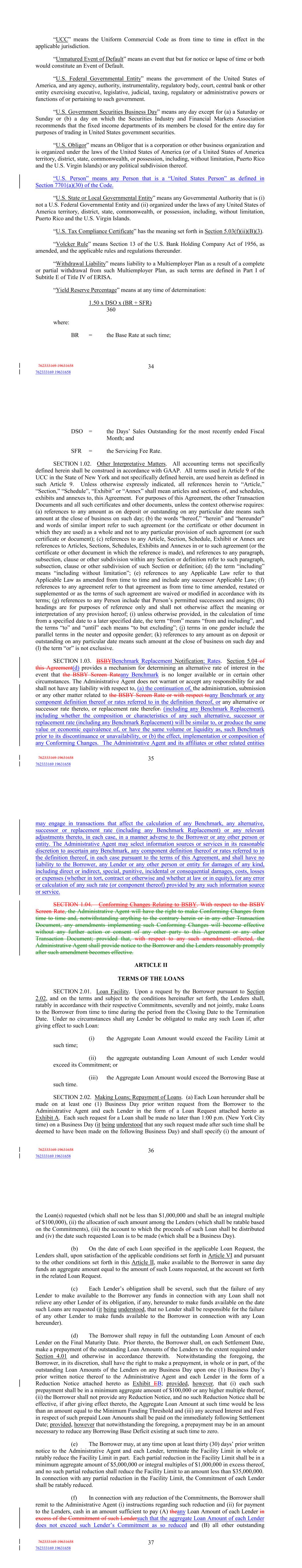 34762333169 19631658 762333169 19631658 “UCC” means the Uniform Commercial Code as from time to time in effect in the applicable jurisdiction. “Unmatured Event of Default” means an event that but for notice or lapse of time or both would constitute an Event of Default. “U.S. Federal Governmental Entity” means the government of the United States of America, and any agency, authority, instrumentality, regulatory body, court, central bank or other entity exercising executive, legislative, judicial, taxing, regulatory or administrative powers or functions of or pertaining to such government. “U.S. Government Securities Business Day” means any day except for (a) a Saturday or Sunday or (b) a day on which the Securities Industry and Financial Markets Association recommends that the fixed income departments of its members be closed for the entire day for purposes of trading in United States government securities. “U.S. Obligor” means an Obligor that is a corporation or other business organization and is organized under the laws of the United States of America (or of a United States of America territory, district, state, commonwealth, or possession, including, without limitation, Puerto Rico and the U.S. Virgin Islands) or any political subdivision thereof. “U.S. Person” means any Person that is a “United States Person” as defined in Section 7701(a)(30) of the Code. “U.S. State or Local Governmental Entity” means any Governmental Authority that is (i) not a U.S. Federal Governmental Entity and (ii) organized under the laws of any United States of America territory, district, state, commonwealth, or possession, including, without limitation, Puerto Rico and the U.S. Virgin Islands. “U.S. Tax Compliance Certificate” has the meaning set forth in Section 5.03(f)(ii)(B)(3). “Volcker Rule” means Section 13 of the U.S. Bank Holding Company Act of 1956, as amended, and the applicable rules and regulations thereunder. “Withdrawal Liability” means liability to a Multiemployer Plan as a result of a complete or partial withdrawal from such Multiemployer Plan, as such terms are defined in Part I of Subtitle E of Title IV of ERISA. “Yield Reserve Percentage” means at any time of determination: 1.50 x DSO x (BR + SFR) 360 where: BR = the Base Rate at such time; 35762333169 19631658 762333169 19631658 DSO = the Days’ Sales Outstanding for the most recently ended Fiscal Month; and SFR = the Servicing Fee Rate. SECTION 1.02. Other Interpretative Matters. All accounting terms not specifically defined herein shall be construed in accordance with GAAP. All terms used in Article 9 of the UCC in the State of New York and not specifically defined herein, are used herein as defined in such Article 9. Unless otherwise expressly indicated, all references herein to “Article,” “Section,” “Schedule”, “Exhibit” or “Annex” shall mean articles and sections of, and schedules, exhibits and annexes to, this Agreement. For purposes of this Agreement, the other Transaction Documents and all such certificates and other documents, unless the context otherwise requires: (a) references to any amount as on deposit or outstanding on any particular date means such amount at the close of business on such day; (b) the words “hereof,” “herein” and “hereunder” and words of similar import refer to such agreement (or the certificate or other document in which they are used) as a whole and not to any particular provision of such agreement (or such certificate or document); (c) references to any Article, Section, Schedule, Exhibit or Annex are references to Articles, Sections, Schedules, Exhibits and Annexes in or to such agreement (or the certificate or other document in which the reference is made), and references to any paragraph, subsection, clause or other subdivision within any Section or definition refer to such paragraph, subsection, clause or other subdivision of such Section or definition; (d) the term “including” means “including without limitation”; (e) references to any Applicable Law refer to that Applicable Law as amended from time to time and include any successor Applicable Law; (f) references to any agreement refer to that agreement as from time to time amended, restated or supplemented or as the terms of such agreement are waived or modified in accordance with its terms; (g) references to any Person include that Person’s permitted successors and assigns; (h) headings are for purposes of reference only and shall not otherwise affect the meaning or interpretation of any provision hereof; (i) unless otherwise provided, in the calculation of time from a specified date to a later specified date, the term “from” means “from and including”, and the terms “to” and “until” each means “to but excluding”; (j) terms in one gender include the parallel terms in the neuter and opposite gender; (k) references to any amount as on deposit or outstanding on any particular date means such amount at the close of business on such day and (l) the term “or” is not exclusive. SECTION 1.03. BSBYBenchmark Replacement Notification; Rates. Section 5.04 of this Agreement(d) provides a mechanism for determining an alternative rate of interest in the event that the BSBY Screen Rateany Benchmark is no longer available or in certain other circumstances. The Administrative Agent does not warrant or accept any responsibility for and shall not have any liability with respect to, (a) the continuation of, the administration, submission or any other matter related to the BSBY Screen Rate or with respect toany Benchmark or any component definition thereof or rates referred to in the definition thereof, or any alternative or successor rate thereto, or replacement rate therefor. (including any Benchmark Replacement), including whether the composition or characteristics of any such alternative, successor or replacement rate (including any Benchmark Replaceme