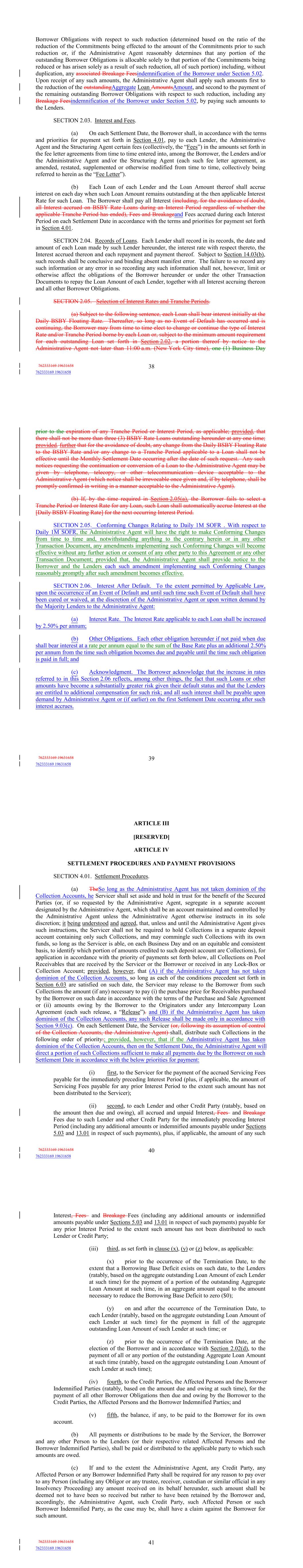 38762333169 19631658 762333169 19631658 Borrower Obligations with respect to such reduction (determined based on the ratio of the reduction of the Commitments being effected to the amount of the Commitments prior to such reduction or, if the Administrative Agent reasonably determines that any portion of the outstanding Borrower Obligations is allocable solely to that portion of the Commitments being reduced or has arisen solely as a result of such reduction, all of such portion) including, without duplication, any associated Breakage Feesindemnification of the Borrower under Section 5.02. Upon receipt of any such amounts, the Administrative Agent shall apply such amounts first to the reduction of the outstandingAggregate Loan AmountsAmount, and second to the payment of the remaining outstanding Borrower Obligations with respect to such reduction, including any Breakage Feesindemnification of the Borrower under Section 5.02, by paying such amounts to the Lenders. SECTION 2.03. Interest and Fees. (a) On each Settlement Date, the Borrower shall, in accordance with the terms and priorities for payment set forth in Section 4.01, pay to each Lender, the Administrative Agent and the Structuring Agent certain fees (collectively, the “Fees”) in the amounts set forth in the fee letter agreements from time to time entered into, among the Borrower, the Lenders and/or the Administrative Agent and/or the Structuring Agent (each such fee letter agreement, as amended, restated, supplemented or otherwise modified from time to time, collectively being referred to herein as the “Fee Letter”). (b) Each Loan of each Lender and the Loan Amount thereof shall accrue interest on each day when such Loan Amount remains outstanding at the then applicable Interest Rate for such Loan. The Borrower shall pay all Interest (including, for the avoidance of doubt, all Interest accrued on BSBY Rate Loans during an Interest Period regardless of whether the applicable Tranche Period has ended), Fees and Breakageand Fees accrued during each Interest Period on each Settlement Date in accordance with the terms and priorities for payment set forth in Section 4.01. SECTION 2.04. Records of Loans. Each Lender shall record in its records, the date and amount of each Loan made by such Lender hereunder, the interest rate with respect thereto, the Interest accrued thereon and each repayment and payment thereof. Subject to Section 14.03(b), such records shall be conclusive and binding absent manifest error. The failure to so record any such information or any error in so recording any such information shall not, however, limit or otherwise affect the obligations of the Borrower hereunder or under the other Transaction Documents to repay the Loan Amount of each Lender, together with all Interest accruing thereon and all other Borrower Obligations. SECTION 2.05. Selection of Interest Rates and Tranche Periods. (a) Subject to the following sentence, each Loan shall bear interest initially at the Daily BSBY Floating Rate. Thereafter, so long as no Event of Default has occurred and is continuing, the Borrower may from time to time elect to change or continue the type of Interest Rate and/or Tranche Period borne by each Loan or, subject to the minimum amount requirement for each outstanding Loan set forth in Section 2.02, a portion thereof by notice to the Administrative Agent not later than 11:00 a.m. (New York City time), one (1) Business Day 39762333169 19631658 762333169 19631658 prior to the expiration of any Tranche Period or Interest Period, as applicable; provided, that there shall not be more than three (3) BSBY Rate Loans outstanding hereunder at any one time; provided, further that for the avoidance of doubt, any change from the Daily BSBY Floating Rate to the BSBY Rate and/or any change to a Tranche Period applicable to a Loan shall not be effective until the Monthly Settlement Date occurring after the date of such request. Any such notices requesting the continuation or conversion of a Loan to the Administrative Agent may be given by telephone, telecopy, or other telecommunication device acceptable to the Administrative Agent (which notice shall be irrevocable once given and, if by telephone, shall be promptly confirmed in writing in a manner acceptable to the Administrative Agent). (b) If, by the time required in Section 2.05(a), the Borrower fails to select a Tranche Period or Interest Rate for any Loan, such Loan shall automatically accrue Interest at the [Daily BSBY Floating Rate] for the next occurring Interest Period. SECTION 2.05. Conforming Changes Relating to Daily 1M SOFR . With respect to Daily 1M SOFR, the Administrative Agent will have the right to make Conforming Changes from time to time and, notwithstanding anything to the contrary herein or in any other Transaction Document, any amendments implementing such Conforming Changes will become effective without any further action or consent of any other party to this Agreement or any other Transaction Document; provided that, the Administrative Agent shall provide notice to the Borrower and the Lenders each such amendment implementing such Conforming Changes reasonably promptly after such amendment becomes effective. SECTION 2.06. Interest After Default. To the extent permitted by Applicable Law, upon the occurrence of an Event of Default and until such time such Event of Default shall have been cured or waived, at the discretion of the Administrative Agent or upon written demand by the Majority Lenders to the Administrative Agent: (a) Interest Rate. The Interest Rate applicable to each Loan shall be increased by 2.50% per annum; (b) Other Obligations. Each other obligation hereunder if not paid when due shall bear interest at a rate per annum equal to the sum of the Base Rate plus an additional 2.50% per annum from the time such obligation becomes due and payable until the time such obligation is paid in full; and (c) Acknowledgment. The Borrower acknowledge 
