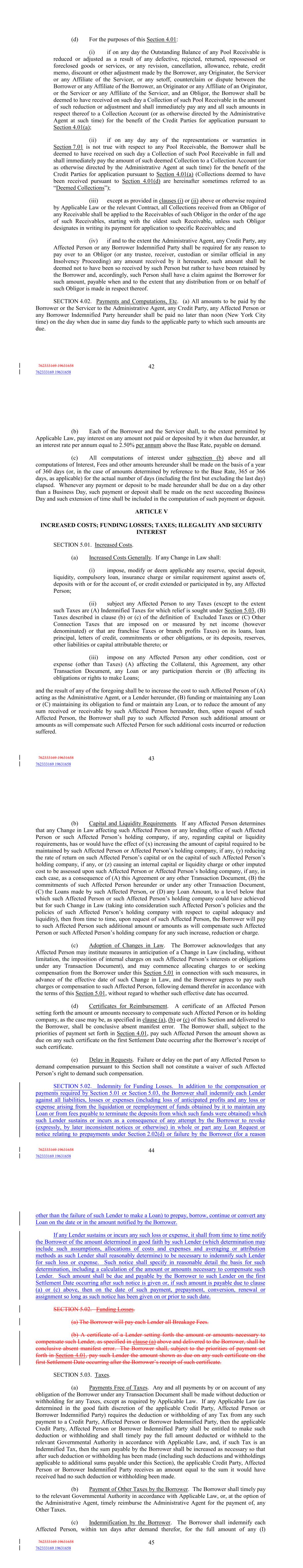 42762333169 19631658 762333169 19631658 (d) For the purposes of this Section 4.01: (i) if on any day the Outstanding Balance of any Pool Receivable is reduced or adjusted as a result of any defective, rejected, returned, repossessed or foreclosed goods or services, or any revision, cancellation, allowance, rebate, credit memo, discount or other adjustment made by the Borrower, any Originator, the Servicer or any Affiliate of the Servicer, or any setoff, counterclaim or dispute between the Borrower or any Affiliate of the Borrower, an Originator or any Affiliate of an Originator, or the Servicer or any Affiliate of the Servicer, and an Obligor, the Borrower shall be deemed to have received on such day a Collection of such Pool Receivable in the amount of such reduction or adjustment and shall immediately pay any and all such amounts in respect thereof to a Collection Account (or as otherwise directed by the Administrative Agent at such time) for the benefit of the Credit Parties for application pursuant to Section 4.01(a); (ii) if on any day any of the representations or warranties in Section 7.01 is not true with respect to any Pool Receivable, the Borrower shall be deemed to have received on such day a Collection of such Pool Receivable in full and shall immediately pay the amount of such deemed Collection to a Collection Account (or as otherwise directed by the Administrative Agent at such time) for the benefit of the Credit Parties for application pursuant to Section 4.01(a) (Collections deemed to have been received pursuant to Section 4.01(d) are hereinafter sometimes referred to as “Deemed Collections”); (iii) except as provided in clauses (i) or (ii) above or otherwise required by Applicable Law or the relevant Contract, all Collections received from an Obligor of any Receivable shall be applied to the Receivables of such Obligor in the order of the age of such Receivables, starting with the oldest such Receivable, unless such Obligor designates in writing its payment for application to specific Receivables; and (iv) if and to the extent the Administrative Agent, any Credit Party, any Affected Person or any Borrower Indemnified Party shall be required for any reason to pay over to an Obligor (or any trustee, receiver, custodian or similar official in any Insolvency Proceeding) any amount received by it hereunder, such amount shall be deemed not to have been so received by such Person but rather to have been retained by the Borrower and, accordingly, such Person shall have a claim against the Borrower for such amount, payable when and to the extent that any distribution from or on behalf of such Obligor is made in respect thereof. SECTION 4.02. Payments and Computations, Etc. (a) All amounts to be paid by the Borrower or the Servicer to the Administrative Agent, any Credit Party, any Affected Person or any Borrower Indemnified Party hereunder shall be paid no later than noon (New York City time) on the day when due in same day funds to the applicable party to which such amounts are due. 43762333169 19631658 762333169 19631658 (b) Each of the Borrower and the Servicer shall, to the extent permitted by Applicable Law, pay interest on any amount not paid or deposited by it when due hereunder, at an interest rate per annum equal to 2.50% per annum above the Base Rate, payable on demand. (c) All computations of interest under subsection (b) above and all computations of Interest, Fees and other amounts hereunder shall be made on the basis of a year of 360 days (or, in the case of amounts determined by reference to the Base Rate, 365 or 366 days, as applicable) for the actual number of days (including the first but excluding the last day) elapsed. Whenever any payment or deposit to be made hereunder shall be due on a day other than a Business Day, such payment or deposit shall be made on the next succeeding Business Day and such extension of time shall be included in the computation of such payment or deposit. ARTICLE V INCREASED COSTS; FUNDING LOSSES; TAXES; ILLEGALITY AND SECURITY INTEREST SECTION 5.01. Increased Costs. (a) Increased Costs Generally. If any Change in Law shall: (i) impose, modify or deem applicable any reserve, special deposit, liquidity, compulsory loan, insurance charge or similar requirement against assets of, deposits with or for the account of, or credit extended or participated in by, any Affected Person; (ii) subject any Affected Person to any Taxes (except to the extent such Taxes are (A) Indemnified Taxes for which relief is sought under Section 5.03, (B) Taxes described in clause (b) or (c) of the definition of Excluded Taxes or (C) Other Connection Taxes that are imposed on or measured by net income (however denominated) or that are franchise Taxes or branch profits Taxes) on its loans, loan principal, letters of credit, commitments or other obligations, or its deposits, reserves, other liabilities or capital attributable thereto; or (iii) impose on any Affected Person any other condition, cost or expense (other than Taxes) (A) affecting the Collateral, this Agreement, any other Transaction Document, any Loan or any participation therein or (B) affecting its obligations or rights to make Loans; and the result of any of the foregoing shall be to increase the cost to such Affected Person of (A) acting as the Administrative Agent, or a Lender hereunder, (B) funding or maintaining any Loan or (C) maintaining its obligation to fund or maintain any Loan, or to reduce the amount of any sum received or receivable by such Affected Person hereunder, then, upon request of such Affected Person, the Borrower shall pay to such Affected Person such additional amount or amounts as will compensate such Affected Person for such additional costs incurred or reduction suffered. 44762333169 19631658 762333169 19631658 (b) Capital and Liquidity Requirements. If any Affected Person determines that any Change in Law affecting such Affected Person or any lending office of such Af