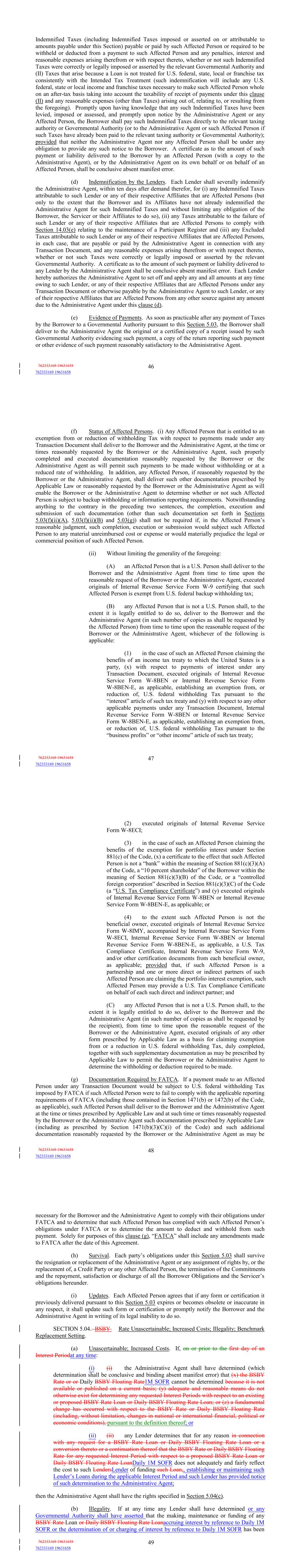 46762333169 19631658 762333169 19631658 Indemnified Taxes (including Indemnified Taxes imposed or asserted on or attributable to amounts payable under this Section) payable or paid by such Affected Person or required to be withheld or deducted from a payment to such Affected Person and any penalties, interest and reasonable expenses arising therefrom or with respect thereto, whether or not such Indemnified Taxes were correctly or legally imposed or asserted by the relevant Governmental Authority and (II) Taxes that arise because a Loan is not treated for U.S. federal, state, local or franchise tax consistently with the Intended Tax Treatment (such indemnification will include any U.S. federal, state or local income and franchise taxes necessary to make such Affected Person whole on an after-tax basis taking into account the taxability of receipt of payments under this clause (II) and any reasonable expenses (other than Taxes) arising out of, relating to, or resulting from the foregoing). Promptly upon having knowledge that any such Indemnified Taxes have been levied, imposed or assessed, and promptly upon notice by the Administrative Agent or any Affected Person, the Borrower shall pay such Indemnified Taxes directly to the relevant taxing authority or Governmental Authority (or to the Administrative Agent or such Affected Person if such Taxes have already been paid to the relevant taxing authority or Governmental Authority); provided that neither the Administrative Agent nor any Affected Person shall be under any obligation to provide any such notice to the Borrower. A certificate as to the amount of such payment or liability delivered to the Borrower by an Affected Person (with a copy to the Administrative Agent), or by the Administrative Agent on its own behalf or on behalf of an Affected Person, shall be conclusive absent manifest error. (d) Indemnification by the Lenders. Each Lender shall severally indemnify the Administrative Agent, within ten days after demand therefor, for (i) any Indemnified Taxes attributable to such Lender or any of their respective Affiliates that are Affected Persons (but only to the extent that the Borrower and its Affiliates have not already indemnified the Administrative Agent for such Indemnified Taxes and without limiting any obligation of the Borrower, the Servicer or their Affiliates to do so), (ii) any Taxes attributable to the failure of such Lender or any of their respective Affiliates that are Affected Persons to comply with Section 14.03(e) relating to the maintenance of a Participant Register and (iii) any Excluded Taxes attributable to such Lender or any of their respective Affiliates that are Affected Persons, in each case, that are payable or paid by the Administrative Agent in connection with any Transaction Document, and any reasonable expenses arising therefrom or with respect thereto, whether or not such Taxes were correctly or legally imposed or asserted by the relevant Governmental Authority. A certificate as to the amount of such payment or liability delivered to any Lender by the Administrative Agent shall be conclusive absent manifest error. Each Lender hereby authorizes the Administrative Agent to set off and apply any and all amounts at any time owing to such Lender, or any of their respective Affiliates that are Affected Persons under any Transaction Document or otherwise payable by the Administrative Agent to such Lender, or any of their respective Affiliates that are Affected Persons from any other source against any amount due to the Administrative Agent under this clause (d). (e) Evidence of Payments. As soon as practicable after any payment of Taxes by the Borrower to a Governmental Authority pursuant to this Section 5.03, the Borrower shall deliver to the Administrative Agent the original or a certified copy of a receipt issued by such Governmental Authority evidencing such payment, a copy of the return reporting such payment or other evidence of such payment reasonably satisfactory to the Administrative Agent. 47762333169 19631658 762333169 19631658 (f) Status of Affected Persons. (i) Any Affected Person that is entitled to an exemption from or reduction of withholding Tax with respect to payments made under any Transaction Document shall deliver to the Borrower and the Administrative Agent, at the time or times reasonably requested by the Borrower or the Administrative Agent, such properly completed and executed documentation reasonably requested by the Borrower or the Administrative Agent as will permit such payments to be made without withholding or at a reduced rate of withholding. In addition, any Affected Person, if reasonably requested by the Borrower or the Administrative Agent, shall deliver such other documentation prescribed by Applicable Law or reasonably requested by the Borrower or the Administrative Agent as will enable the Borrower or the Administrative Agent to determine whether or not such Affected Person is subject to backup withholding or information reporting requirements. Notwithstanding anything to the contrary in the preceding two sentences, the completion, execution and submission of such documentation (other than such documentation set forth in Sections 5.03(f)(ii)(A), 5.03(f)(ii)(B) and 5.03(g)) shall not be required if, in the Affected Person’s reasonable judgment, such completion, execution or submission would subject such Affected Person to any material unreimbursed cost or expense or would materially prejudice the legal or commercial position of such Affected Person. (ii) Without limiting the generality of the foregoing: (A) an Affected Person that is a U.S. Person shall deliver to the Borrower and the Administrative Agent from time to time upon the reasonable request of the Borrower or the Administrative Agent, executed originals of Internal Revenue Service Form W-9 certifying that such Affected Person is exempt from U.S. federal backup withholding tax; (B) any Affected Person that is not 