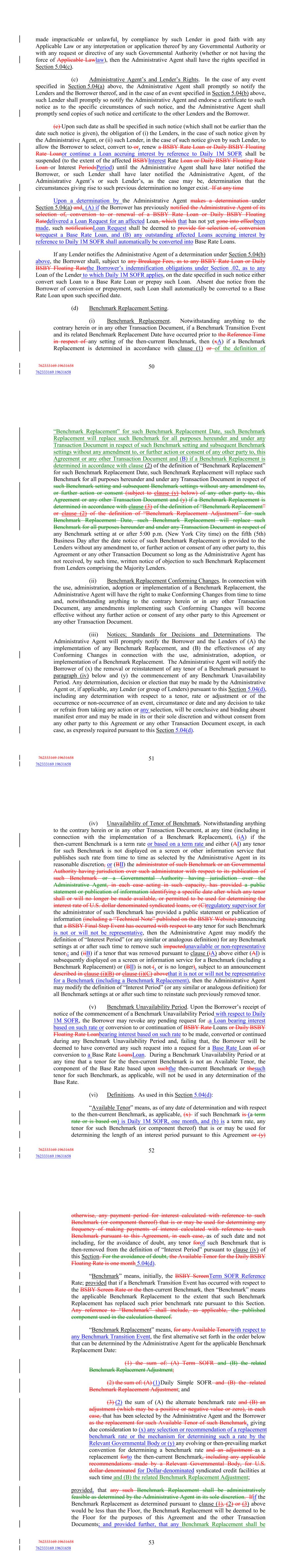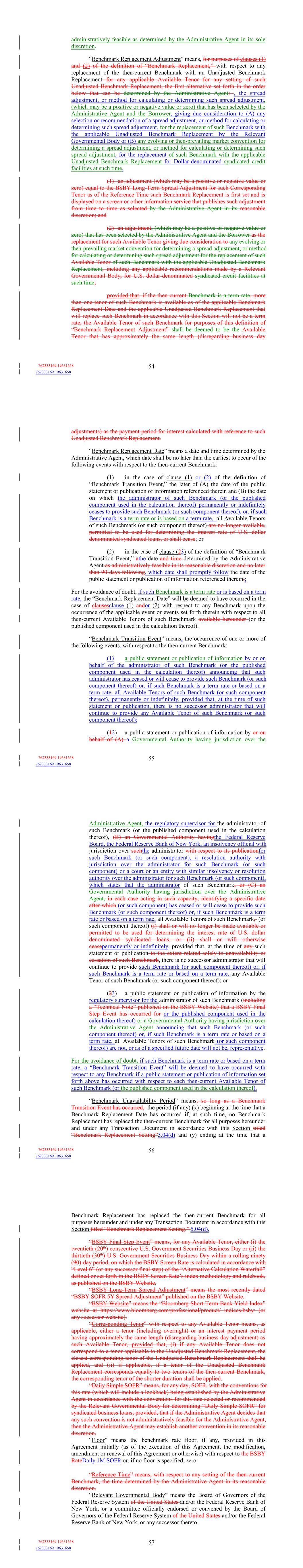 54762333169 19631658 762333169 19631658 administratively feasible as determined by the Administrative Agent in its sole discretion. “Benchmark Replacement Adjustment” means, for purposes of clauses (1) and (2) of the definition of “Benchmark Replacement,” with respect to any replacement of the then-current Benchmark with an Unadjusted Benchmark Replacement for any applicable Available Tenor for any setting of such Unadjusted Benchmark Replacement, the first alternative set forth in the order below that can be determined by the Administrative Agent: , the spread adjustment, or method for calculating or determining such spread adjustment, (which may be a positive or negative value or zero) that has been selected by the Administrative Agent and the Borrower, giving due consideration to (A) any selection or recommendation of a spread adjustment, or method for calculating or determining such spread adjustment, for the replacement of such Benchmark with the applicable Unadjusted Benchmark Replacement by the Relevant Governmental Body or (B) any evolving or then-prevailing market convention for determining a spread adjustment, or method for calculating or determining such spread adjustment, for the replacement of such Benchmark with the applicable Unadjusted Benchmark Replacement for Dollar-denominated syndicated credit facilities at such time. (1) an adjustment (which may be a positive or negative value or zero) equal to the BSBY Long-Term Spread Adjustment for such Corresponding Tenor as of the Reference Time such Benchmark Replacement is first set and is displayed on a screen or other information service that publishes such adjustment from time to time as selected by the Administrative Agent in its reasonable discretion; and (2) an adjustment, (which may be a positive or negative value or zero) that has been selected by the Administrative Agent and the Borrower as the replacement for such Available Tenor giving due consideration to any evolving or then-prevailing market convention for determining a spread adjustment, or method for calculating or determining such spread adjustment for the replacement of such Available Tenor of such Benchmark with the applicable Unadjusted Benchmark Replacement, including any applicable recommendations made by a Relevant Governmental Body, for U.S. dollar-denominated syndicated credit facilities at such time; provided that, if the then-current Benchmark is a term rate, more than one tenor of such Benchmark is available as of the applicable Benchmark Replacement Date and the applicable Unadjusted Benchmark Replacement that will replace such Benchmark in accordance with this Section will not be a term rate, the Available Tenor of such Benchmark for purposes of this definition of “Benchmark Replacement Adjustment” shall be deemed to be the Available Tenor that has approximately the same length (disregarding business day 55762333169 19631658 762333169 19631658 adjustments) as the payment period for interest calculated with reference to such Unadjusted Benchmark Replacement. “Benchmark Replacement Date” means a date and time determined by the Administrative Agent, which date shall be no later than the earliest to occur of the following events with respect to the then-current Benchmark: (1) in the case of clause (1) or (2) of the definition of “Benchmark Transition Event,” the later of (A) the date of the public statement or publication of information referenced therein and (B) the date on which the administrator of such Benchmark (or the published component used in the calculation thereof) permanently or indefinitely ceases to provide such Benchmark (or such component thereof), or, if such Benchmark is a term rate or is based on a term rate, all Available Tenors of such Benchmark (or such component thereof) are no longer available, permitted to be used for determining the interest rate of U.S. dollar denominated syndicated loans, or shall cease; or (2) in the case of clause (23) of the definition of “Benchmark Transition Event,” athe date and time determined by the Administrative Agent as administratively feasible in its reasonable discretion and no later than 90 days following, which date shall promptly follow the date of the public statement or publication of information referenced therein.; For the avoidance of doubt, if such Benchmark is a term rate or is based on a term rate, the “Benchmark Replacement Date” will be deemed to have occurred in the case of clausesclause (1) andor (2) with respect to any Benchmark upon the occurrence of the applicable event or events set forth therein with respect to all then-current Available Tenors of such Benchmark available hereunder (or the published component used in the calculation thereof). “Benchmark Transition Event” means, the occurrence of one or more of the following events, with respect to the then-current Benchmark: (1) a public statement or publication of information by or on behalf of the administrator of such Benchmark (or the published component used in the calculation thereof) announcing that such administrator has ceased or will cease to provide such Benchmark (or such component thereof) or, if such Benchmark is a term rate or based on a term rate, all Available Tenors of such Benchmark (or such component thereof), permanently or indefinitely, provided that, at the time of such statement or publication, there is no successor administrator that will continue to provide any Available Tenor of such Benchmark (or such component thereof); (12) a public statement or publication of information by or on behalf of (A) a Governmental Authority having jurisdiction over the 56762333169 19631658 762333169 19631658 Administrative Agent, the regulatory supervisor for the administrator of such Benchmark (or the published component used in the calculation thereof), (B) an Governmental Authority havingthe Federal Reserve Board, the Federal Reserve Bank of New York, an insolvency official with ju