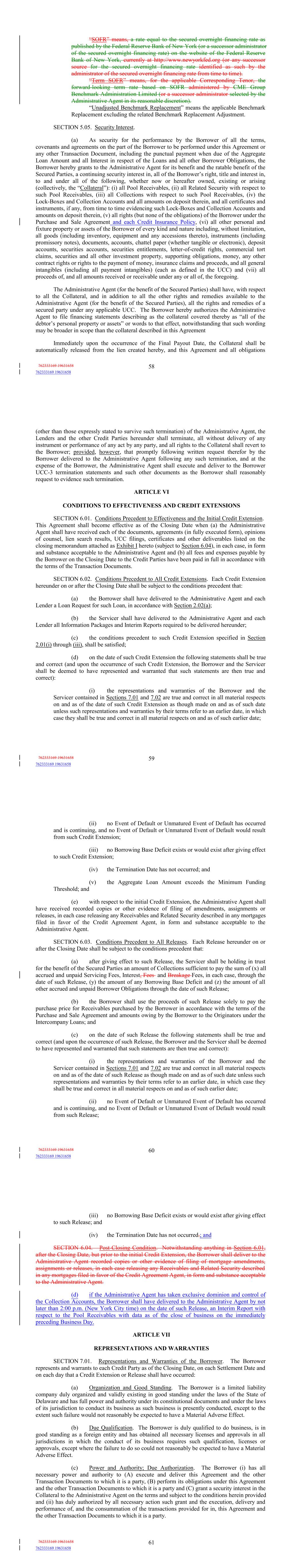 58762333169 19631658 762333169 19631658 “SOFR” means, a rate equal to the secured overnight financing rate as published by the Federal Reserve Bank of New York (or a successor administrator of the secured overnight financing rate) on the website of the Federal Reserve Bank of New York, currently at http://www.newyorkfed.org (or any successor source for the secured overnight financing rate identified as such by the administrator of the secured overnight financing rate from time to time). “Term SOFR” means, for the applicable Corresponding Tenor, the forward-looking term rate based on SOFR administered by CME Group Benchmark Administration Limited (or a successor administrator selected by the Administrative Agent in its reasonable discretion). “Unadjusted Benchmark Replacement” means the applicable Benchmark Replacement excluding the related Benchmark Replacement Adjustment. SECTION 5.05. Security Interest. (a) As security for the performance by the Borrower of all the terms, covenants and agreements on the part of the Borrower to be performed under this Agreement or any other Transaction Document, including the punctual payment when due of the Aggregate Loan Amount and all Interest in respect of the Loans and all other Borrower Obligations, the Borrower hereby grants to the Administrative Agent for its benefit and the ratable benefit of the Secured Parties, a continuing security interest in, all of the Borrower’s right, title and interest in, to and under all of the following, whether now or hereafter owned, existing or arising (collectively, the “Collateral”): (i) all Pool Receivables, (ii) all Related Security with respect to such Pool Receivables, (iii) all Collections with respect to such Pool Receivables, (iv) the Lock-Boxes and Collection Accounts and all amounts on deposit therein, and all certificates and instruments, if any, from time to time evidencing such Lock-Boxes and Collection Accounts and amounts on deposit therein, (v) all rights (but none of the obligations) of the Borrower under the Purchase and Sale Agreement and each Credit Insurance Policy, (vi) all other personal and fixture property or assets of the Borrower of every kind and nature including, without limitation, all goods (including inventory, equipment and any accessions thereto), instruments (including promissory notes), documents, accounts, chattel paper (whether tangible or electronic), deposit accounts, securities accounts, securities entitlements, letter-of-credit rights, commercial tort claims, securities and all other investment property, supporting obligations, money, any other contract rights or rights to the payment of money, insurance claims and proceeds, and all general intangibles (including all payment intangibles) (each as defined in the UCC) and (vii) all proceeds of, and all amounts received or receivable under any or all of, the foregoing. The Administrative Agent (for the benefit of the Secured Parties) shall have, with respect to all the Collateral, and in addition to all the other rights and remedies available to the Administrative Agent (for the benefit of the Secured Parties), all the rights and remedies of a secured party under any applicable UCC. The Borrower hereby authorizes the Administrative Agent to file financing statements describing as the collateral covered thereby as “all of the debtor’s personal property or assets” or words to that effect, notwithstanding that such wording may be broader in scope than the collateral described in this Agreement Immediately upon the occurrence of the Final Payout Date, the Collateral shall be automatically released from the lien created hereby, and this Agreement and all obligations 59762333169 19631658 762333169 19631658 (other than those expressly stated to survive such termination) of the Administrative Agent, the Lenders and the other Credit Parties hereunder shall terminate, all without delivery of any instrument or performance of any act by any party, and all rights to the Collateral shall revert to the Borrower; provided, however, that promptly following written request therefor by the Borrower delivered to the Administrative Agent following any such termination, and at the expense of the Borrower, the Administrative Agent shall execute and deliver to the Borrower UCC-3 termination statements and such other documents as the Borrower shall reasonably request to evidence such termination. ARTICLE VI CONDITIONS TO EFFECTIVENESS AND CREDIT EXTENSIONS SECTION 6.01. Conditions Precedent to Effectiveness and the Initial Credit Extension. This Agreement shall become effective as of the Closing Date when (a) the Administrative Agent shall have received each of the documents, agreements (in fully executed form), opinions of counsel, lien search results, UCC filings, certificates and other deliverables listed on the closing memorandum attached as Exhibit I hereto (subject to Section 6.04), in each case, in form and substance acceptable to the Administrative Agent and (b) all fees and expenses payable by the Borrower on the Closing Date to the Credit Parties have been paid in full in accordance with the terms of the Transaction Documents. SECTION 6.02. Conditions Precedent to All Credit Extensions. Each Credit Extension hereunder on or after the Closing Date shall be subject to the conditions precedent that: (a) the Borrower shall have delivered to the Administrative Agent and each Lender a Loan Request for such Loan, in accordance with Section 2.02(a); (b) the Servicer shall have delivered to the Administrative Agent and each Lender all Information Packages and Interim Reports required to be delivered hereunder; (c) the conditions precedent to such Credit Extension specified in Section 2.01(i) through (iii), shall be satisfied; (d) on the date of such Credit Extension the following statements shall be true and correct (and upon the occurrence of such Credit Extension, the Borrower and the Servicer shall be deemed to have repr