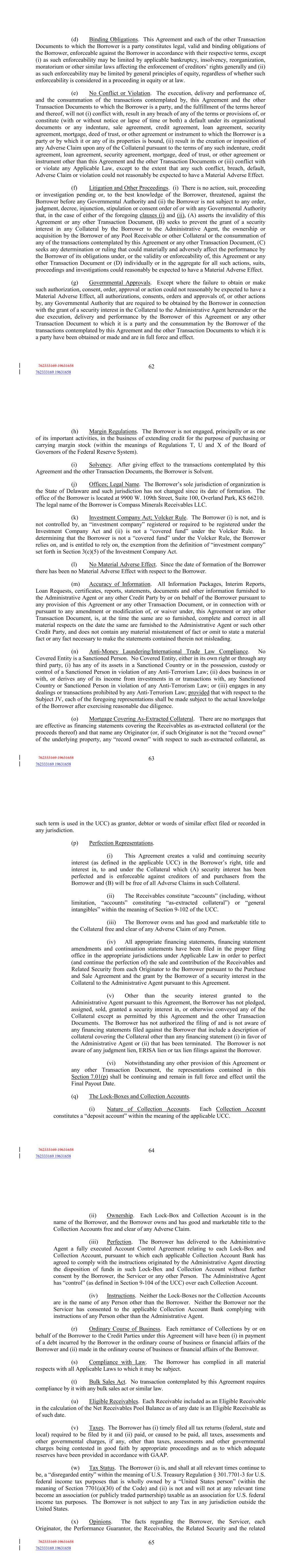 62762333169 19631658 762333169 19631658 (d) Binding Obligations. This Agreement and each of the other Transaction Documents to which the Borrower is a party constitutes legal, valid and binding obligations of the Borrower, enforceable against the Borrower in accordance with their respective terms, except (i) as such enforceability may be limited by applicable bankruptcy, insolvency, reorganization, moratorium or other similar laws affecting the enforcement of creditors’ rights generally and (ii) as such enforceability may be limited by general principles of equity, regardless of whether such enforceability is considered in a proceeding in equity or at law. (e) No Conflict or Violation. The execution, delivery and performance of, and the consummation of the transactions contemplated by, this Agreement and the other Transaction Documents to which the Borrower is a party, and the fulfillment of the terms hereof and thereof, will not (i) conflict with, result in any breach of any of the terms or provisions of, or constitute (with or without notice or lapse of time or both) a default under its organizational documents or any indenture, sale agreement, credit agreement, loan agreement, security agreement, mortgage, deed of trust, or other agreement or instrument to which the Borrower is a party or by which it or any of its properties is bound, (ii) result in the creation or imposition of any Adverse Claim upon any of the Collateral pursuant to the terms of any such indenture, credit agreement, loan agreement, security agreement, mortgage, deed of trust, or other agreement or instrument other than this Agreement and the other Transaction Documents or (iii) conflict with or violate any Applicable Law, except to the extent that any such conflict, breach, default, Adverse Claim or violation could not reasonably be expected to have a Material Adverse Effect. (f) Litigation and Other Proceedings. (i) There is no action, suit, proceeding or investigation pending or, to the best knowledge of the Borrower, threatened, against the Borrower before any Governmental Authority and (ii) the Borrower is not subject to any order, judgment, decree, injunction, stipulation or consent order of or with any Governmental Authority that, in the case of either of the foregoing clauses (i) and (ii), (A) asserts the invalidity of this Agreement or any other Transaction Document, (B) seeks to prevent the grant of a security interest in any Collateral by the Borrower to the Administrative Agent, the ownership or acquisition by the Borrower of any Pool Receivable or other Collateral or the consummation of any of the transactions contemplated by this Agreement or any other Transaction Document, (C) seeks any determination or ruling that could materially and adversely affect the performance by the Borrower of its obligations under, or the validity or enforceability of, this Agreement or any other Transaction Document or (D) individually or in the aggregate for all such actions, suits, proceedings and investigations could reasonably be expected to have a Material Adverse Effect. (g) Governmental Approvals. Except where the failure to obtain or make such authorization, consent, order, approval or action could not reasonably be expected to have a Material Adverse Effect, all authorizations, consents, orders and approvals of, or other actions by, any Governmental Authority that are required to be obtained by the Borrower in connection with the grant of a security interest in the Collateral to the Administrative Agent hereunder or the due execution, delivery and performance by the Borrower of this Agreement or any other Transaction Document to which it is a party and the consummation by the Borrower of the transactions contemplated by this Agreement and the other Transaction Documents to which it is a party have been obtained or made and are in full force and effect. 63762333169 19631658 762333169 19631658 (h) Margin Regulations. The Borrower is not engaged, principally or as one of its important activities, in the business of extending credit for the purpose of purchasing or carrying margin stock (within the meanings of Regulations T, U and X of the Board of Governors of the Federal Reserve System). (i) Solvency. After giving effect to the transactions contemplated by this Agreement and the other Transaction Documents, the Borrower is Solvent. (j) Offices; Legal Name. The Borrower’s sole jurisdiction of organization is the State of Delaware and such jurisdiction has not changed since its date of formation. The office of the Borrower is located at 9900 W. 109th Street, Suite 100, Overland Park, KS 66210. The legal name of the Borrower is Compass Minerals Receivables LLC. (k) Investment Company Act; Volcker Rule. The Borrower (i) is not, and is not controlled by, an “investment company” registered or required to be registered under the Investment Company Act and (ii) is not a “covered fund” under the Volcker Rule. In determining that the Borrower is not a “covered fund” under the Volcker Rule, the Borrower relies on, and is entitled to rely on, the exemption from the definition of “investment company” set forth in Section 3(c)(5) of the Investment Company Act. (l) No Material Adverse Effect. Since the date of formation of the Borrower there has been no Material Adverse Effect with respect to the Borrower. (m) Accuracy of Information. All Information Packages, Interim Reports, Loan Requests, certificates, reports, statements, documents and other information furnished to the Administrative Agent or any other Credit Party by or on behalf of the Borrower pursuant to any provision of this Agreement or any other Transaction Document, or in connection with or pursuant to any amendment or modification of, or waiver under, this Agreement or any other Transaction Document, is, at the time the same are so furnished, complete and correct in all material respects on the date the same are furnished to the Administrative Agen