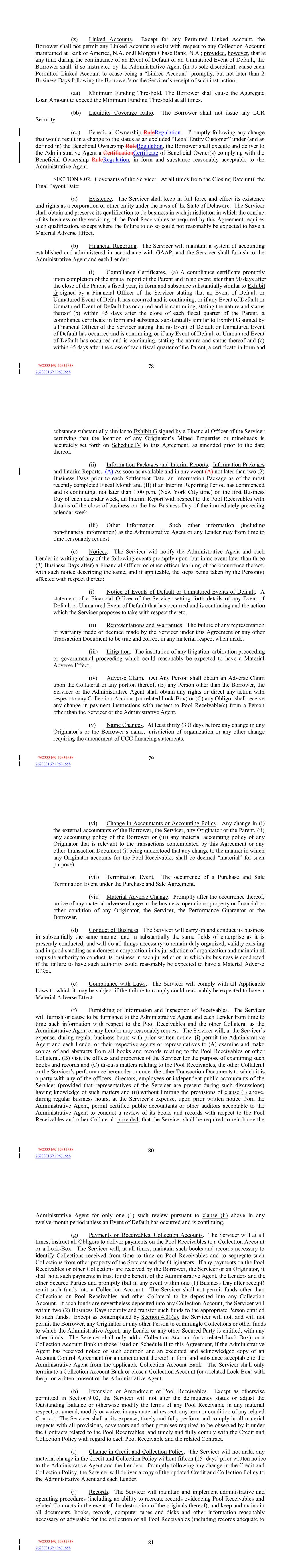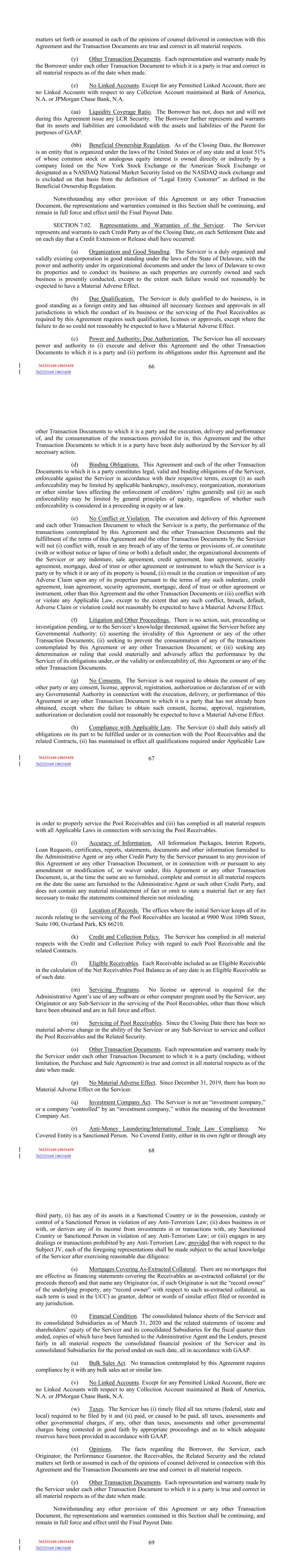 66762333169 19631658 762333169 19631658 matters set forth or assumed in each of the opinions of counsel delivered in connection with this Agreement and the Transaction Documents are true and correct in all material respects. (y) Other Transaction Documents. Each representation and warranty made by the Borrower under each other Transaction Document to which it is a party is true and correct in all material respects as of the date when made. (z) No Linked Accounts. Except for any Permitted Linked Account, there are no Linked Accounts with respect to any Collection Account maintained at Bank of America, N.A. or JPMorgan Chase Bank, N.A. (aa) Liquidity Coverage Ratio. The Borrower has not, does not and will not during this Agreement issue any LCR Security. The Borrower further represents and warrants that its assets and liabilities are consolidated with the assets and liabilities of the Parent for purposes of GAAP. (bb) Beneficial Ownership Regulation. As of the Closing Date, the Borrower is an entity that is organized under the laws of the United States or of any state and at least 51% of whose common stock or analogous equity interest is owned directly or indirectly by a company listed on the New York Stock Exchange or the American Stock Exchange or designated as a NASDAQ National Market Security listed on the NASDAQ stock exchange and is excluded on that basis from the definition of “Legal Entity Customer” as defined in the Beneficial Ownership Regulation. Notwithstanding any other provision of this Agreement or any other Transaction Document, the representations and warranties contained in this Section shall be continuing, and remain in full force and effect until the Final Payout Date. SECTION 7.02. Representations and Warranties of the Servicer. The Servicer represents and warrants to each Credit Party as of the Closing Date, on each Settlement Date and on each day that a Credit Extension or Release shall have occurred: (a) Organization and Good Standing. The Servicer is a duly organized and validly existing corporation in good standing under the laws of the State of Delaware, with the power and authority under its organizational documents and under the laws of Delaware to own its properties and to conduct its business as such properties are currently owned and such business is presently conducted, except to the extent such failure would not reasonably be expected to have a Material Adverse Effect. (b) Due Qualification. The Servicer is duly qualified to do business, is in good standing as a foreign entity and has obtained all necessary licenses and approvals in all jurisdictions in which the conduct of its business or the servicing of the Pool Receivables as required by this Agreement requires such qualification, licenses or approvals, except where the failure to do so could not reasonably be expected to have a Material Adverse Effect. (c) Power and Authority; Due Authorization. The Servicer has all necessary power and authority to (i) execute and deliver this Agreement and the other Transaction Documents to which it is a party and (ii) perform its obligations under this Agreement and the 67762333169 19631658 762333169 19631658 other Transaction Documents to which it is a party and the execution, delivery and performance of, and the consummation of the transactions provided for in, this Agreement and the other Transaction Documents to which it is a party have been duly authorized by the Servicer by all necessary action. (d) Binding Obligations. This Agreement and each of the other Transaction Documents to which it is a party constitutes legal, valid and binding obligations of the Servicer, enforceable against the Servicer in accordance with their respective terms, except (i) as such enforceability may be limited by applicable bankruptcy, insolvency, reorganization, moratorium or other similar laws affecting the enforcement of creditors’ rights generally and (ii) as such enforceability may be limited by general principles of equity, regardless of whether such enforceability is considered in a proceeding in equity or at law. (e) No Conflict or Violation. The execution and delivery of this Agreement and each other Transaction Document to which the Servicer is a party, the performance of the transactions contemplated by this Agreement and the other Transaction Documents and the fulfillment of the terms of this Agreement and the other Transaction Documents by the Servicer will not (i) conflict with, result in any breach of any of the terms or provisions of, or constitute (with or without notice or lapse of time or both) a default under, the organizational documents of the Servicer or any indenture, sale agreement, credit agreement, loan agreement, security agreement, mortgage, deed of trust or other agreement or instrument to which the Servicer is a party or by which it or any of its property is bound, (ii) result in the creation or imposition of any Adverse Claim upon any of its properties pursuant to the terms of any such indenture, credit agreement, loan agreement, security agreement, mortgage, deed of trust or other agreement or instrument, other than this Agreement and the other Transaction Documents or (iii) conflict with or violate any Applicable Law, except to the extent that any such conflict, breach, default, Adverse Claim or violation could not reasonably be expected to have a Material Adverse Effect. (f) Litigation and Other Proceedings. There is no action, suit, proceeding or investigation pending, or to the Servicer’s knowledge threatened, against the Servicer before any Governmental Authority: (i) asserting the invalidity of this Agreement or any of the other Transaction Documents; (ii) seeking to prevent the consummation of any of the transactions contemplated by this Agreement or any other Transaction Document; or (iii) seeking any determination or ruling that could materially and adversely affect the performance by the Servicer of its obligations under, or the val