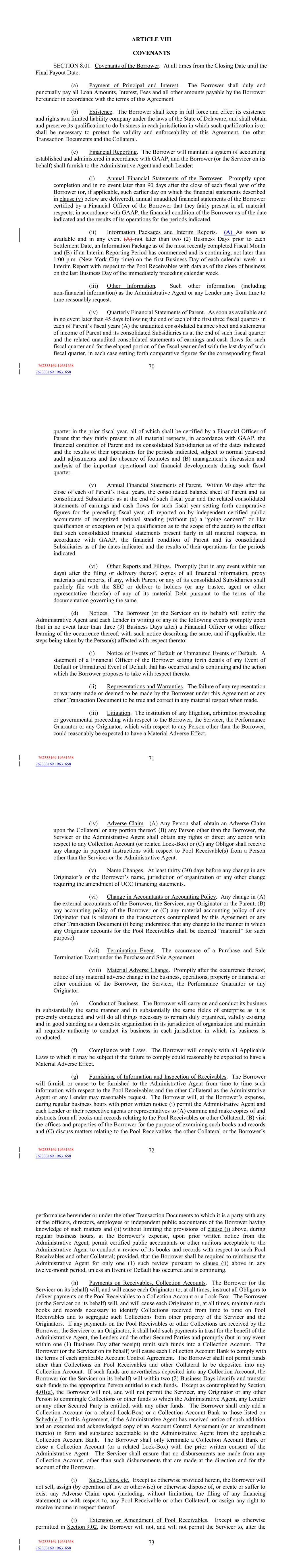 70762333169 19631658 762333169 19631658 ARTICLE VIII COVENANTS SECTION 8.01. Covenants of the Borrower. At all times from the Closing Date until the Final Payout Date: (a) Payment of Principal and Interest. The Borrower shall duly and punctually pay all Loan Amounts, Interest, Fees and all other amounts payable by the Borrower hereunder in accordance with the terms of this Agreement. (b) Existence. The Borrower shall keep in full force and effect its existence and rights as a limited liability company under the laws of the State of Delaware, and shall obtain and preserve its qualification to do business in each jurisdiction in which such qualification is or shall be necessary to protect the validity and enforceability of this Agreement, the other Transaction Documents and the Collateral. (c) Financial Reporting. The Borrower will maintain a system of accounting established and administered in accordance with GAAP, and the Borrower (or the Servicer on its behalf) shall furnish to the Administrative Agent and each Lender: (i) Annual Financial Statements of the Borrower. Promptly upon completion and in no event later than 90 days after the close of each fiscal year of the Borrower (or, if applicable, such earlier day on which the financial statements described in clause (v) below are delivered), annual unaudited financial statements of the Borrower certified by a Financial Officer of the Borrower that they fairly present in all material respects, in accordance with GAAP, the financial condition of the Borrower as of the date indicated and the results of its operations for the periods indicated. (ii) Information Packages and Interim Reports. (A) As soon as available and in any event (A) not later than two (2) Business Days prior to each Settlement Date, an Information Package as of the most recently completed Fiscal Month and (B) if an Interim Reporting Period has commenced and is continuing, not later than 1:00 p.m. (New York City time) on the first Business Day of each calendar week, an Interim Report with respect to the Pool Receivables with data as of the close of business on the last Business Day of the immediately preceding calendar week. (iii) Other Information. Such other information (including non-financial information) as the Administrative Agent or any Lender may from time to time reasonably request. (iv) Quarterly Financial Statements of Parent. As soon as available and in no event later than 45 days following the end of each of the first three fiscal quarters in each of Parent’s fiscal years (A) the unaudited consolidated balance sheet and statements of income of Parent and its consolidated Subsidiaries as at the end of such fiscal quarter and the related unaudited consolidated statements of earnings and cash flows for such fiscal quarter and for the elapsed portion of the fiscal year ended with the last day of such fiscal quarter, in each case setting forth comparative figures for the corresponding fiscal 71762333169 19631658 762333169 19631658 quarter in the prior fiscal year, all of which shall be certified by a Financial Officer of Parent that they fairly present in all material respects, in accordance with GAAP, the financial condition of Parent and its consolidated Subsidiaries as of the dates indicated and the results of their operations for the periods indicated, subject to normal year-end audit adjustments and the absence of footnotes and (B) management’s discussion and analysis of the important operational and financial developments during such fiscal quarter. (v) Annual Financial Statements of Parent. Within 90 days after the close of each of Parent’s fiscal years, the consolidated balance sheet of Parent and its consolidated Subsidiaries as at the end of such fiscal year and the related consolidated statements of earnings and cash flows for such fiscal year setting forth comparative figures for the preceding fiscal year, all reported on by independent certified public accountants of recognized national standing (without (x) a “going concern” or like qualification or exception or (y) a qualification as to the scope of the audit) to the effect that such consolidated financial statements present fairly in all material respects, in accordance with GAAP, the financial condition of Parent and its consolidated Subsidiaries as of the dates indicated and the results of their operations for the periods indicated. (vi) Other Reports and Filings. Promptly (but in any event within ten days) after the filing or delivery thereof, copies of all financial information, proxy materials and reports, if any, which Parent or any of its consolidated Subsidiaries shall publicly file with the SEC or deliver to holders (or any trustee, agent or other representative therefor) of any of its material Debt pursuant to the terms of the documentation governing the same. (d) Notices. The Borrower (or the Servicer on its behalf) will notify the Administrative Agent and each Lender in writing of any of the following events promptly upon (but in no event later than three (3) Business Days after) a Financial Officer or other officer learning of the occurrence thereof, with such notice describing the same, and if applicable, the steps being taken by the Person(s) affected with respect thereto: (i) Notice of Events of Default or Unmatured Events of Default. A statement of a Financial Officer of the Borrower setting forth details of any Event of Default or Unmatured Event of Default that has occurred and is continuing and the action which the Borrower proposes to take with respect thereto. (ii) Representations and Warranties. The failure of any representation or warranty made or deemed to be made by the Borrower under this Agreement or any other Transaction Document to be true and correct in any material respect when made. (iii) Litigation. The institution of any litigation, arbitration proceeding or governmental proceeding with respect to the Borrower, the Servicer, the Performance Guarantor or 