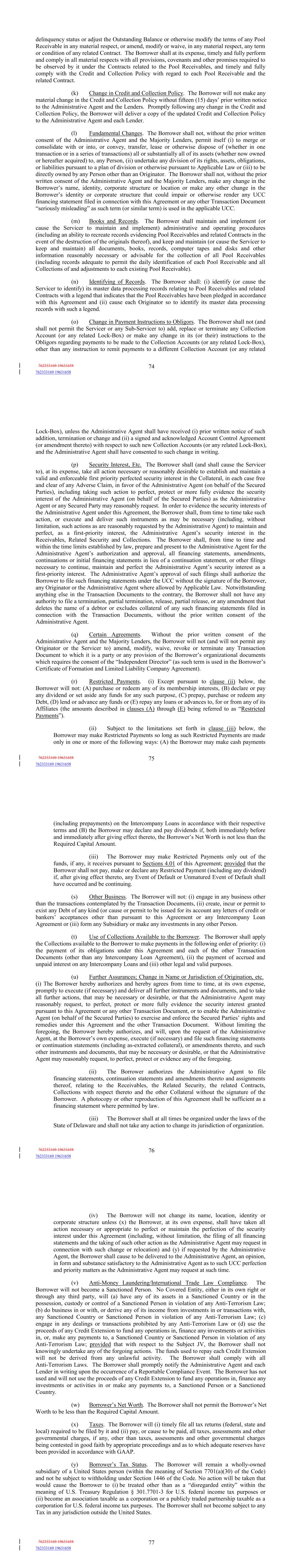 74762333169 19631658 762333169 19631658 delinquency status or adjust the Outstanding Balance or otherwise modify the terms of any Pool Receivable in any material respect, or amend, modify or waive, in any material respect, any term or condition of any related Contract. The Borrower shall at its expense, timely and fully perform and comply in all material respects with all provisions, covenants and other promises required to be observed by it under the Contracts related to the Pool Receivables, and timely and fully comply with the Credit and Collection Policy with regard to each Pool Receivable and the related Contract. (k) Change in Credit and Collection Policy. The Borrower will not make any material change in the Credit and Collection Policy without fifteen (15) days’ prior written notice to the Administrative Agent and the Lenders. Promptly following any change in the Credit and Collection Policy, the Borrower will deliver a copy of the updated Credit and Collection Policy to the Administrative Agent and each Lender. (l) Fundamental Changes. The Borrower shall not, without the prior written consent of the Administrative Agent and the Majority Lenders, permit itself (i) to merge or consolidate with or into, or convey, transfer, lease or otherwise dispose of (whether in one transaction or in a series of transactions) all or substantially all of its assets (whether now owned or hereafter acquired) to, any Person, (ii) undertake any division of its rights, assets, obligations, or liabilities pursuant to a plan of division or otherwise pursuant to Applicable Law or (iii) to be directly owned by any Person other than an Originator. The Borrower shall not, without the prior written consent of the Administrative Agent and the Majority Lenders, make any change in the Borrower’s name, identity, corporate structure or location or make any other change in the Borrower’s identity or corporate structure that could impair or otherwise render any UCC financing statement filed in connection with this Agreement or any other Transaction Document “seriously misleading” as such term (or similar term) is used in the applicable UCC. (m) Books and Records. The Borrower shall maintain and implement (or cause the Servicer to maintain and implement) administrative and operating procedures (including an ability to recreate records evidencing Pool Receivables and related Contracts in the event of the destruction of the originals thereof), and keep and maintain (or cause the Servicer to keep and maintain) all documents, books, records, computer tapes and disks and other information reasonably necessary or advisable for the collection of all Pool Receivables (including records adequate to permit the daily identification of each Pool Receivable and all Collections of and adjustments to each existing Pool Receivable). (n) Identifying of Records. The Borrower shall: (i) identify (or cause the Servicer to identify) its master data processing records relating to Pool Receivables and related Contracts with a legend that indicates that the Pool Receivables have been pledged in accordance with this Agreement and (ii) cause each Originator so to identify its master data processing records with such a legend. (o) Change in Payment Instructions to Obligors. The Borrower shall not (and shall not permit the Servicer or any Sub-Servicer to) add, replace or terminate any Collection Account (or any related Lock-Box) or make any change in its (or their) instructions to the Obligors regarding payments to be made to the Collection Accounts (or any related Lock-Box), other than any instruction to remit payments to a different Collection Account (or any related 75762333169 19631658 762333169 19631658 Lock-Box), unless the Administrative Agent shall have received (i) prior written notice of such addition, termination or change and (ii) a signed and acknowledged Account Control Agreement (or amendment thereto) with respect to such new Collection Accounts (or any related Lock-Box), and the Administrative Agent shall have consented to such change in writing. (p) Security Interest, Etc. The Borrower shall (and shall cause the Servicer to), at its expense, take all action necessary or reasonably desirable to establish and maintain a valid and enforceable first priority perfected security interest in the Collateral, in each case free and clear of any Adverse Claim, in favor of the Administrative Agent (on behalf of the Secured Parties), including taking such action to perfect, protect or more fully evidence the security interest of the Administrative Agent (on behalf of the Secured Parties) as the Administrative Agent or any Secured Party may reasonably request. In order to evidence the security interests of the Administrative Agent under this Agreement, the Borrower shall, from time to time take such action, or execute and deliver such instruments as may be necessary (including, without limitation, such actions as are reasonably requested by the Administrative Agent) to maintain and perfect, as a first-priority interest, the Administrative Agent’s security interest in the Receivables, Related Security and Collections. The Borrower shall, from time to time and within the time limits established by law, prepare and present to the Administrative Agent for the Administrative Agent’s authorization and approval, all financing statements, amendments, continuations or initial financing statements in lieu of a continuation statement, or other filings necessary to continue, maintain and perfect the Administrative Agent’s security interest as a first-priority interest. The Administrative Agent’s approval of such filings shall authorize the Borrower to file such financing statements under the UCC without the signature of the Borrower, any Originator or the Administrative Agent where allowed by Applicable Law. Notwithstanding anything else in the Transaction Documents to the contrary, the Borrower shall not have any authority to file a 