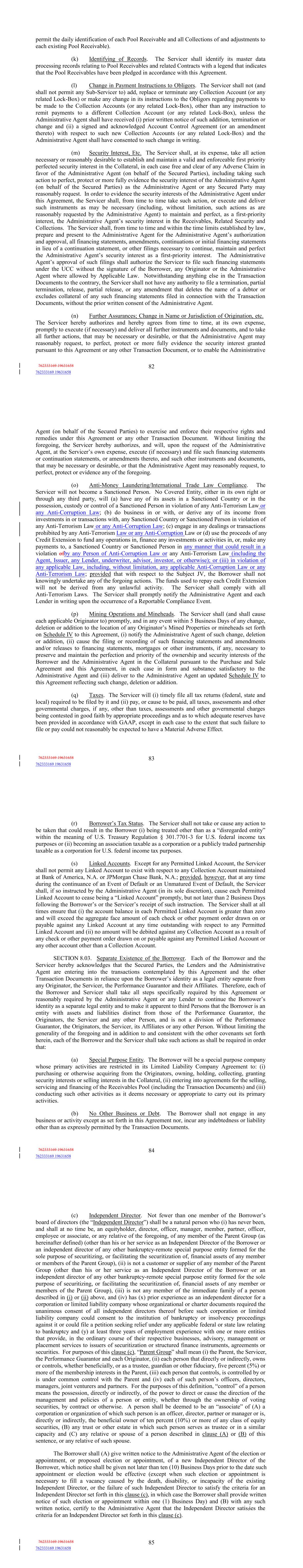 82762333169 19631658 762333169 19631658 permit the daily identification of each Pool Receivable and all Collections of and adjustments to each existing Pool Receivable). (k) Identifying of Records. The Servicer shall identify its master data processing records relating to Pool Receivables and related Contracts with a legend that indicates that the Pool Receivables have been pledged in accordance with this Agreement. (l) Change in Payment Instructions to Obligors. The Servicer shall not (and shall not permit any Sub-Servicer to) add, replace or terminate any Collection Account (or any related Lock-Box) or make any change in its instructions to the Obligors regarding payments to be made to the Collection Accounts (or any related Lock-Box), other than any instruction to remit payments to a different Collection Account (or any related Lock-Box), unless the Administrative Agent shall have received (i) prior written notice of such addition, termination or change and (ii) a signed and acknowledged Account Control Agreement (or an amendment thereto) with respect to such new Collection Accounts (or any related Lock-Box) and the Administrative Agent shall have consented to such change in writing. (m) Security Interest, Etc. The Servicer shall, at its expense, take all action necessary or reasonably desirable to establish and maintain a valid and enforceable first priority perfected security interest in the Collateral, in each case free and clear of any Adverse Claim in favor of the Administrative Agent (on behalf of the Secured Parties), including taking such action to perfect, protect or more fully evidence the security interest of the Administrative Agent (on behalf of the Secured Parties) as the Administrative Agent or any Secured Party may reasonably request. In order to evidence the security interests of the Administrative Agent under this Agreement, the Servicer shall, from time to time take such action, or execute and deliver such instruments as may be necessary (including, without limitation, such actions as are reasonably requested by the Administrative Agent) to maintain and perfect, as a first-priority interest, the Administrative Agent’s security interest in the Receivables, Related Security and Collections. The Servicer shall, from time to time and within the time limits established by law, prepare and present to the Administrative Agent for the Administrative Agent’s authorization and approval, all financing statements, amendments, continuations or initial financing statements in lieu of a continuation statement, or other filings necessary to continue, maintain and perfect the Administrative Agent’s security interest as a first-priority interest. The Administrative Agent’s approval of such filings shall authorize the Servicer to file such financing statements under the UCC without the signature of the Borrower, any Originator or the Administrative Agent where allowed by Applicable Law. Notwithstanding anything else in the Transaction Documents to the contrary, the Servicer shall not have any authority to file a termination, partial termination, release, partial release, or any amendment that deletes the name of a debtor or excludes collateral of any such financing statements filed in connection with the Transaction Documents, without the prior written consent of the Administrative Agent. (n) Further Assurances; Change in Name or Jurisdiction of Origination, etc. The Servicer hereby authorizes and hereby agrees from time to time, at its own expense, promptly to execute (if necessary) and deliver all further instruments and documents, and to take all further actions, that may be necessary or desirable, or that the Administrative Agent may reasonably request, to perfect, protect or more fully evidence the security interest granted pursuant to this Agreement or any other Transaction Document, or to enable the Administrative 83762333169 19631658 762333169 19631658 Agent (on behalf of the Secured Parties) to exercise and enforce their respective rights and remedies under this Agreement or any other Transaction Document. Without limiting the foregoing, the Servicer hereby authorizes, and will, upon the request of the Administrative Agent, at the Servicer’s own expense, execute (if necessary) and file such financing statements or continuation statements, or amendments thereto, and such other instruments and documents, that may be necessary or desirable, or that the Administrative Agent may reasonably request, to perfect, protect or evidence any of the foregoing. (o) Anti-Money Laundering/International Trade Law Compliance. The Servicer will not become a Sanctioned Person. No Covered Entity, either in its own right or through any third party, will (a) have any of its assets in a Sanctioned Country or in the possession, custody or control of a Sanctioned Person in violation of any Anti-Terrorism Law or any Anti-Corruption Law; (b) do business in or with, or derive any of its income from investments in or transactions with, any Sanctioned Country or Sanctioned Person in violation of any Anti-Terrorism Law or any Anti-Corruption Law; (c) engage in any dealings or transactions prohibited by any Anti-Terrorism Law or any Anti-Corruption Law or (d) use the proceeds of any Credit Extension to fund any operations in, finance any investments or activities in, or, make any payments to, a Sanctioned Country or Sanctioned Person in any manner that could result in a violation ofby any Person of Anti-Corruption Law or any Anti-Terrorism Law (including the Agent, Issuer, any Lender, underwriter, advisor, investor, or otherwise); or (iii) in violation of any applicable Law, including, without limitation, any applicable Anti-Corruption Law or any Anti-Terrorism Law; provided that with respect to the Subject JV, the Borrower shall not knowingly undertake any of the forgoing actions. The funds used to repay each Credit Extension will not be derived from any unlawful activity. The Servicer shall comply