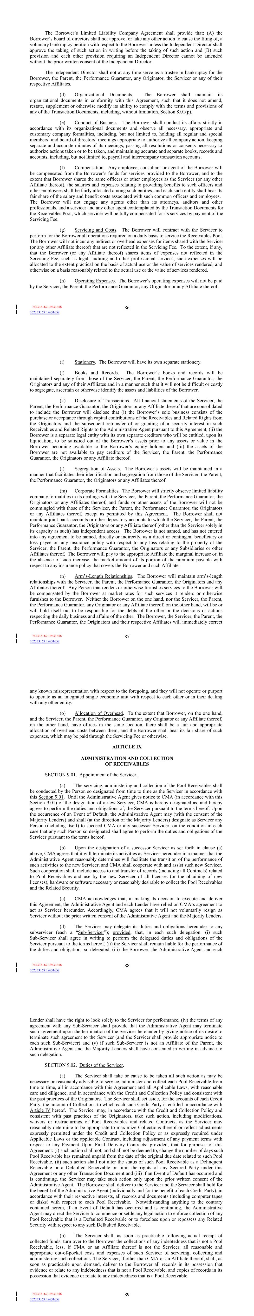 86762333169 19631658 762333169 19631658 The Borrower’s Limited Liability Company Agreement shall provide that: (A) the Borrower’s board of directors shall not approve, or take any other action to cause the filing of, a voluntary bankruptcy petition with respect to the Borrower unless the Independent Director shall approve the taking of such action in writing before the taking of such action and (B) such provision and each other provision requiring an Independent Director cannot be amended without the prior written consent of the Independent Director. The Independent Director shall not at any time serve as a trustee in bankruptcy for the Borrower, the Parent, the Performance Guarantor, any Originator, the Servicer or any of their respective Affiliates. (d) Organizational Documents. The Borrower shall maintain its organizational documents in conformity with this Agreement, such that it does not amend, restate, supplement or otherwise modify its ability to comply with the terms and provisions of any of the Transaction Documents, including, without limitation, Section 8.01(p). (e) Conduct of Business. The Borrower shall conduct its affairs strictly in accordance with its organizational documents and observe all necessary, appropriate and customary company formalities, including, but not limited to, holding all regular and special members’ and board of directors’ meetings appropriate to authorize all company action, keeping separate and accurate minutes of its meetings, passing all resolutions or consents necessary to authorize actions taken or to be taken, and maintaining accurate and separate books, records and accounts, including, but not limited to, payroll and intercompany transaction accounts. (f) Compensation. Any employee, consultant or agent of the Borrower will be compensated from the Borrower’s funds for services provided to the Borrower, and to the extent that Borrower shares the same officers or other employees as the Servicer (or any other Affiliate thereof), the salaries and expenses relating to providing benefits to such officers and other employees shall be fairly allocated among such entities, and each such entity shall bear its fair share of the salary and benefit costs associated with such common officers and employees. The Borrower will not engage any agents other than its attorneys, auditors and other professionals, and a servicer and any other agent contemplated by the Transaction Documents for the Receivables Pool, which servicer will be fully compensated for its services by payment of the Servicing Fee. (g) Servicing and Costs. The Borrower will contract with the Servicer to perform for the Borrower all operations required on a daily basis to service the Receivables Pool. The Borrower will not incur any indirect or overhead expenses for items shared with the Servicer (or any other Affiliate thereof) that are not reflected in the Servicing Fee. To the extent, if any, that the Borrower (or any Affiliate thereof) shares items of expenses not reflected in the Servicing Fee, such as legal, auditing and other professional services, such expenses will be allocated to the extent practical on the basis of actual use or the value of services rendered, and otherwise on a basis reasonably related to the actual use or the value of services rendered. (h) Operating Expenses. The Borrower’s operating expenses will not be paid by the Servicer, the Parent, the Performance Guarantor, any Originator or any Affiliate thereof. 87762333169 19631658 762333169 19631658 (i) Stationery. The Borrower will have its own separate stationery. (j) Books and Records. The Borrower’s books and records will be maintained separately from those of the Servicer, the Parent, the Performance Guarantor, the Originators and any of their Affiliates and in a manner such that it will not be difficult or costly to segregate, ascertain or otherwise identify the assets and liabilities of the Borrower. (k) Disclosure of Transactions. All financial statements of the Servicer, the Parent, the Performance Guarantor, the Originators or any Affiliate thereof that are consolidated to include the Borrower will disclose that (i) the Borrower’s sole business consists of the purchase or acceptance through capital contributions of the Receivables and Related Rights from the Originators and the subsequent retransfer of or granting of a security interest in such Receivables and Related Rights to the Administrative Agent pursuant to this Agreement, (ii) the Borrower is a separate legal entity with its own separate creditors who will be entitled, upon its liquidation, to be satisfied out of the Borrower’s assets prior to any assets or value in the Borrower becoming available to the Borrower’s equity holders and (iii) the assets of the Borrower are not available to pay creditors of the Servicer, the Parent, the Performance Guarantor, the Originators or any Affiliate thereof. (l) Segregation of Assets. The Borrower’s assets will be maintained in a manner that facilitates their identification and segregation from those of the Servicer, the Parent, the Performance Guarantor, the Originators or any Affiliates thereof. (m) Corporate Formalities. The Borrower will strictly observe limited liability company formalities in its dealings with the Servicer, the Parent, the Performance Guarantor, the Originators or any Affiliates thereof, and funds or other assets of the Borrower will not be commingled with those of the Servicer, the Parent, the Performance Guarantor, the Originators or any Affiliates thereof, except as permitted by this Agreement. The Borrower shall not maintain joint bank accounts or other depository accounts to which the Servicer, the Parent, the Performance Guarantor, the Originators or any Affiliate thereof (other than the Servicer solely in its capacity as such) has independent access. The Borrower is not named, and has not entered into any agreement to be named, directly or indirectly, as a direct or