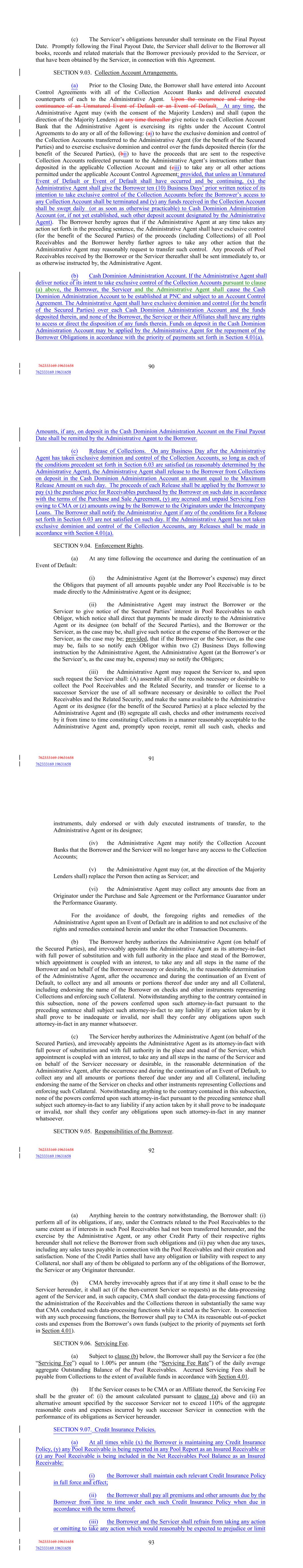 90762333169 19631658 762333169 19631658 (c) The Servicer’s obligations hereunder shall terminate on the Final Payout Date. Promptly following the Final Payout Date, the Servicer shall deliver to the Borrower all books, records and related materials that the Borrower previously provided to the Servicer, or that have been obtained by the Servicer, in connection with this Agreement. SECTION 9.03. Collection Account Arrangements. (a) Prior to the Closing Date, the Borrower shall have entered into Account Control Agreements with all of the Collection Account Banks and delivered executed counterparts of each to the Administrative Agent. Upon the occurrence and during the continuance of an Unmatured Event of Default or an Event of Default. At any time, the Administrative Agent may (with the consent of the Majority Lenders) and shall (upon the direction of the Majority Lenders) at any time thereafter give notice to each Collection Account Bank that the Administrative Agent is exercising its rights under the Account Control Agreements to do any or all of the following: (ai) to have the exclusive dominion and control of the Collection Accounts transferred to the Administrative Agent (for the benefit of the Secured Parties) and to exercise exclusive dominion and control over the funds deposited therein (for the benefit of the Secured Parties), (bii) to have the proceeds that are sent to the respective Collection Accounts redirected pursuant to the Administrative Agent’s instructions rather than deposited in the applicable Collection Account and (ciii) to take any or all other actions permitted under the applicable Account Control Agreement; provided, that unless an Unmatured Event of Default or Event of Default shall have occurred and be continuing, (x) the Administrative Agent shall give the Borrower ten (10) Business Days’ prior written notice of its intention to take exclusive control of the Collection Accounts before the Borrower’s access to any Collection Account shall be terminated and (y) any funds received in the Collection Account shall be swept daily (or as soon as otherwise practicable) to Cash Dominion Administration Account (or, if not yet established, such other deposit account designated by the Administrative Agent). The Borrower hereby agrees that if the Administrative Agent at any time takes any action set forth in the preceding sentence, the Administrative Agent shall have exclusive control (for the benefit of the Secured Parties) of the proceeds (including Collections) of all Pool Receivables and the Borrower hereby further agrees to take any other action that the Administrative Agent may reasonably request to transfer such control. Any proceeds of Pool Receivables received by the Borrower or the Servicer thereafter shall be sent immediately to, or as otherwise instructed by, the Administrative Agent. (b) Cash Dominion Administration Account. If the Administrative Agent shall deliver notice of its intent to take exclusive control of the Collection Accounts pursuant to clause (a) above, the Borrower, the Servicer and the Administrative Agent shall cause the Cash Dominion Administration Account to be established at PNC and subject to an Account Control Agreement. The Administrative Agent shall have exclusive dominion and control (for the benefit of the Secured Parties) over each Cash Dominion Administration Account and the funds deposited therein, and none of the Borrower, the Servicer or their Affiliates shall have any rights to access or direct the disposition of any funds therein. Funds on deposit in the Cash Dominion Administration Account may be applied by the Administrative Agent for the repayment of the Borrower Obligations in accordance with the priority of payments set forth in Section 4.01(a). 91762333169 19631658 762333169 19631658 Amounts, if any, on deposit in the Cash Dominion Administration Account on the Final Payout Date shall be remitted by the Administrative Agent to the Borrower. (c) Release of Collections. On any Business Day after the Administrative Agent has taken exclusive dominion and control of the Collection Accounts, so long as each of the conditions precedent set forth in Section 6.03 are satisfied (as reasonably determined by the Administrative Agent), the Administrative Agent shall release to the Borrower from Collections on deposit in the Cash Dominion Administration Account an amount equal to the Maximum Release Amount on such day. The proceeds of each Release shall be applied by the Borrower to pay (x) the purchase price for Receivables purchased by the Borrower on such date in accordance with the terms of the Purchase and Sale Agreement, (y) any accrued and unpaid Servicing Fees owing to CMA or (z) amounts owing by the Borrower to the Originators under the Intercompany Loans. The Borrower shall notify the Administrative Agent if any of the conditions for a Release set forth in Section 6.03 are not satisfied on such day. If the Administrative Agent has not taken exclusive dominion and control of the Collection Accounts, any Releases shall be made in accordance with Section 4.01(a). SECTION 9.04. Enforcement Rights. (a) At any time following the occurrence and during the continuation of an Event of Default: (i) the Administrative Agent (at the Borrower’s expense) may direct the Obligors that payment of all amounts payable under any Pool Receivable is to be made directly to the Administrative Agent or its designee; (ii) the Administrative Agent may instruct the Borrower or the Servicer to give notice of the Secured Parties’ interest in Pool Receivables to each Obligor, which notice shall direct that payments be made directly to the Administrative Agent or its designee (on behalf of the Secured Parties), and the Borrower or the Servicer, as the case may be, shall give such notice at the expense of the Borrower or the Servicer, as the case may be; provided, that if the Borrower or the Servicer, as the case may be, fails to so notify each Ob