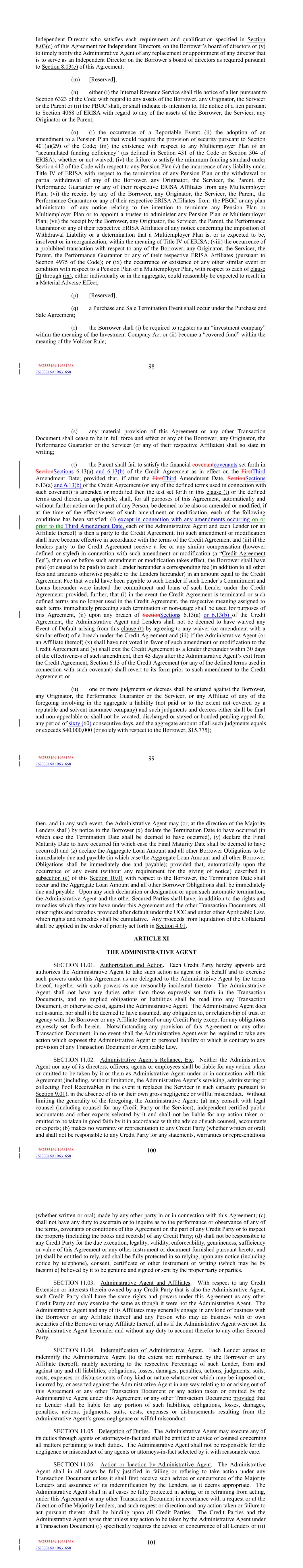 98762333169 19631658 762333169 19631658 Independent Director who satisfies each requirement and qualification specified in Section 8.03(c) of this Agreement for Independent Directors, on the Borrower’s board of directors or (y) to timely notify the Administrative Agent of any replacement or appointment of any director that is to serve as an Independent Director on the Borrower’s board of directors as required pursuant to Section 8.03(c) of this Agreement; (m) [Reserved]; (n) either (i) the Internal Revenue Service shall file notice of a lien pursuant to Section 6323 of the Code with regard to any assets of the Borrower, any Originator, the Servicer or the Parent or (ii) the PBGC shall, or shall indicate its intention to, file notice of a lien pursuant to Section 4068 of ERISA with regard to any of the assets of the Borrower, the Servicer, any Originator or the Parent; (o) (i) the occurrence of a Reportable Event; (ii) the adoption of an amendment to a Pension Plan that would require the provision of security pursuant to Section 401(a)(29) of the Code; (iii) the existence with respect to any Multiemployer Plan of an “accumulated funding deficiency” (as defined in Section 431 of the Code or Section 304 of ERISA), whether or not waived; (iv) the failure to satisfy the minimum funding standard under Section 412 of the Code with respect to any Pension Plan (v) the incurrence of any liability under Title IV of ERISA with respect to the termination of any Pension Plan or the withdrawal or partial withdrawal of any of the Borrower, any Originator, the Servicer, the Parent, the Performance Guarantor or any of their respective ERISA Affiliates from any Multiemployer Plan; (vi) the receipt by any of the Borrower, any Originator, the Servicer, the Parent, the Performance Guarantor or any of their respective ERISA Affiliates from the PBGC or any plan administrator of any notice relating to the intention to terminate any Pension Plan or Multiemployer Plan or to appoint a trustee to administer any Pension Plan or Multiemployer Plan; (vii) the receipt by the Borrower, any Originator, the Servicer, the Parent, the Performance Guarantor or any of their respective ERISA Affiliates of any notice concerning the imposition of Withdrawal Liability or a determination that a Multiemployer Plan is, or is expected to be, insolvent or in reorganization, within the meaning of Title IV of ERISA; (viii) the occurrence of a prohibited transaction with respect to any of the Borrower, any Originator, the Servicer, the Parent, the Performance Guarantor or any of their respective ERISA Affiliates (pursuant to Section 4975 of the Code); or (ix) the occurrence or existence of any other similar event or condition with respect to a Pension Plan or a Multiemployer Plan, with respect to each of clause (i) through (ix), either individually or in the aggregate, could reasonably be expected to result in a Material Adverse Effect; (p) [Reserved]; (q) a Purchase and Sale Termination Event shall occur under the Purchase and Sale Agreement; (r) the Borrower shall (i) be required to register as an “investment company” within the meaning of the Investment Company Act or (ii) become a “covered fund” within the meaning of the Volcker Rule; 99762333169 19631658 762333169 19631658 (s) any material provision of this Agreement or any other Transaction Document shall cease to be in full force and effect or any of the Borrower, any Originator, the Performance Guarantor or the Servicer (or any of their respective Affiliates) shall so state in writing; (t) the Parent shall fail to satisfy the financial covenantcovenants set forth in SectionSections 6.13(a) and 6.13(b) of the Credit Agreement as in effect on the FirstThird Amendment Date; provided that, if after the FirstThird Amendment Date, SectionSections 6.13(a) and 6.13(b) of the Credit Agreement (or any of the defined terms used in connection with such covenant) is amended or modified then the test set forth in this clause (t) or the defined terms used therein, as applicable, shall, for all purposes of this Agreement, automatically and without further action on the part of any Person, be deemed to be also so amended or modified, if at the time of the effectiveness of such amendment or modification, each of the following conditions has been satisfied: (i) except in connection with any amendments occurring on or prior to the Third Amendment Date, each of the Administrative Agent and each Lender (or an Affiliate thereof) is then a party to the Credit Agreement, (ii) such amendment or modification shall have become effective in accordance with the terms of the Credit Agreement and (iii) if the lenders party to the Credit Agreement receive a fee or any similar compensation (however defined or styled) in connection with such amendment or modification (a “Credit Agreement Fee”), then on or before such amendment or modification takes effect, the Borrower shall have paid (or caused to be paid) to each Lender hereunder a corresponding fee (in addition to all other fees and amounts otherwise payable to the Lenders hereunder) in an amount equal to the Credit Agreement Fee that would have been payable to such Lender if such Lender’s Commitment and Loans hereunder were instead the commitment and loans of such Lender under the Credit Agreement; provided, further, that (i) in the event the Credit Agreement is terminated or such defined terms are no longer used in the Credit Agreement, the respective meaning assigned to such terms immediately preceding such termination or non-usage shall be used for purposes of this Agreement, (ii) upon any breach of SectionSections 6.13(a) or 6.13(b) of the Credit Agreement, the Administrative Agent and Lenders shall not be deemed to have waived any Event of Default arising from this clause (t) by agreeing to any waiver (or amendment with a similar effect) of a breach under the Credit Agreement and (iii) if the Administrative Agent (or an Affiliate ther