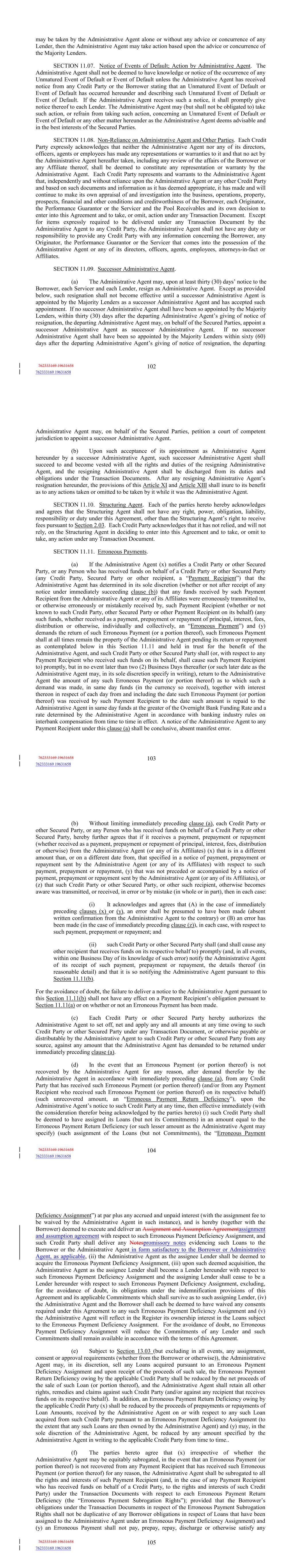 102762333169 19631658 762333169 19631658 may be taken by the Administrative Agent alone or without any advice or concurrence of any Lender, then the Administrative Agent may take action based upon the advice or concurrence of the Majority Lenders. SECTION 11.07. Notice of Events of Default; Action by Administrative Agent. The Administrative Agent shall not be deemed to have knowledge or notice of the occurrence of any Unmatured Event of Default or Event of Default unless the Administrative Agent has received notice from any Credit Party or the Borrower stating that an Unmatured Event of Default or Event of Default has occurred hereunder and describing such Unmatured Event of Default or Event of Default. If the Administrative Agent receives such a notice, it shall promptly give notice thereof to each Lender. The Administrative Agent may (but shall not be obligated to) take such action, or refrain from taking such action, concerning an Unmatured Event of Default or Event of Default or any other matter hereunder as the Administrative Agent deems advisable and in the best interests of the Secured Parties. SECTION 11.08. Non-Reliance on Administrative Agent and Other Parties. Each Credit Party expressly acknowledges that neither the Administrative Agent nor any of its directors, officers, agents or employees has made any representations or warranties to it and that no act by the Administrative Agent hereafter taken, including any review of the affairs of the Borrower or any Affiliate thereof, shall be deemed to constitute any representation or warranty by the Administrative Agent. Each Credit Party represents and warrants to the Administrative Agent that, independently and without reliance upon the Administrative Agent or any other Credit Party and based on such documents and information as it has deemed appropriate, it has made and will continue to make its own appraisal of and investigation into the business, operations, property, prospects, financial and other conditions and creditworthiness of the Borrower, each Originator, the Performance Guarantor or the Servicer and the Pool Receivables and its own decision to enter into this Agreement and to take, or omit, action under any Transaction Document. Except for items expressly required to be delivered under any Transaction Document by the Administrative Agent to any Credit Party, the Administrative Agent shall not have any duty or responsibility to provide any Credit Party with any information concerning the Borrower, any Originator, the Performance Guarantor or the Servicer that comes into the possession of the Administrative Agent or any of its directors, officers, agents, employees, attorneys-in-fact or Affiliates. SECTION 11.09. Successor Administrative Agent. (a) The Administrative Agent may, upon at least thirty (30) days’ notice to the Borrower, each Servicer and each Lender, resign as Administrative Agent. Except as provided below, such resignation shall not become effective until a successor Administrative Agent is appointed by the Majority Lenders as a successor Administrative Agent and has accepted such appointment. If no successor Administrative Agent shall have been so appointed by the Majority Lenders, within thirty (30) days after the departing Administrative Agent’s giving of notice of resignation, the departing Administrative Agent may, on behalf of the Secured Parties, appoint a successor Administrative Agent as successor Administrative Agent. If no successor Administrative Agent shall have been so appointed by the Majority Lenders within sixty (60) days after the departing Administrative Agent’s giving of notice of resignation, the departing 103762333169 19631658 762333169 19631658 Administrative Agent may, on behalf of the Secured Parties, petition a court of competent jurisdiction to appoint a successor Administrative Agent. (b) Upon such acceptance of its appointment as Administrative Agent hereunder by a successor Administrative Agent, such successor Administrative Agent shall succeed to and become vested with all the rights and duties of the resigning Administrative Agent, and the resigning Administrative Agent shall be discharged from its duties and obligations under the Transaction Documents. After any resigning Administrative Agent’s resignation hereunder, the provisions of this Article XI and Article XIII shall inure to its benefit as to any actions taken or omitted to be taken by it while it was the Administrative Agent. SECTION 11.10. Structuring Agent. Each of the parties hereto hereby acknowledges and agrees that the Structuring Agent shall not have any right, power, obligation, liability, responsibility or duty under this Agreement, other than the Structuring Agent’s right to receive fees pursuant to Section 2.03. Each Credit Party acknowledges that it has not relied, and will not rely, on the Structuring Agent in deciding to enter into this Agreement and to take, or omit to take, any action under any Transaction Document. SECTION 11.11. Erroneous Payments. (a) If the Administrative Agent (x) notifies a Credit Party or other Secured Party, or any Person who has received funds on behalf of a Credit Party or other Secured Party (any Credit Party, Secured Party or other recipient, a “Payment Recipient”) that the Administrative Agent has determined in its sole discretion (whether or not after receipt of any notice under immediately succeeding clause (b)) that any funds received by such Payment Recipient from the Administrative Agent or any of its Affiliates were erroneously transmitted to, or otherwise erroneously or mistakenly received by, such Payment Recipient (whether or not known to such Credit Party, other Secured Party or other Payment Recipient on its behalf) (any such funds, whether received as a payment, prepayment or repayment of principal, interest, fees, distribution or otherwise, individually and collectively, an “Erroneous Payment”) and (y) demands the return of such Erroneous Pa