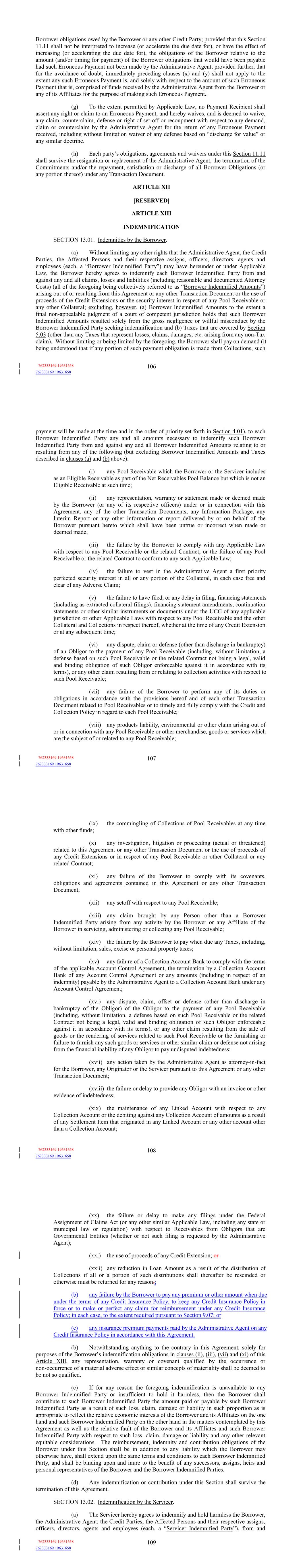 106762333169 19631658 762333169 19631658 Borrower obligations owed by the Borrower or any other Credit Party; provided that this Section 11.11 shall not be interpreted to increase (or accelerate the due date for), or have the effect of increasing (or accelerating the due date for), the obligations of the Borrower relative to the amount (and/or timing for payment) of the Borrower obligations that would have been payable had such Erroneous Payment not been made by the Administrative Agent; provided further, that for the avoidance of doubt, immediately preceding clauses (x) and (y) shall not apply to the extent any such Erroneous Payment is, and solely with respect to the amount of such Erroneous Payment that is, comprised of funds received by the Administrative Agent from the Borrower or any of its Affiliates for the purpose of making such Erroneous Payment.. (g) To the extent permitted by Applicable Law, no Payment Recipient shall assert any right or claim to an Erroneous Payment, and hereby waives, and is deemed to waive, any claim, counterclaim, defense or right of set-off or recoupment with respect to any demand, claim or counterclaim by the Administrative Agent for the return of any Erroneous Payment received, including without limitation waiver of any defense based on “discharge for value” or any similar doctrine. (h) Each party’s obligations, agreements and waivers under this Section 11.11 shall survive the resignation or replacement of the Administrative Agent, the termination of the Commitments and/or the repayment, satisfaction or discharge of all Borrower Obligations (or any portion thereof) under any Transaction Document. ARTICLE XII [RESERVED] ARTICLE XIII INDEMNIFICATION SECTION 13.01. Indemnities by the Borrower. (a) Without limiting any other rights that the Administrative Agent, the Credit Parties, the Affected Persons and their respective assigns, officers, directors, agents and employees (each, a “Borrower Indemnified Party”) may have hereunder or under Applicable Law, the Borrower hereby agrees to indemnify each Borrower Indemnified Party from and against any and all claims, losses and liabilities (including reasonable and documented Attorney Costs) (all of the foregoing being collectively referred to as “Borrower Indemnified Amounts”) arising out of or resulting from this Agreement or any other Transaction Document or the use of proceeds of the Credit Extensions or the security interest in respect of any Pool Receivable or any other Collateral; excluding, however, (a) Borrower Indemnified Amounts to the extent a final non-appealable judgment of a court of competent jurisdiction holds that such Borrower Indemnified Amounts resulted solely from the gross negligence or willful misconduct by the Borrower Indemnified Party seeking indemnification and (b) Taxes that are covered by Section 5.03 (other than any Taxes that represent losses, claims, damages, etc. arising from any non-Tax claim). Without limiting or being limited by the foregoing, the Borrower shall pay on demand (it being understood that if any portion of such payment obligation is made from Collections, such 107762333169 19631658 762333169 19631658 payment will be made at the time and in the order of priority set forth in Section 4.01), to each Borrower Indemnified Party any and all amounts necessary to indemnify such Borrower Indemnified Party from and against any and all Borrower Indemnified Amounts relating to or resulting from any of the following (but excluding Borrower Indemnified Amounts and Taxes described in clauses (a) and (b) above): (i) any Pool Receivable which the Borrower or the Servicer includes as an Eligible Receivable as part of the Net Receivables Pool Balance but which is not an Eligible Receivable at such time; (ii) any representation, warranty or statement made or deemed made by the Borrower (or any of its respective officers) under or in connection with this Agreement, any of the other Transaction Documents, any Information Package, any Interim Report or any other information or report delivered by or on behalf of the Borrower pursuant hereto which shall have been untrue or incorrect when made or deemed made; (iii) the failure by the Borrower to comply with any Applicable Law with respect to any Pool Receivable or the related Contract; or the failure of any Pool Receivable or the related Contract to conform to any such Applicable Law; (iv) the failure to vest in the Administrative Agent a first priority perfected security interest in all or any portion of the Collateral, in each case free and clear of any Adverse Claim; (v) the failure to have filed, or any delay in filing, financing statements (including as-extracted collateral filings), financing statement amendments, continuation statements or other similar instruments or documents under the UCC of any applicable jurisdiction or other Applicable Laws with respect to any Pool Receivable and the other Collateral and Collections in respect thereof, whether at the time of any Credit Extension or at any subsequent time; (vi) any dispute, claim or defense (other than discharge in bankruptcy) of an Obligor to the payment of any Pool Receivable (including, without limitation, a defense based on such Pool Receivable or the related Contract not being a legal, valid and binding obligation of such Obligor enforceable against it in accordance with its terms), or any other claim resulting from or relating to collection activities with respect to such Pool Receivable; (vii) any failure of the Borrower to perform any of its duties or obligations in accordance with the provisions hereof and of each other Transaction Document related to Pool Receivables or to timely and fully comply with the Credit and Collection Policy in regard to each Pool Receivable; (viii) any products liability, environmental or other claim arising out of or in connection with any Pool Receivable or other merchandise, goods or services which are the subject of or re