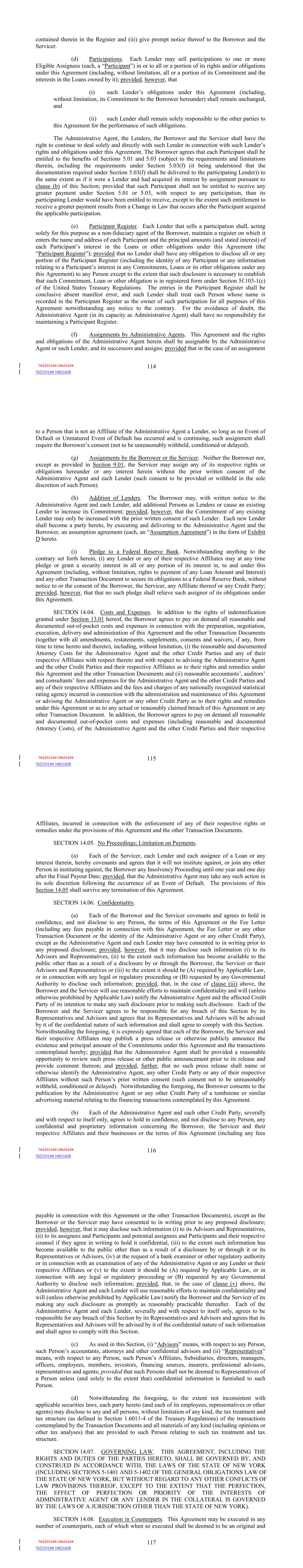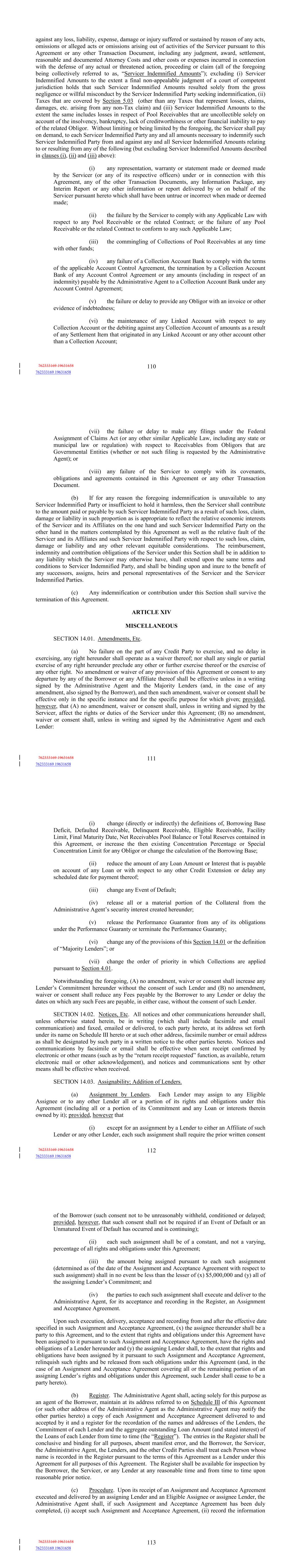 114762333169 19631658 762333169 19631658 contained therein in the Register and (iii) give prompt notice thereof to the Borrower and the Servicer. (d) Participations. Each Lender may sell participations to one or more Eligible Assignees (each, a “Participant”) in or to all or a portion of its rights and/or obligations under this Agreement (including, without limitation, all or a portion of its Commitment and the interests in the Loans owned by it); provided, however, that (i) such Lender’s obligations under this Agreement (including, without limitation, its Commitment to the Borrower hereunder) shall remain unchanged, and (ii) such Lender shall remain solely responsible to the other parties to this Agreement for the performance of such obligations. The Administrative Agent, the Lenders, the Borrower and the Servicer shall have the right to continue to deal solely and directly with such Lender in connection with such Lender’s rights and obligations under this Agreement. The Borrower agrees that each Participant shall be entitled to the benefits of Sections 5.01 and 5.03 (subject to the requirements and limitations therein, including the requirements under Section 5.03(f) (it being understood that the documentation required under Section 5.03(f) shall be delivered to the participating Lender)) to the same extent as if it were a Lender and had acquired its interest by assignment pursuant to clause (b) of this Section; provided that such Participant shall not be entitled to receive any greater payment under Section 5.01 or 5.03, with respect to any participation, than its participating Lender would have been entitled to receive, except to the extent such entitlement to receive a greater payment results from a Change in Law that occurs after the Participant acquired the applicable participation. (e) Participant Register. Each Lender that sells a participation shall, acting solely for this purpose as a non-fiduciary agent of the Borrower, maintain a register on which it enters the name and address of each Participant and the principal amounts (and stated interest) of each Participant’s interest in the Loans or other obligations under this Agreement (the “Participant Register”); provided that no Lender shall have any obligation to disclose all or any portion of the Participant Register (including the identity of any Participant or any information relating to a Participant’s interest in any Commitments, Loans or its other obligations under any this Agreement) to any Person except to the extent that such disclosure is necessary to establish that such Commitment, Loan or other obligation is in registered form under Section 5f.103-1(c) of the United States Treasury Regulations. The entries in the Participant Register shall be conclusive absent manifest error, and such Lender shall treat each Person whose name is recorded in the Participant Register as the owner of such participation for all purposes of this Agreement notwithstanding any notice to the contrary. For the avoidance of doubt, the Administrative Agent (in its capacity as Administrative Agent) shall have no responsibility for maintaining a Participant Register. (f) Assignments by Administrative Agents. This Agreement and the rights and obligations of the Administrative Agent herein shall be assignable by the Administrative Agent or such Lender, and its successors and assigns; provided that in the case of an assignment 115762333169 19631658 762333169 19631658 to a Person that is not an Affiliate of the Administrative Agent a Lender, so long as no Event of Default or Unmatured Event of Default has occurred and is continuing, such assignment shall require the Borrower’s consent (not to be unreasonably withheld, conditioned or delayed). (g) Assignments by the Borrower or the Servicer. Neither the Borrower nor, except as provided in Section 9.01, the Servicer may assign any of its respective rights or obligations hereunder or any interest herein without the prior written consent of the Administrative Agent and each Lender (such consent to be provided or withheld in the sole discretion of such Person). (h) Addition of Lenders. The Borrower may, with written notice to the Administrative Agent and each Lender, add additional Persons as Lenders or cause an existing Lender to increase its Commitment; provided, however, that the Commitment of any existing Lender may only be increased with the prior written consent of such Lender. Each new Lender shall become a party hereto, by executing and delivering to the Administrative Agent and the Borrower, an assumption agreement (each, an “Assumption Agreement”) in the form of Exhibit D hereto. (i) Pledge to a Federal Reserve Bank. Notwithstanding anything to the contrary set forth herein, (i) any Lender or any of their respective Affiliates may at any time pledge or grant a security interest in all or any portion of its interest in, to and under this Agreement (including, without limitation, rights to payment of any Loan Amount and Interest) and any other Transaction Document to secure its obligations to a Federal Reserve Bank, without notice to or the consent of the Borrower, the Servicer, any Affiliate thereof or any Credit Party; provided, however, that that no such pledge shall relieve such assignor of its obligations under this Agreement. SECTION 14.04. Costs and Expenses. In addition to the rights of indemnification granted under Section 13.01 hereof, the Borrower agrees to pay on demand all reasonable and documented out-of-pocket costs and expenses in connection with the preparation, negotiation, execution, delivery and administration of this Agreement and the other Transaction Documents (together with all amendments, restatements, supplements, consents and waivers, if any, from time to time hereto and thereto), including, without limitation, (i) the reasonable and documented Attorney Costs for the Administrative Agent and the other Credit Parties and any of their respective Affi