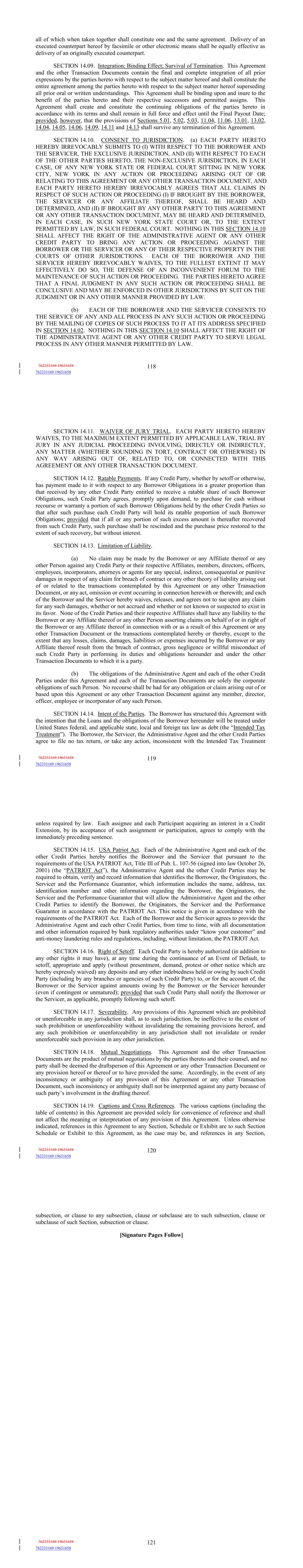 118762333169 19631658 762333169 19631658 all of which when taken together shall constitute one and the same agreement. Delivery of an executed counterpart hereof by facsimile or other electronic means shall be equally effective as delivery of an originally executed counterpart. SECTION 14.09. Integration; Binding Effect; Survival of Termination. This Agreement and the other Transaction Documents contain the final and complete integration of all prior expressions by the parties hereto with respect to the subject matter hereof and shall constitute the entire agreement among the parties hereto with respect to the subject matter hereof superseding all prior oral or written understandings. This Agreement shall be binding upon and inure to the benefit of the parties hereto and their respective successors and permitted assigns. This Agreement shall create and constitute the continuing obligations of the parties hereto in accordance with its terms and shall remain in full force and effect until the Final Payout Date; provided, however, that the provisions of Sections 5.01, 5.02, 5.03, 11.04, 11.06, 13.01, 13.02, 14.04, 14.05, 14.06, 14.09, 14.11 and 14.13 shall survive any termination of this Agreement. SECTION 14.10. CONSENT TO JURISDICTION. (a) EACH PARTY HERETO HEREBY IRREVOCABLY SUBMITS TO (I) WITH RESPECT TO THE BORROWER AND THE SERVICER, THE EXCLUSIVE JURISDICTION, AND (II) WITH RESPECT TO EACH OF THE OTHER PARTIES HERETO, THE NON-EXCLUSIVE JURISDICTION, IN EACH CASE, OF ANY NEW YORK STATE OR FEDERAL COURT SITTING IN NEW YORK CITY, NEW YORK IN ANY ACTION OR PROCEEDING ARISING OUT OF OR RELATING TO THIS AGREEMENT OR ANY OTHER TRANSACTION DOCUMENT, AND EACH PARTY HERETO HEREBY IRREVOCABLY AGREES THAT ALL CLAIMS IN RESPECT OF SUCH ACTION OR PROCEEDING (I) IF BROUGHT BY THE BORROWER, THE SERVICER OR ANY AFFILIATE THEREOF, SHALL BE HEARD AND DETERMINED, AND (II) IF BROUGHT BY ANY OTHER PARTY TO THIS AGREEMENT OR ANY OTHER TRANSACTION DOCUMENT, MAY BE HEARD AND DETERMINED, IN EACH CASE, IN SUCH NEW YORK STATE COURT OR, TO THE EXTENT PERMITTED BY LAW, IN SUCH FEDERAL COURT. NOTHING IN THIS SECTION 14.10 SHALL AFFECT THE RIGHT OF THE ADMINISTRATIVE AGENT OR ANY OTHER CREDIT PARTY TO BRING ANY ACTION OR PROCEEDING AGAINST THE BORROWER OR THE SERVICER OR ANY OF THEIR RESPECTIVE PROPERTY IN THE COURTS OF OTHER JURISDICTIONS. EACH OF THE BORROWER AND THE SERVICER HEREBY IRREVOCABLY WAIVES, TO THE FULLEST EXTENT IT MAY EFFECTIVELY DO SO, THE DEFENSE OF AN INCONVENIENT FORUM TO THE MAINTENANCE OF SUCH ACTION OR PROCEEDING. THE PARTIES HERETO AGREE THAT A FINAL JUDGMENT IN ANY SUCH ACTION OR PROCEEDING SHALL BE CONCLUSIVE AND MAY BE ENFORCED IN OTHER JURISDICTIONS BY SUIT ON THE JUDGMENT OR IN ANY OTHER MANNER PROVIDED BY LAW. (b) EACH OF THE BORROWER AND THE SERVICER CONSENTS TO THE SERVICE OF ANY AND ALL PROCESS IN ANY SUCH ACTION OR PROCEEDING BY THE MAILING OF COPIES OF SUCH PROCESS TO IT AT ITS ADDRESS SPECIFIED IN SECTION 14.02. NOTHING IN THIS SECTION 14.10 SHALL AFFECT THE RIGHT OF THE ADMINISTRATIVE AGENT OR ANY OTHER CREDIT PARTY TO SERVE LEGAL PROCESS IN ANY OTHER MANNER PERMITTED BY LAW. 119762333169 19631658 762333169 19631658 SECTION 14.11. WAIVER OF JURY TRIAL. EACH PARTY HERETO HEREBY WAIVES, TO THE MAXIMUM EXTENT PERMITTED BY APPLICABLE LAW, TRIAL BY JURY IN ANY JUDICIAL PROCEEDING INVOLVING, DIRECTLY OR INDIRECTLY, ANY MATTER (WHETHER SOUNDING IN TORT, CONTRACT OR OTHERWISE) IN ANY WAY ARISING OUT OF, RELATED TO, OR CONNECTED WITH THIS AGREEMENT OR ANY OTHER TRANSACTION DOCUMENT. SECTION 14.12. Ratable Payments. If any Credit Party, whether by setoff or otherwise, has payment made to it with respect to any Borrower Obligations in a greater proportion than that received by any other Credit Party entitled to receive a ratable share of such Borrower Obligations, such Credit Party agrees, promptly upon demand, to purchase for cash without recourse or warranty a portion of such Borrower Obligations held by the other Credit Parties so that after such purchase each Credit Party will hold its ratable proportion of such Borrower Obligations; provided that if all or any portion of such excess amount is thereafter recovered from such Credit Party, such purchase shall be rescinded and the purchase price restored to the extent of such recovery, but without interest. SECTION 14.13. Limitation of Liability. (a) No claim may be made by the Borrower or any Affiliate thereof or any other Person against any Credit Party or their respective Affiliates, members, directors, officers, employees, incorporators, attorneys or agents for any special, indirect, consequential or punitive damages in respect of any claim for breach of contract or any other theory of liability arising out of or related to the transactions contemplated by this Agreement or any other Transaction Document, or any act, omission or event occurring in connection herewith or therewith; and each of the Borrower and the Servicer hereby waives, releases, and agrees not to sue upon any claim for any such damages, whether or not accrued and whether or not known or suspected to exist in its favor. None of the Credit Parties and their respective Affiliates shall have any liability to the Borrower or any Affiliate thereof or any other Person asserting claims on behalf of or in right of the Borrower or any Affiliate thereof in connection with or as a result of this Agreement or any other Transaction Document or the transactions contemplated hereby or thereby, except to the extent that any losses, claims, damages, liabilities or expenses incurred by the Borrower or any Affiliate thereof result from the breach of contract, gross negligence or willful misconduct of such Credit Party in performing its duties and obligations hereunder and under the other Transaction Documents to which it is a party. (b) The obligations of the Administrative Agent and each of the other Credit Parties under this Agreement and each of the Transaction Documents are solely the
