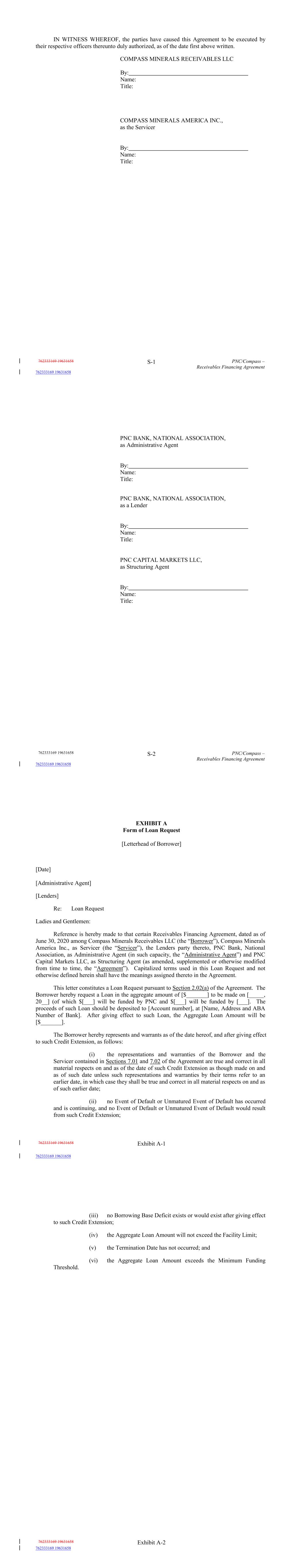 762333169 19631658 S-1 PNC/Compass – Receivables Financing Agreement 762333169 19631658 COMPASS MINERALS RECEIVABLES LLC By: Name: Title: IN WITNESS WHEREOF, the parties have caused this Agreement to be executed by their respective officers thereunto duly authorized, as of the date first above written. COMPASS MINERALS AMERICA INC., as the Servicer By: Name: Title: 762333169 19631658 S-2 PNC/Compass – Receivables Financing Agreement 762333169 19631658 PNC BANK, NATIONAL ASSOCIATION, as a Lender By: Name: Title: PNC BANK, NATIONAL ASSOCIATION, as Administrative Agent By: Name: Title: PNC CAPITAL MARKETS LLC, as Structuring Agent By: Name: Title: Exhibit A-1762333169 19631658 762333169 19631658 EXHIBIT A Form of Loan Request [Letterhead of Borrower] [Date] [Administrative Agent] [Lenders] Re: Loan Request Ladies and Gentlemen: Reference is hereby made to that certain Receivables Financing Agreement, dated as of June 30, 2020 among Compass Minerals Receivables LLC (the “Borrower”), Compass Minerals America Inc., as Servicer (the “Servicer”), the Lenders party thereto, PNC Bank, National Association, as Administrative Agent (in such capacity, the “Administrative Agent”) and PNC Capital Markets LLC, as Structuring Agent (as amended, supplemented or otherwise modified from time to time, the “Agreement”). Capitalized terms used in this Loan Request and not otherwise defined herein shall have the meanings assigned thereto in the Agreement. This letter constitutes a Loan Request pursuant to Section 2.02(a) of the Agreement. The Borrower hereby request a Loan in the aggregate amount of [$_______] to be made on [_____, 20__] (of which $[___] will be funded by PNC and $[___] will be funded by [___]. The proceeds of such Loan should be deposited to [Account number], at [Name, Address and ABA Number of Bank]. After giving effect to such Loan, the Aggregate Loan Amount will be [$_______]. The Borrower hereby represents and warrants as of the date hereof, and after giving effect to such Credit Extension, as follows: (i) the representations and warranties of the Borrower and the Servicer contained in Sections 7.01 and 7.02 of the Agreement are true and correct in all material respects on and as of the date of such Credit Extension as though made on and as of such date unless such representations and warranties by their terms refer to an earlier date, in which case they shall be true and correct in all material respects on and as of such earlier date; (ii) no Event of Default or Unmatured Event of Default has occurred and is continuing, and no Event of Default or Unmatured Event of Default would result from such Credit Extension; Exhibit A-2762333169 19631658 762333169 19631658 (iii) no Borrowing Base Deficit exists or would exist after giving effect to such Credit Extension; (iv) the Aggregate Loan Amount will not exceed the Facility Limit; (v) the Termination Date has not occurred; and (vi) the Aggregate Loan Amount exceeds the Minimum Funding Threshold.