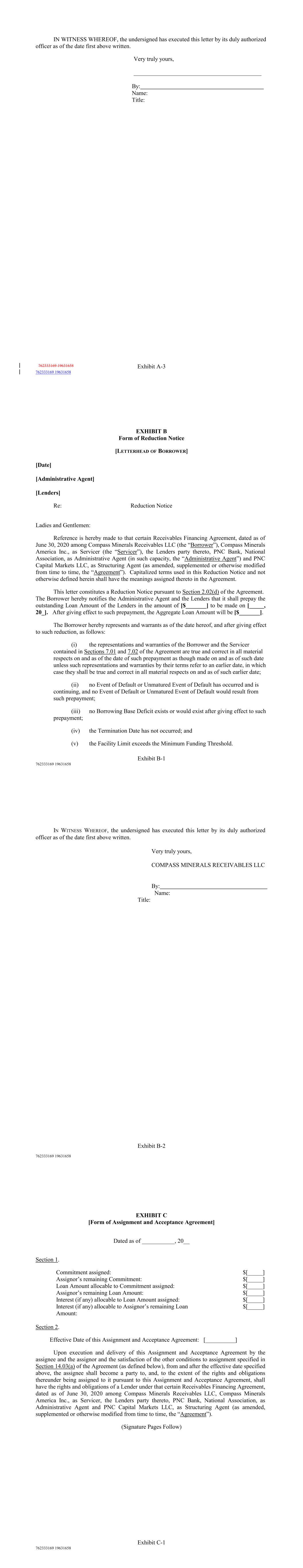 Exhibit A-3762333169 19631658 762333169 19631658 IN WITNESS WHEREOF, the undersigned has executed this letter by its duly authorized officer as of the date first above written. Very truly yours, ___________________________________________ By: Name: Title: EXHIBIT B Form of Reduction Notice [LETTERHEAD OF BORROWER] [Date] [Administrative Agent] [Lenders] Re: Reduction Notice Ladies and Gentlemen: Reference is hereby made to that certain Receivables Financing Agreement, dated as of June 30, 2020 among Compass Minerals Receivables LLC (the “Borrower”), Compass Minerals America Inc., as Servicer (the “Servicer”), the Lenders party thereto, PNC Bank, National Association, as Administrative Agent (in such capacity, the “Administrative Agent”) and PNC Capital Markets LLC, as Structuring Agent (as amended, supplemented or otherwise modified from time to time, the “Agreement”). Capitalized terms used in this Reduction Notice and not otherwise defined herein shall have the meanings assigned thereto in the Agreement. This letter constitutes a Reduction Notice pursuant to Section 2.02(d) of the Agreement. The Borrower hereby notifies the Administrative Agent and the Lenders that it shall prepay the outstanding Loan Amount of the Lenders in the amount of [$_______] to be made on [_____, 20_]. After giving effect to such prepayment, the Aggregate Loan Amount will be [$_______]. The Borrower hereby represents and warrants as of the date hereof, and after giving effect to such reduction, as follows: (i) the representations and warranties of the Borrower and the Servicer contained in Sections 7.01 and 7.02 of the Agreement are true and correct in all material respects on and as of the date of such prepayment as though made on and as of such date unless such representations and warranties by their terms refer to an earlier date, in which case they shall be true and correct in all material respects on and as of such earlier date; (ii) no Event of Default or Unmatured Event of Default has occurred and is continuing, and no Event of Default or Unmatured Event of Default would result from such prepayment; (iii) no Borrowing Base Deficit exists or would exist after giving effect to such prepayment; (iv) the Termination Date has not occurred; and (v) the Facility Limit exceeds the Minimum Funding Threshold. Exhibit B-1 762333169 19631658 IN WITNESS WHEREOF, the undersigned has executed this letter by its duly authorized officer as of the date first above written. Very truly yours, COMPASS MINERALS RECEIVABLES LLC By: Name: Title: Exhibit B-2 762333169 19631658 Exhibit C-1 762333169 19631658 $[_____] EXHIBIT C [Form of Assignment and Acceptance Agreement] Dated as of ___________, 20__ Section 1. Assignor’s remaining Loan Amount: $[_____] Assignor’s remaining Commitment: Interest (if any) allocable to Loan Amount assigned: $[_____] $[_____] Commitment assigned: Interest (if any) allocable to Assignor’s remaining Loan Amount: $[_____] Loan Amount allocable to Commitment assigned: Section 2. Effective Date of this Assignment and Acceptance Agreement: [__________] Upon execution and delivery of this Assignment and Acceptance Agreement by the assignee and the assignor and the satisfaction of the other conditions to assignment specified in Section 14.03(a) of the Agreement (as defined below), from and after the effective date specified above, the assignee shall become a party to, and, to the extent of the rights and obligations thereunder being assigned to it pursuant to this Assignment and Acceptance Agreement, shall have the rights and obligations of a Lender under that certain Receivables Financing Agreement, dated as of June 30, 2020 among Compass Minerals Receivables LLC, Compass Minerals America Inc., as Servicer, the Lenders party thereto, PNC Bank, National Association, as Administrative Agent and PNC Capital Markets LLC, as Structuring Agent (as amended, supplemented or otherwise modified from time to time, the “Agreement”). (Signature Pages Follow) $[_____]