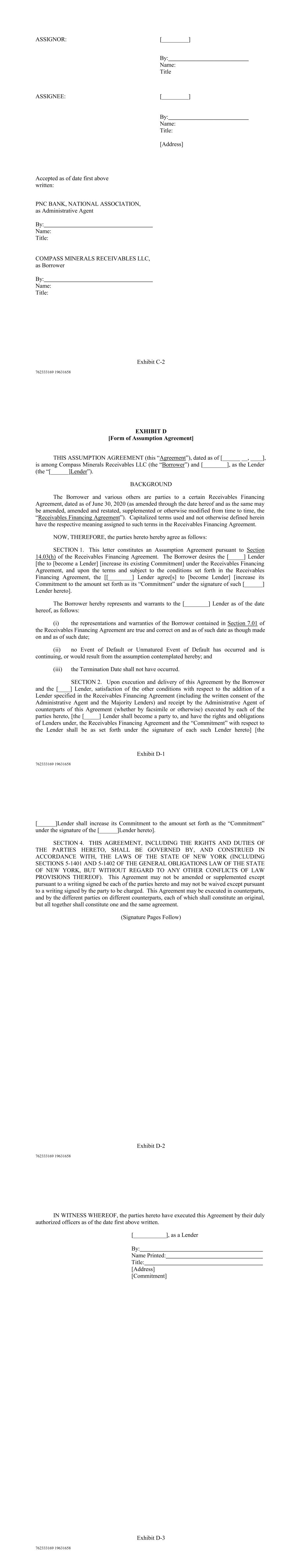ASSIGNOR: [_________] By: Name: Title ASSIGNEE: [_________] By: Name: Title: [Address] Accepted as of date first above written: PNC BANK, NATIONAL ASSOCIATION, as Administrative Agent By: Name: Title: COMPASS MINERALS RECEIVABLES LLC, as Borrower By: Name: Title: Exhibit C-2 762333169 19631658 EXHIBIT D [Form of Assumption Agreement] THIS ASSUMPTION AGREEMENT (this “Agreement”), dated as of [______ __, ____], is among Compass Minerals Receivables LLC (the “Borrower”) and [________], as the Lender (the “[______]Lender”). BACKGROUND The Borrower and various others are parties to a certain Receivables Financing Agreement, dated as of June 30, 2020 (as amended through the date hereof and as the same may be amended, amended and restated, supplemented or otherwise modified from time to time, the “Receivables Financing Agreement”). Capitalized terms used and not otherwise defined herein have the respective meaning assigned to such terms in the Receivables Financing Agreement. NOW, THEREFORE, the parties hereto hereby agree as follows: SECTION 1. This letter constitutes an Assumption Agreement pursuant to Section 14.03(h) of the Receivables Financing Agreement. The Borrower desires the [_____] Lender [the to [become a Lender] [increase its existing Commitment] under the Receivables Financing Agreement, and upon the terms and subject to the conditions set forth in the Receivables Financing Agreement, the [[________] Lender agree[s] to [become Lender] [increase its Commitment to the amount set forth as its “Commitment” under the signature of such [______] Lender hereto]. The Borrower hereby represents and warrants to the [________] Lender as of the date hereof, as follows: (i) the representations and warranties of the Borrower contained in Section 7.01 of the Receivables Financing Agreement are true and correct on and as of such date as though made on and as of such date; (ii) no Event of Default or Unmatured Event of Default has occurred and is continuing, or would result from the assumption contemplated hereby; and (iii) the Termination Date shall not have occurred. SECTION 2. Upon execution and delivery of this Agreement by the Borrower and the [____] Lender, satisfaction of the other conditions with respect to the addition of a Lender specified in the Receivables Financing Agreement (including the written consent of the Administrative Agent and the Majority Lenders) and receipt by the Administrative Agent of counterparts of this Agreement (whether by facsimile or otherwise) executed by each of the parties hereto, [the [_____] Lender shall become a party to, and have the rights and obligations of Lenders under, the Receivables Financing Agreement and the “Commitment” with respect to the Lender shall be as set forth under the signature of each such Lender hereto] [the Exhibit D-1 762333169 19631658 [______]Lender shall increase its Commitment to the amount set forth as the “Commitment” under the signature of the [______]Lender hereto]. SECTION 4. THIS AGREEMENT, INCLUDING THE RIGHTS AND DUTIES OF THE PARTIES HERETO, SHALL BE GOVERNED BY, AND CONSTRUED IN ACCORDANCE WITH, THE LAWS OF THE STATE OF NEW YORK (INCLUDING SECTIONS 5-1401 AND 5-1402 OF THE GENERAL OBLIGATIONS LAW OF THE STATE OF NEW YORK, BUT WITHOUT REGARD TO ANY OTHER CONFLICTS OF LAW PROVISIONS THEREOF). This Agreement may not be amended or supplemented except pursuant to a writing signed be each of the parties hereto and may not be waived except pursuant to a writing signed by the party to be charged. This Agreement may be executed in counterparts, and by the different parties on different counterparts, each of which shall constitute an original, but all together shall constitute one and the same agreement. (Signature Pages Follow) Exhibit D-2 762333169 19631658 IN WITNESS WHEREOF, the parties hereto have executed this Agreement by their duly authorized officers as of the date first above written. [___________], as a Lender By: Name Printed: Title: [Address] [Commitment] Exhibit D-3 762333169 19631658