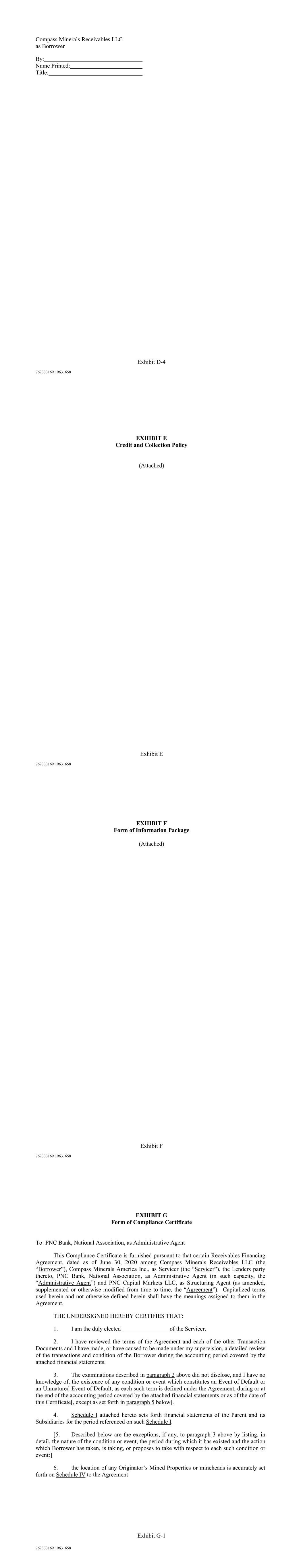 Compass Minerals Receivables LLC as Borrower By: Name Printed: Title: Exhibit D-4 762333169 19631658 EXHIBIT E Credit and Collection Policy (Attached) Exhibit E 762333169 19631658 EXHIBIT F Form of Information Package (Attached) Exhibit F 762333169 19631658 EXHIBIT G Form of Compliance Certificate To: PNC Bank, National Association, as Administrative Agent This Compliance Certificate is furnished pursuant to that certain Receivables Financing Agreement, dated as of June 30, 2020 among Compass Minerals Receivables LLC (the “Borrower”), Compass Minerals America Inc., as Servicer (the “Servicer”), the Lenders party thereto, PNC Bank, National Association, as Administrative Agent (in such capacity, the “Administrative Agent”) and PNC Capital Markets LLC, as Structuring Agent (as amended, supplemented or otherwise modified from time to time, the “Agreement”). Capitalized terms used herein and not otherwise defined herein shall have the meanings assigned to them in the Agreement. THE UNDERSIGNED HEREBY CERTIFIES THAT: 1. I am the duly elected ________________of the Servicer. 2. I have reviewed the terms of the Agreement and each of the other Transaction Documents and I have made, or have caused to be made under my supervision, a detailed review of the transactions and condition of the Borrower during the accounting period covered by the attached financial statements. 3. The examinations described in paragraph 2 above did not disclose, and I have no knowledge of, the existence of any condition or event which constitutes an Event of Default or an Unmatured Event of Default, as each such term is defined under the Agreement, during or at the end of the accounting period covered by the attached financial statements or as of the date of this Certificate[, except as set forth in paragraph 5 below]. 4. Schedule I attached hereto sets forth financial statements of the Parent and its Subsidiaries for the period referenced on such Schedule I. [5. Described below are the exceptions, if any, to paragraph 3 above by listing, in detail, the nature of the condition or event, the period during which it has existed and the action which Borrower has taken, is taking, or proposes to take with respect to each such condition or event:] 6. the location of any Originator’s Mined Properties or mineheads is accurately set forth on Schedule IV to the Agreement Exhibit G-1 762333169 19631658