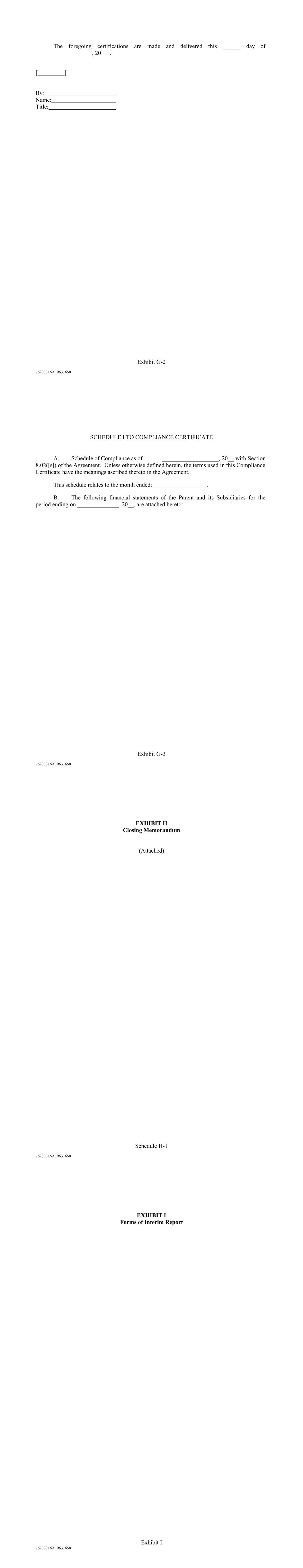 The foregoing certifications are made and delivered this ______ day of ___________________, 20___. [_________] By: Name: Title: Exhibit G-2 762333169 19631658 SCHEDULE I TO COMPLIANCE CERTIFICATE A. Schedule of Compliance as of ___________________, 20__ with Section 8.02([s]) of the Agreement. Unless otherwise defined herein, the terms used in this Compliance Certificate have the meanings ascribed thereto in the Agreement. This schedule relates to the month ended: __________________. B. The following financial statements of the Parent and its Subsidiaries for the period ending on ______________, 20__, are attached hereto: Exhibit G-3 762333169 19631658 EXHIBIT H Closing Memorandum (Attached) Schedule H-1 762333169 19631658 EXHIBIT I Forms of Interim Report Exhibit I 762333169 19631658