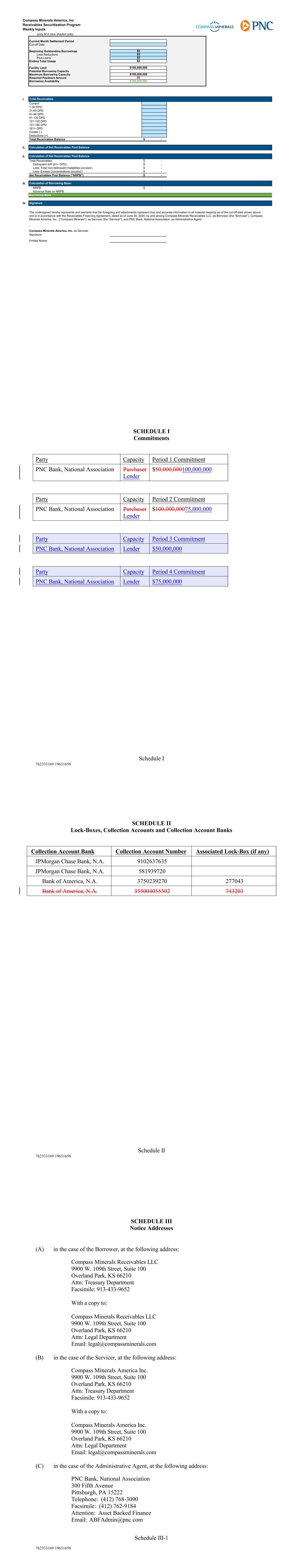 Compass Minerals America, Inc Receivables Securitization Program Weekly Inputs (only fill in blue shaded cells) Current Month Settlement Period Cut-off Date Beginning Outstanding Borrowings Less Reductions Plus Loans Ending Total Usage Facility Limit Potential Borrowing Capacity Maximum Borrowing Capacity Required Paydown Amount Borrowing Availability I. Current 1-30 DPD 31-60 DPD 61-90 DPD 91-120 DPD 121-150 DPD 151-180 DPD 181+ DPD Credits (-) Deductions (+) Total Receivables Balance -$ 11 II. II. Total Receivables -$ Delinquent A/R (61+ DPD) -$ Less: Total non-delinquent Ineligibles (proxied ) -$ Less: Excess Concentrations (proxied ) -$ Net Receivables Pool Balance ("NRPB") -$ III. NRPB -$ Advance Rate on NRPB Borrowing Base IV. Compass Minerals America, Inc. as Servicer Signature: Printed Name: Calculation of Net Receivables Pool Balance Signature The undersigned hereby represents and warrants that the foregoing and attachments represent true and accurate information in all material respects as of the cut-off date shown above and is in accordance with the Receivables Financing Agreement, dated as of June 30, 2020, by and among Compass Minerals Receivables LLC, as Borrower (the “Borrower”), Compass Minerals America, Inc., ("Compass Minerals"), as Servicer (the “Servicer”), and PNC Bank, National Association, as Administrative Agent $0 $0 $0 $0 $100,000,000 $100,000,000 $0 $100,000,000 Total Receivables Calculation of Net Receivables Pool Balance Calculation of Borrowing Base: Schedule I 762333169 19631658 Party $100,000,00075,000,000 Purchaser Lender Party $50,000,000100,000,000 Capacity Capacity Period 3 Commitment PNC Bank, National Association SCHEDULE I Commitments Lender Party $50,000,000 Period 1 Commitment Capacity Party Capacity Period 2 Commitment Period 4 Commitment PNC Bank, National Association Lender PNC Bank, National Association $75,000,000 PNC Bank, National Association Purchaser Lender Schedule II 762333169 19631658 JPMorgan Chase Bank, N.A. Associated Lock-Box (if any) 581939720 Bank of America, N.A. JPMorgan Chase Bank, N.A. 3750239270 Collection Account Bank 277043 9102637635 Bank of America, N.A. 355004055502 Collection Account Number 743203 SCHEDULE II Lock-Boxes, Collection Accounts and Collection Account Banks SCHEDULE III Notice Addresses (A) in the case of the Borrower, at the following address: Compass Minerals Receivables LLC 9900 W. 109th Street, Suite 100 Overland Park, KS 66210 Attn: Treasury Department Facsimile: 913-433-9652 With a copy to: Compass Minerals Receivables LLC 9900 W. 109th Street, Suite 100 Overland Park, KS 66210 Attn: Legal Department Email: legal@compassminerals.com (B) in the case of the Servicer, at the following address: Compass Minerals America Inc. 9900 W. 109th Street, Suite 100 Overland Park, KS 66210 Attn: Treasury Department Facsimile: 913-433-9652 With a copy to: Compass Minerals America Inc. 9900 W. 109th Street, Suite 100 Overland Park, KS 66210 Attn: Legal Department Email: legal@compassminerals.com (C) in the case of the Administrative Agent, at the following address: PNC Bank, National Association 300 Fifth Avenue Pittsburgh, PA 15222 Telephone: (412) 768-3090 Facsimile: (412) 762-9184 Attention: Asset Backed Finance Email: ABFAdmin@pnc.com Schedule III-1 762333169 19631658