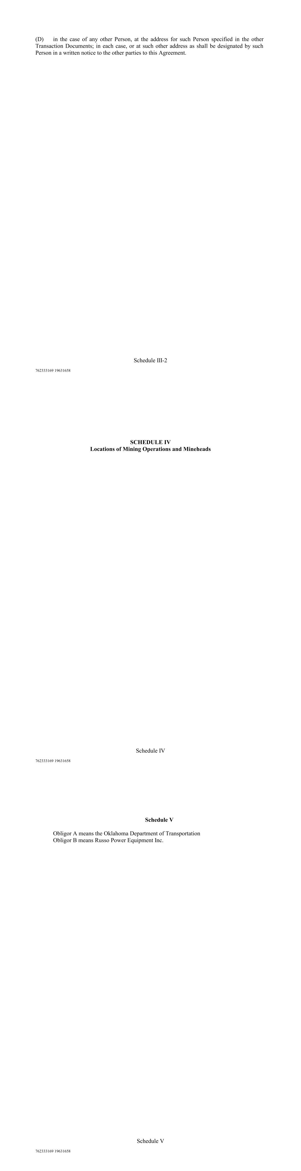 (D) in the case of any other Person, at the address for such Person specified in the other Transaction Documents; in each case, or at such other address as shall be designated by such Person in a written notice to the other parties to this Agreement. Schedule III-2 762333169 19631658 SCHEDULE IV Locations of Mining Operations and Mineheads Schedule IV 762333169 19631658 Schedule V Obligor A means the Oklahoma Department of Transportation Obligor B means Russo Power Equipment Inc. Schedule V 762333169 19631658