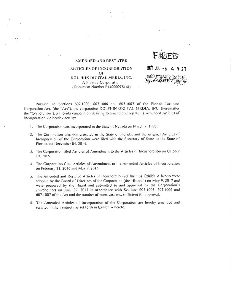 IN WITNESS WHEREOF, these Articles of Amendment to the Amended and Restated Articles of Incorporation of Dolphin Entertainment, Inc. have been executed by a duly authorized officer of this Company on September 13, 2017, and will become effective on September 14, 2017.