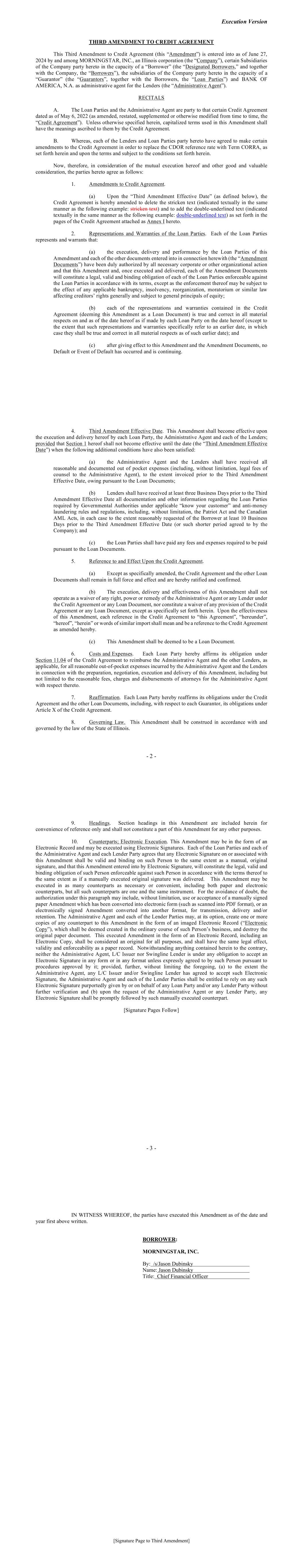 Execution Version THIRD AMENDMENT TO CREDIT AGREEMENT This Third Amendment to Credit Agreement (this “Amendment”) is entered into as of June 27, 2024 by and among MORNINGSTAR, INC., an Illinois corporation (the “Company”), certain Subsidiaries of the Company party hereto in the capacity of a “Borrower” (the “Designated Borrowers,” and together with the Company, the “Borrowers”), the subsidiaries of the Company party hereto in the capacity of a “Guarantor” (the “Guarantors”, together with the Borrowers, the “Loan Parties”) and BANK OF AMERICA, N.A. as administrative agent for the Lenders (the “Administrative Agent”). RECITALS A. The Loan Parties and the Administrative Agent are party to that certain Credit Agreement dated as of May 6, 2022 (as amended, restated, supplemented or otherwise modified from time to time, the “Credit Agreement”). Unless otherwise specified herein, capitalized terms used in this Amendment shall have the meanings ascribed to them by the Credit Agreement. B. Whereas, each of the Lenders and Loan Parties party hereto have agreed to make certain amendments to the Credit Agreement in order to replace the CDOR reference rate with Term CORRA, as set forth herein and upon the terms and subject to the conditions set forth herein. Now, therefore, in consideration of the mutual execution hereof and other good and valuable consideration, the parties hereto agree as follows: 1. Amendments to Credit Agreement. (a) Upon the “Third Amendment Effective Date” (as defined below), the Credit Agreement is hereby amended to delete the stricken text (indicated textually in the same manner as the following example: stricken text) and to add the double-underlined text (indicated textually in the same manner as the following example: double-underlined text) as set forth in the pages of the Credit Agreement attached as Annex I hereto. 2. Representations and Warranties of the Loan Parties. Each of the Loan Parties represents and warrants that: (a) the execution, delivery and performance by the Loan Parties of this Amendment and each of the other documents entered into in connection herewith (the “Amendment Documents”) have been duly authorized by all necessary corporate or other organizational action and that this Amendment and, once executed and delivered, each of the Amendment Documents will constitute a legal, valid and binding obligation of each of the Loan Parties enforceable against the Loan Parties in accordance with its terms, except as the enforcement thereof may be subject to the effect of any applicable bankruptcy, insolvency, reorganization, moratorium or similar law affecting creditors’ rights generally and subject to general principals of equity; (b) each of the representations and warranties contained in the Credit Agreement (deeming this Amendment as a Loan Document) is true and correct in all material respects on and as of the date hereof as if made by each Loan Party on the date hereof (except to the extent that such representations and warranties specifically refer to an earlier date, in which case they shall be true and correct in all material respects as of such earlier date); and (c) after giving effect to this Amendment and the Amendment Documents, no Default or Event of Default has occurred and is continuing. - 2 - 4. Third Amendment Effective Date. This Amendment shall become effective upon the execution and delivery hereof by each Loan Party, the Administrative Agent and each of the Lenders; provided that Section 1 hereof shall not become effective until the date (the “Third Amendment Effective Date”) when the following additional conditions have also been satisfied: (a) the Administrative Agent and the Lenders shall have received all reasonable and documented out of pocket expenses (including, without limitation, legal fees of counsel to the Administrative Agent), to the extent invoiced prior to the Third Amendment Effective Date, owing pursuant to the Loan Documents; (b) Lenders shall have received at least three Business Days prior to the Third Amendment Effective Date all documentation and other information regarding the Loan Parties required by Governmental Authorities under applicable “know your customer” and anti-money laundering rules and regulations, including, without limitation, the Patriot Act and the Canadian AML Acts, in each case to the extent reasonably requested of the Borrower at least 10 Business Days prior to the Third Amendment Effective Date (or such shorter period agreed to by the Company); and (c) the Loan Parties shall have paid any fees and expenses required to be paid pursuant to the Loan Documents. 5. Reference to and Effect Upon the Credit Agreement. (a) Except as specifically amended, the Credit Agreement and the other Loan Documents shall remain in full force and effect and are hereby ratified and confirmed. (b) The execution, delivery and effectiveness of this Amendment shall not operate as a waiver of any right, power or remedy of the Administrative Agent or any Lender under the Credit Agreement or any Loan Document, nor constitute a waiver of any provision of the Credit Agreement or any Loan Document, except as specifically set forth herein. Upon the effectiveness of this Amendment, each reference in the Credit Agreement to “this Agreement”, “hereunder”, “hereof”, “herein” or words of similar import shall mean and be a reference to the Credit Agreement as amended hereby. (c) This Amendment shall be deemed to be a Loan Document. 6. Costs and Expenses. Each Loan Party hereby affirms its obligation under Section 11.04 of the Credit Agreement to reimburse the Administrative Agent and the other Lenders, as applicable, for all reasonable out-of-pocket expenses incurred by the Administrative Agent and the Lenders in connection with the preparation, negotiation, execution and delivery of this Amendment, including but not limited to the reasonable fees, charges and di