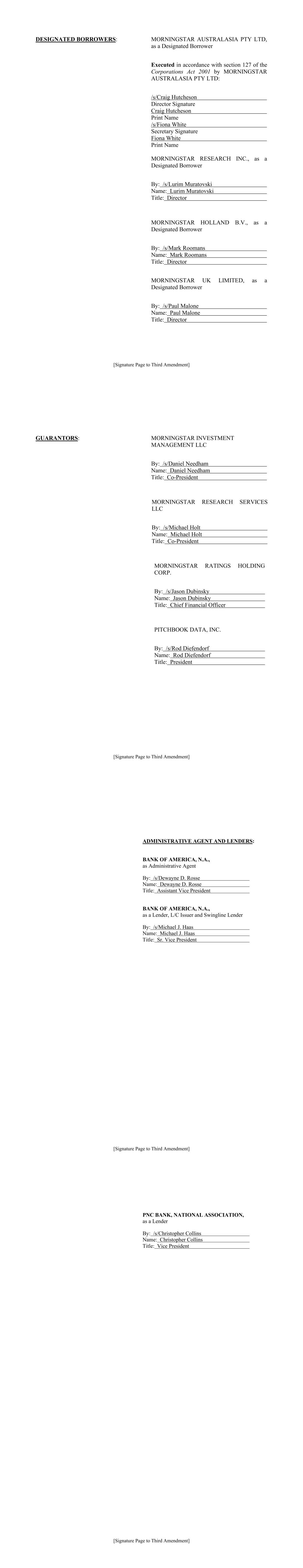 [Signature Page to Third Amendment] DESIGNATED BORROWERS: MORNINGSTAR AUSTRALASIA PTY LTD, as a Designated Borrower Executed in accordance with section 127 of the Corporations Act 2001 by MORNINGSTAR AUSTRALASIA PTY LTD: /s/Craig Hutcheson Director Signature Craig Hutcheson Print Name /s/Fiona White Secretary Signature Fiona White Print Name MORNINGSTAR RESEARCH INC., as a Designated Borrower By: /s/Lurim Muratovski Name: Lurim Muratovski Title: Director MORNINGSTAR HOLLAND B.V., as a Designated Borrower By: /s/Mark Roomans Name: Mark Roomans Title: Director MORNINGSTAR UK LIMITED, as a Designated Borrower By: /s/Paul Malone Name: Paul Malone Title: Director [Signature Page to Third Amendment] GUARANTORS: MORNINGSTAR INVESTMENT MANAGEMENT LLC By: /s/Daniel Needham Name: Daniel Needham Title: Co-President MORNINGSTAR RESEARCH SERVICES LLC By: /s/Michael Holt Name: Michael Holt Title: Co-President MORNINGSTAR RATINGS HOLDING CORP. By: /s/Jason Dubinsky Name: Jason Dubinsky Title: Chief Financial Officer PITCHBOOK DATA, INC. By: /s/Rod Diefendorf Name: Rod Diefendorf Title: President [Signature Page to Third Amendment] ADMINISTRATIVE AGENT AND LENDERS: BANK OF AMERICA, N.A., as Administrative Agent By: /s/Dewayne D. Rosse Name: Dewayne D. Rosse Title: Assistant Vice President BANK OF AMERICA, N.A., as a Lender, L/C Issuer and Swingline Lender By: /s/Michael J. Haas Name: Michael J. Haas Title: Sr. Vice President [Signature Page to Third Amendment] PNC BANK, NATIONAL ASSOCIATION, as a Lender By: /s/Christopher Collins Name: Christopher Collins Title: Vice President