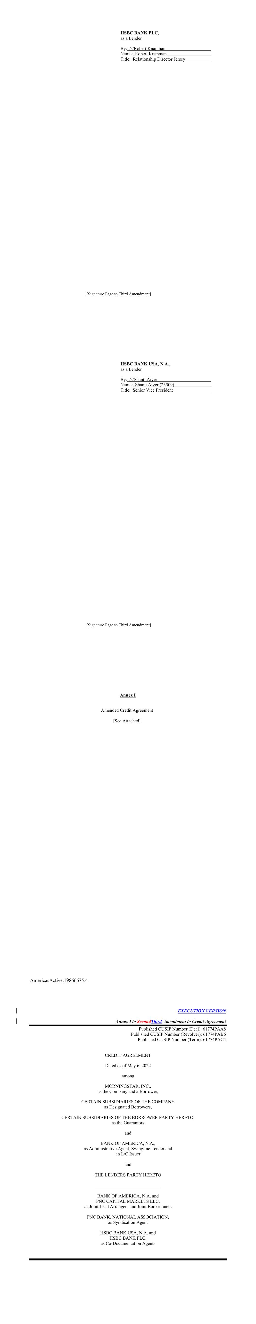 [Signature Page to Third Amendment] HSBC BANK PLC, as a Lender By: /s/Robert Knapman Name: Robert Knapman Title: Relationship Director Jersey [Signature Page to Third Amendment] HSBC BANK USA, N.A., as a Lender By: /s/Shanti Aiyer Name: Shanti Aiyer (23509) Title: Senior Vice President Annex I Amended Credit Agreement [See Attached] AmericasActive:19866675.4 EXECUTION VERSION Annex I to SecondThird Amendment to Credit Agreement Published CUSIP Number (Deal): 61774PAA8 Published CUSIP Number (Revolver): 61774PAB6 Published CUSIP Number (Term): 61774PAC4 CREDIT AGREEMENT Dated as of May 6, 2022 among MORNINGSTAR, INC., as the Company and a Borrower, CERTAIN SUBSIDIARIES OF THE COMPANY as Designated Borrowers, CERTAIN SUBSIDIARIES OF THE BORROWER PARTY HERETO, as the Guarantors and BANK OF AMERICA, N.A., as Administrative Agent, Swingline Lender and an L/C Issuer and THE LENDERS PARTY HERETO ____________________________ BANK OF AMERICA, N.A. and PNC CAPITAL MARKETS LLC, as Joint Lead Arrangers and Joint Bookrunners PNC BANK, NATIONAL ASSOCIATION, as Syndication Agent HSBC BANK USA, N.A. and HSBC BANK PLC, as Co-Documentation Agents