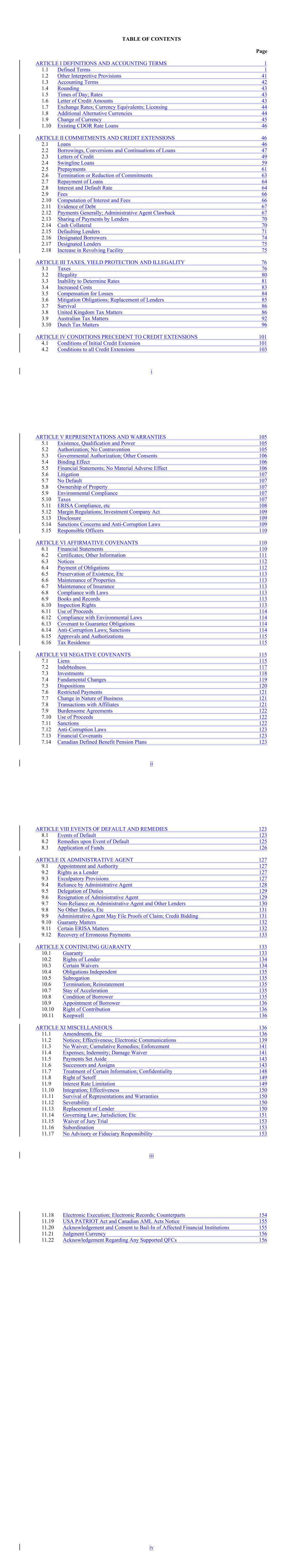 TABLE OF CONTENTS Page ARTICLE I DEFINITIONS AND ACCOUNTING TERMS 1 1.1 Defined Terms 1 1.2 Other Interpretive Provisions 41 1.3 Accounting Terms 42 1.4 Rounding 43 1.5 Times of Day; Rates 43 1.6 Letter of Credit Amounts 43 1.7 Exchange Rates; Currency Equivalents; Licensing 44 1.8 Additional Alternative Currencies 44 1.9 Change of Currency 45 1.10 Existing CDOR Rate Loans 46 ARTICLE II COMMITMENTS AND CREDIT EXTENSIONS 46 2.1 Loans 46 2.2 Borrowings, Conversions and Continuations of Loans 47 2.3 Letters of Credit 49 2.4 Swingline Loans 59 2.5 Prepayments 61 2.6 Termination or Reduction of Commitments 63 2.7 Repayment of Loans 64 2.8 Interest and Default Rate 64 2.9 Fees 66 2.10 Computation of Interest and Fees 66 2.11 Evidence of Debt 67 2.12 Payments Generally; Administrative Agent Clawback 67 2.13 Sharing of Payments by Lenders 70 2.14 Cash Collateral 70 2.15 Defaulting Lenders 71 2.16 Designated Borrowers 74 2.17 Designated Lenders 75 2.18 Increase in Revolving Facility 75 ARTICLE III TAXES, YIELD PROTECTION AND ILLEGALITY 76 3.1 Taxes 76 3.2 Illegality 80 3.3 Inability to Determine Rates 81 3.4 Increased Costs 83 3.5 Compensation for Losses 84 3.6 Mitigation Obligations; Replacement of Lenders 85 3.7 Survival 86 3.8 United Kingdom Tax Matters 86 3.9 Australian Tax Matters 92 3.10 Dutch Tax Matters 96 ARTICLE IV CONDITIONS PRECEDENT TO CREDIT EXTENSIONS 101 4.1 Conditions of Initial Credit Extension 101 4.2 Conditions to all Credit Extensions 103 i ARTICLE V REPRESENTATIONS AND WARRANTIES 105 5.1 Existence, Qualification and Power 105 5.2 Authorization; No Contravention 105 5.3 Governmental Authorization; Other Consents 106 5.4 Binding Effect 106 5.5 Financial Statements; No Material Adverse Effect 106 5.6 Litigation 107 5.7 No Default 107 5.8 Ownership of Property 107 5.9 Environmental Compliance 107 5.10 Taxes 107 5.11 ERISA Compliance, etc 108 5.12 Margin Regulations; Investment Company Act 109 5.13 Disclosure 109 5.14 Sanctions Concerns and Anti-Corruption Laws 109 5.15 Responsible Officers 110 ARTICLE VI AFFIRMATIVE COVENANTS 110 6.1 Financial Statements 110 6.2 Certificates; Other Information 111 6.3 Notices 112 6.4 Payment of Obligations 112 6.5 Preservation of Existence, Etc 113 6.6 Maintenance of Properties 113 6.7 Maintenance of Insurance 113 6.8 Compliance with Laws 113 6.9 Books and Records 113 6.10 Inspection Rights 113 6.11 Use of Proceeds 114 6.12 Compliance with Environmental Laws 114 6.13 Covenant to Guarantee Obligations 114 6.14 Anti-Corruption Laws; Sanctions 114 6.15 Approvals and Authorizations 115 6.16 Tax Residence 115 ARTICLE VII NEGATIVE COVENANTS 115 7.1 Liens 115 7.2 Indebtedness 117 7.3 Investments 118 7.4 Fundamental Changes 119 7.5 Dispositions 120 7.6 Restricted Payments 121 7.7 Change in Nature of Business 121 7.8 Transactions with Affiliates 121 7.9 Burdensome Agreements 122 7.10 Use of Proceeds 122 7.11 Sanctions 122 7.12 Anti-Corruption Laws 123 7.13 Financial Covenants 123 7.14 Canadian Defined Benefit Pension Plans 123 ii ARTICLE VIII EVENTS OF DEFAULT AND REMEDIES 123 8.1 Events of Default 123 8.2 Remedies upon Event of Default 125 8.3 Application of Funds 126 ARTICLE IX ADMINISTRATIVE AGENT 127 9.1 Appointment and Authority 127 9.2 Rights as a Lender 127 9.3 Exculpatory Provisions 127 9.4 Reliance by Administrative Agent 128 9.5 Delegation of Duties 129 9.6 Resignation of Administrative Agent 129 9.7 Non-Reliance on Administrative Agent and Other Lenders 130 9.8 No Other Duties, Etc 131 9.9 Administrative Agent May File Proofs of Claim; Credit Bidding 131 9.10 Guaranty Matters 132 9.11 Certain ERISA Matters 132 9.12 Recovery of Erroneous Payments 133 ARTICLE X CONTINUING GUARANTY 133 10.1 Guaranty 133 10.2 Rights of Lender 134 10.3 Certain Waivers 134 10.4 Obligations Independent 135 10.5 Subrogation 135 10.6 Termination; Reinstatement 135 10.7 Stay of Acceleration 135 10.8 Condition of Borrower 135 10.9 Appointment of Borrower 136 10.10 Right of Contribution 136 10.11 Keepwell 136 ARTICLE XI MISCELLANEOUS 136 11.1 Amendments, Etc 136 11.2 Notices; Effectiveness; Electronic Communications 139 11.3 No Waiver; Cumulative Remedies; Enforcement 141 11.4 Expenses; Indemnity; Damage Waiver 141 11.5 Payments Set Aside 143 11.6 Successors and Assigns 143 11.7 Treatment of Certain Information; Confidentiality 148 11.8 Right of Setoff 149 11.9 Interest Rate Limitation 149 11.10 Integration; Effectiveness 150 11.11 Survival of Representations and Warranties 150 11.12 Severability 150 11.13 Replacement of Lender 150 11.14 Governing Law; Jurisdiction; Etc 151 11.15 Waiver of Jury Trial 153 11.16 Subordination 153 11.17 No Advisory or Fiduciary Responsibility 153 iii 11.18 Electronic Execution; Electronic Records; Counterparts 154 11.19 USA PATRIOT Act and Canadian AML Acts Notice 155 11.20 Acknowledgement and Consent to Bail-In of Affected Financial Institutions 155 11.21 Judgment Currency 156 11.22 Acknowledgement Regarding Any Supported QFCs 156 iv