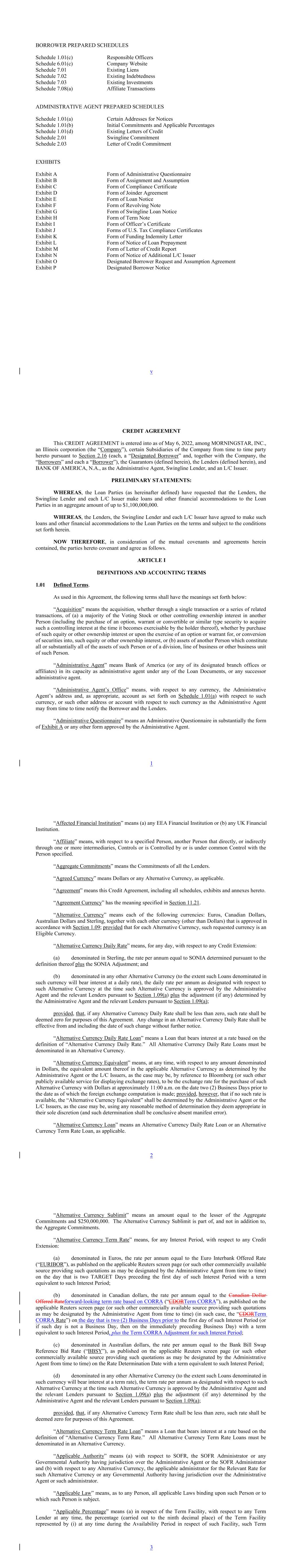 BORROWER PREPARED SCHEDULES Schedule 1.01(c) Responsible Officers Schedule 6.01(c) Company Website Schedule 7.01 Existing Liens Schedule 7.02 Existing Indebtedness Schedule 7.03 Existing Investments Schedule 7.08(a) Affiliate Transactions ADMINISTRATIVE AGENT PREPARED SCHEDULES Schedule 1.01(a) Certain Addresses for Notices Schedule 1.01(b) Initial Commitments and Applicable Percentages Schedule 1.01(d) Existing Letters of Credit Schedule 2.01 Swingline Commitment Schedule 2.03 Letter of Credit Commitment EXHIBITS Exhibit A Form of Administrative Questionnaire Exhibit B Form of Assignment and Assumption Exhibit C Form of Compliance Certificate Exhibit D Form of Joinder Agreement Exhibit E Form of Loan Notice Exhibit F Form of Revolving Note Exhibit G Form of Swingline Loan Notice Exhibit H Form of Term Note Exhibit I Form of Officer’s Certificate Exhibit J Forms of U.S. Tax Compliance Certificates Exhibit K Form of Funding Indemnity Letter Exhibit L Form of Notice of Loan Prepayment Exhibit M Form of Letter of Credit Report Exhibit N Form of Notice of Additional L/C Issuer Exhibit O Designated Borrower Request and Assumption Agreement Exhibit P Designated Borrower Notice v CREDIT AGREEMENT This CREDIT AGREEMENT is entered into as of May 6, 2022, among MORNINGSTAR, INC., an Illinois corporation (the “Company”), certain Subsidiaries of the Company from time to time party hereto pursuant to Section 2.16 (each, a “Designated Borrower” and, together with the Company, the “Borrowers” and each a “Borrower”), the Guarantors (defined herein), the Lenders (defined herein), and BANK OF AMERICA, N.A., as the Administrative Agent, Swingline Lender, and an L/C Issuer. PRELIMINARY STATEMENTS: WHEREAS, the Loan Parties (as hereinafter defined) have requested that the Lenders, the Swingline Lender and each L/C Issuer make loans and other financial accommodations to the Loan Parties in an aggregate amount of up to $1,100,000,000. WHEREAS, the Lenders, the Swingline Lender and each L/C Issuer have agreed to make such loans and other financial accommodations to the Loan Parties on the terms and subject to the conditions set forth herein. NOW THEREFORE, in consideration of the mutual covenants and agreements herein contained, the parties hereto covenant and agree as follows. ARTICLE I DEFINITIONS AND ACCOUNTING TERMS 1.01 Defined Terms. As used in this Agreement, the following terms shall have the meanings set forth below: “Acquisition” means the acquisition, whether through a single transaction or a series of related transactions, of (a) a majority of the Voting Stock or other controlling ownership interest in another Person (including the purchase of an option, warrant or convertible or similar type security to acquire such a controlling interest at the time it becomes exercisable by the holder thereof), whether by purchase of such equity or other ownership interest or upon the exercise of an option or warrant for, or conversion of securities into, such equity or other ownership interest, or (b) assets of another Person which constitute all or substantially all of the assets of such Person or of a division, line of business or other business unit of such Person. “Administrative Agent” means Bank of America (or any of its designated branch offices or affiliates) in its capacity as administrative agent under any of the Loan Documents, or any successor administrative agent. “Administrative Agent’s Office” means, with respect to any currency, the Administrative Agent’s address and, as appropriate, account as set forth on Schedule 1.01(a) with respect to such currency, or such other address or account with respect to such currency as the Administrative Agent may from time to time notify the Borrower and the Lenders. “Administrative Questionnaire” means an Administrative Questionnaire in substantially the form of Exhibit A or any other form approved by the Administrative Agent. 1 “Affected Financial Institution” means (a) any EEA Financial Institution or (b) any UK Financial Institution. “Affiliate” means, with respect to a specified Person, another Person that directly, or indirectly through one or more intermediaries, Controls or is Controlled by or is under common Control with the Person specified. “Aggregate Commitments” means the Commitments of all the Lenders. “Agreed Currency” means Dollars or any Alternative Currency, as applicable. “Agreement” means this Credit Agreement, including all schedules, exhibits and annexes hereto. “Agreement Currency” has the meaning specified in Section 11.21. “Alternative Currency” means each of the following currencies: Euros, Canadian Dollars, Australian Dollars and Sterling, together with each other currency (other than Dollars) that is approved in accordance with Section 1.09; provided that for each Alternative Currency, such requested currency is an Eligible Currency. “Alternative Currency Daily Rate” means, for any day, with respect to any Credit Extension: (a) denominated in Sterling, the rate per annum equal to SONIA determined pursuant to the definition thereof plus the SONIA Adjustment; and (b) denominated in any other Alternative Currency (to the extent such Loans denominated in such currency will bear interest at a daily rate), the daily rate per annum as designated with respect to such Alternative Currency at the time such Alternative Currency is approved by the Administrative Agent and the relevant Lenders pursuant to Section 1.09(a) plus the adjustment (if any) determined by the Administrative Agent and the relevant Lenders pursuant to Section 1.09(a); provided, that, if any Alternative Currency Daily Rate shall be less than zero, such rate shall be deemed zero for purposes of this Agreement. Any change in an Alternative Currency Daily Rate shall be effective from and including the date of such change without further notice. “Alternative Currency Daily Rate Loan” means a Loan that bears