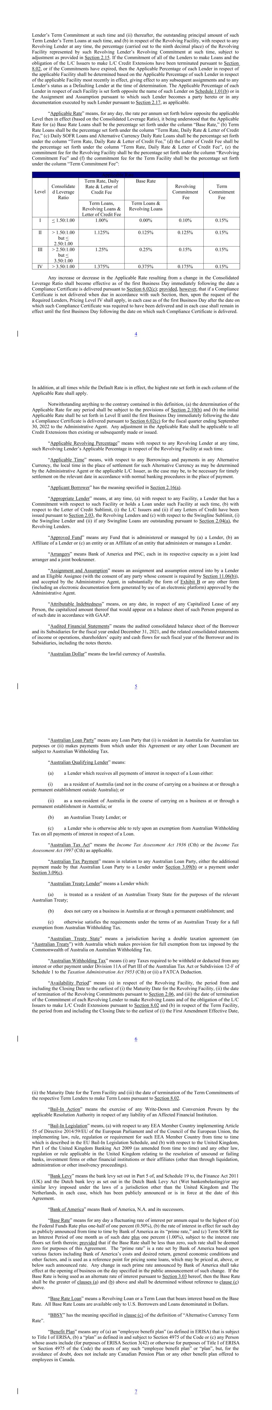 4 Term Commitment Fee 0.10% 0.15% II > 1.50:1.00 but < 2.50:1.00 Level 1.125% 0.125% 0.125% Term Loans, Revolving Loans & Letter of Credit Fee 0.15% Consolidate d Leverage Ratio Term Loans & Revolving Loans III Applicable Rate > 2.50:1.00 but < 3.50:1.00 1.25% Term Rate, Daily Rate & Letter of Credit Fee 0.25% 0.15% 0.15% Base Rate IV I > 3.50:1.00 1.375% < 1.50:1.00 0.375% Revolving Commitment Fee 0.175% 1.00% 0.15% Lender’s Term Commitment at such time and (ii) thereafter, the outstanding principal amount of such Term Lender’s Term Loans at such time, and (b) in respect of the Revolving Facility, with respect to any Revolving Lender at any time, the percentage (carried out to the ninth decimal place) of the Revolving Facility represented by such Revolving Lender’s Revolving Commitment at such time, subject to adjustment as provided in Section 2.15. If the Commitment of all of the Lenders to make Loans and the obligation of the L/C Issuers to make L/C Credit Extensions have been terminated pursuant to Section 8.02, or if the Commitments have expired, then the Applicable Percentage of each Lender in respect of the applicable Facility shall be determined based on the Applicable Percentage of such Lender in respect of the applicable Facility most recently in effect, giving effect to any subsequent assignments and to any Lender’s status as a Defaulting Lender at the time of determination. The Applicable Percentage of each Lender in respect of each Facility is set forth opposite the name of such Lender on Schedule 1.01(b) or in the Assignment and Assumption pursuant to which such Lender becomes a party hereto or in any documentation executed by such Lender pursuant to Section 2.17, as applicable. “Applicable Rate” means, for any day, the rate per annum set forth below opposite the applicable Level then in effect (based on the Consolidated Leverage Ratio), it being understood that the Applicable Rate for (a) Base Rate Loans shall be the percentage set forth under the column “Base Rate,” (b) Term Rate Loans shall be the percentage set forth under the column “Term Rate, Daily Rate & Letter of Credit Fee,” (c) Daily SOFR Loans and Alternative Currency Daily Rate Loans shall be the percentage set forth under the column “Term Rate, Daily Rate & Letter of Credit Fee,” (d) the Letter of Credit Fee shall be the percentage set forth under the column “Term Rate, Daily Rate & Letter of Credit Fee”, (e) the commitment fee for the Revolving Facility shall be the percentage set forth under the column “Revolving Commitment Fee” and (f) the commitment fee for the Term Facility shall be the percentage set forth under the column “Term Commitment Fee”: Any increase or decrease in the Applicable Rate resulting from a change in the Consolidated Leverage Ratio shall become effective as of the first Business Day immediately following the date a Compliance Certificate is delivered pursuant to Section 6.02(c); provided, however, that if a Compliance Certificate is not delivered when due in accordance with such Section, then, upon the request of the Required Lenders, Pricing Level IV shall apply, in each case as of the first Business Day after the date on which such Compliance Certificate was required to have been delivered and in each case shall remain in effect until the first Business Day following the date on which such Compliance Certificate is delivered. 0.00% In addition, at all times while the Default Rate is in effect, the highest rate set forth in each column of the Applicable Rate shall apply. Notwithstanding anything to the contrary contained in this definition, (a) the determination of the Applicable Rate for any period shall be subject to the provisions of Section 2.10(b) and (b) the initial Applicable Rate shall be set forth in Level II until the first Business Day immediately following the date a Compliance Certificate is delivered pursuant to Section 6.02(c) for the fiscal quarter ending September 30, 2022 to the Administrative Agent. Any adjustment in the Applicable Rate shall be applicable to all Credit Extensions then existing or subsequently made or issued. “Applicable Revolving Percentage” means with respect to any Revolving Lender at any time, such Revolving Lender’s Applicable Percentage in respect of the Revolving Facility at such time. “Applicable Time” means, with respect to any Borrowings and payments in any Alternative Currency, the local time in the place of settlement for such Alternative Currency as may be determined by the Administrative Agent or the applicable L/C Issuer, as the case may be, to be necessary for timely settlement on the relevant date in accordance with normal banking procedures in the place of payment. “Applicant Borrower” has the meaning specified in Section 2.16(a). “Appropriate Lender” means, at any time, (a) with respect to any Facility, a Lender that has a Commitment with respect to such Facility or holds a Loan under such Facility at such time, (b) with respect to the Letter of Credit Sublimit, (i) the L/C Issuers and (ii) if any Letters of Credit have been issued pursuant to Section 2.03, the Revolving Lenders and (c) with respect to the Swingline Sublimit, (i) the Swingline Lender and (ii) if any Swingline Loans are outstanding pursuant to Section 2.04(a), the Revolving Lenders. “Approved Fund” means any Fund that is administered or managed by (a) a Lender, (b) an Affiliate of a Lender or (c) an entity or an Affiliate of an entity that administers or manages a Lender. “Arrangers” means Bank of America and PNC, each in its respective capacity as a joint lead arranger and a joint bookrunner. “Assignment and Assumption” means an assignment and assumption entered into by a Lender and an Eligible Assignee (with the consent of any party whose consent is required by Section 11.06(b)), and accepted by the Administrative Agent, in substantially the form of Exhibit B or any other form (including an electro
